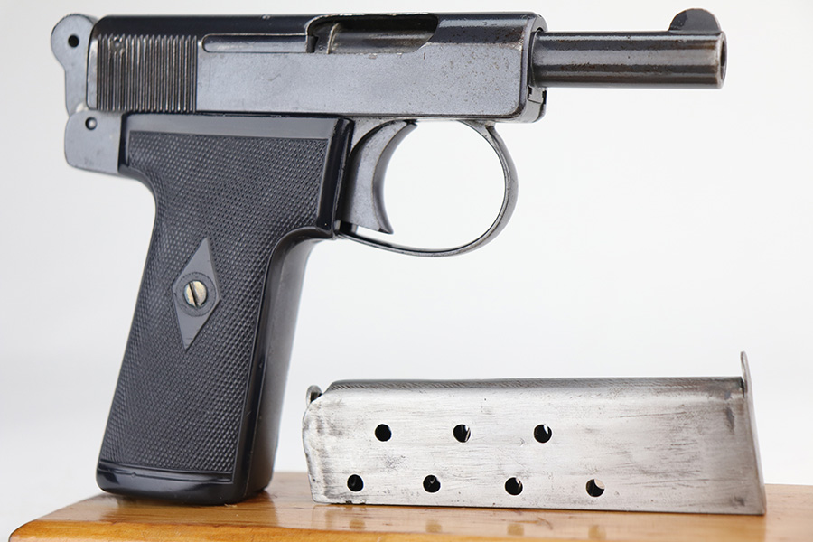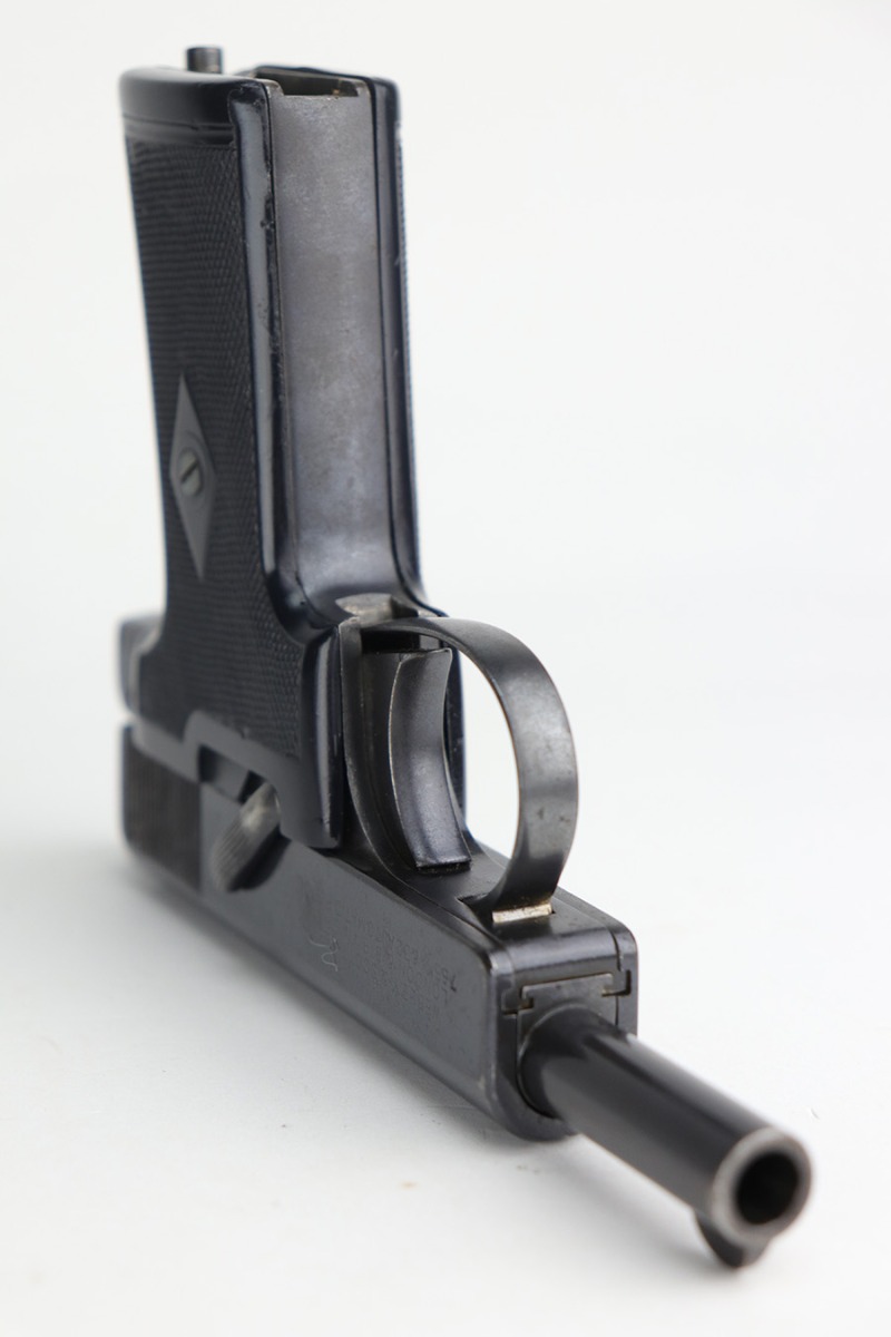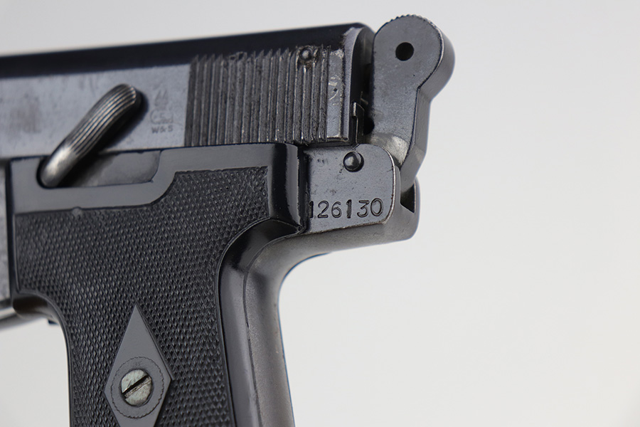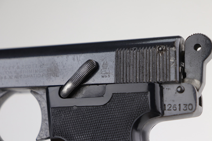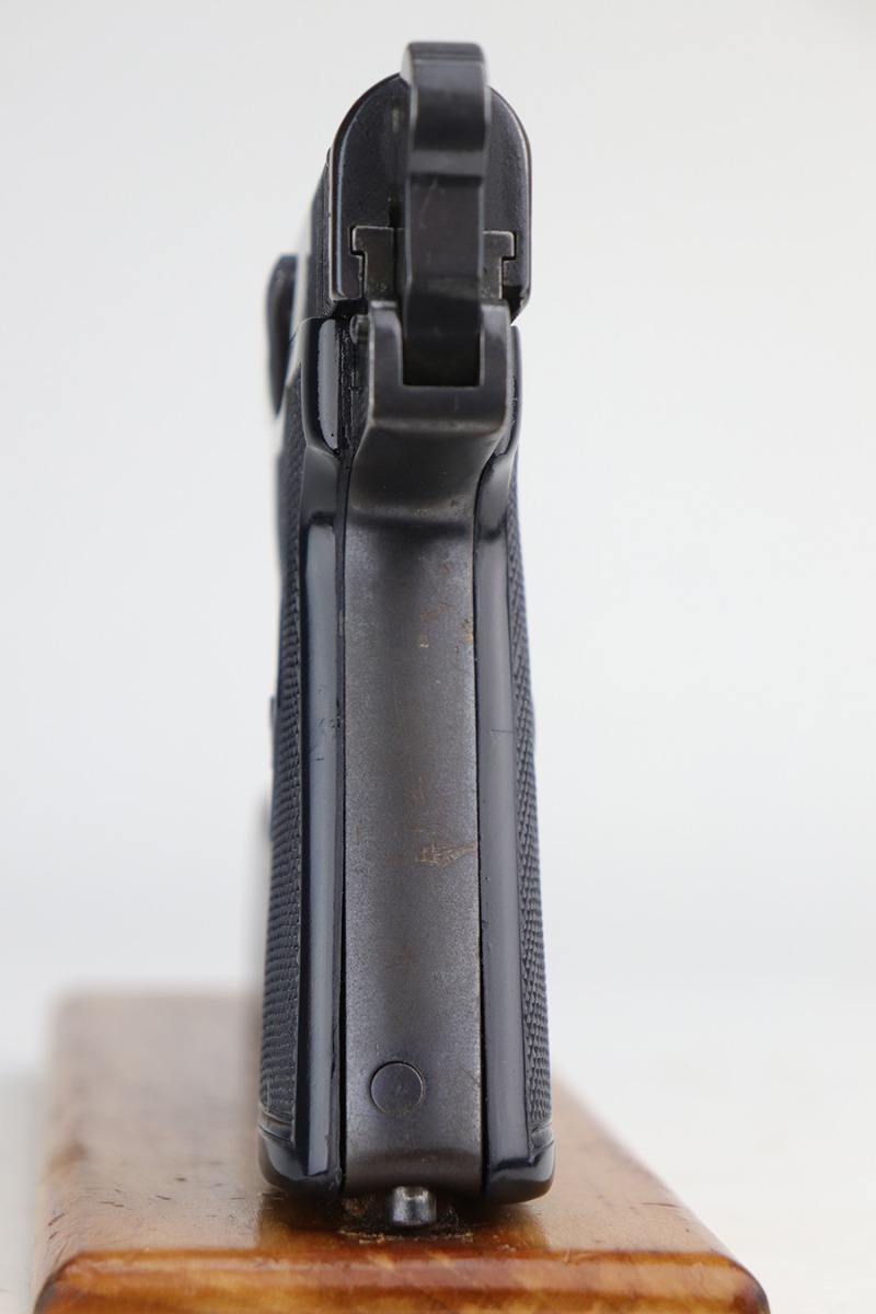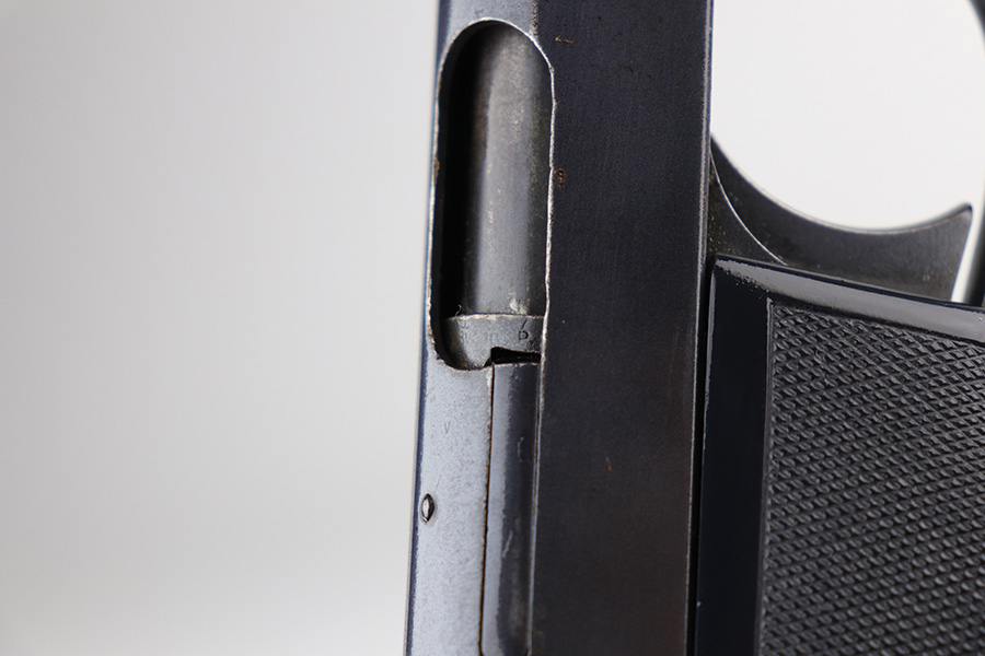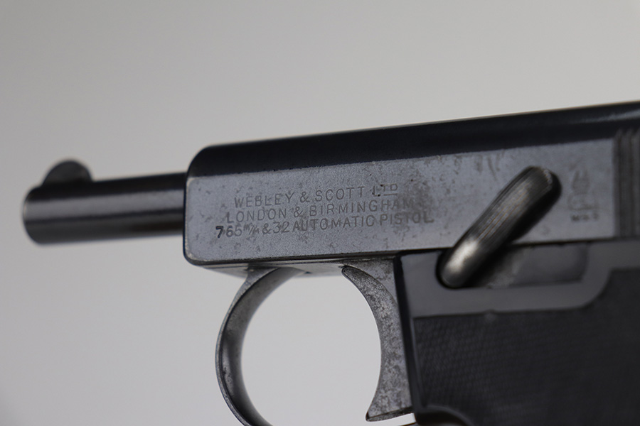 10/7/21 – This is a nice example of a 1920s era Webley & Scott model 1908. It doesn’t have much actual finish loss to the original bluing, mostly minor high edge thinning, but there is some surface oxidation on most of the metal surfaces. The left side of the slide has the three-line legend and the “WS” winged bullet logo. The grips have a few dings but are in great shape overall. Unfortunately, the bore shows heavy use and has some pitting throughout with worn rifling.