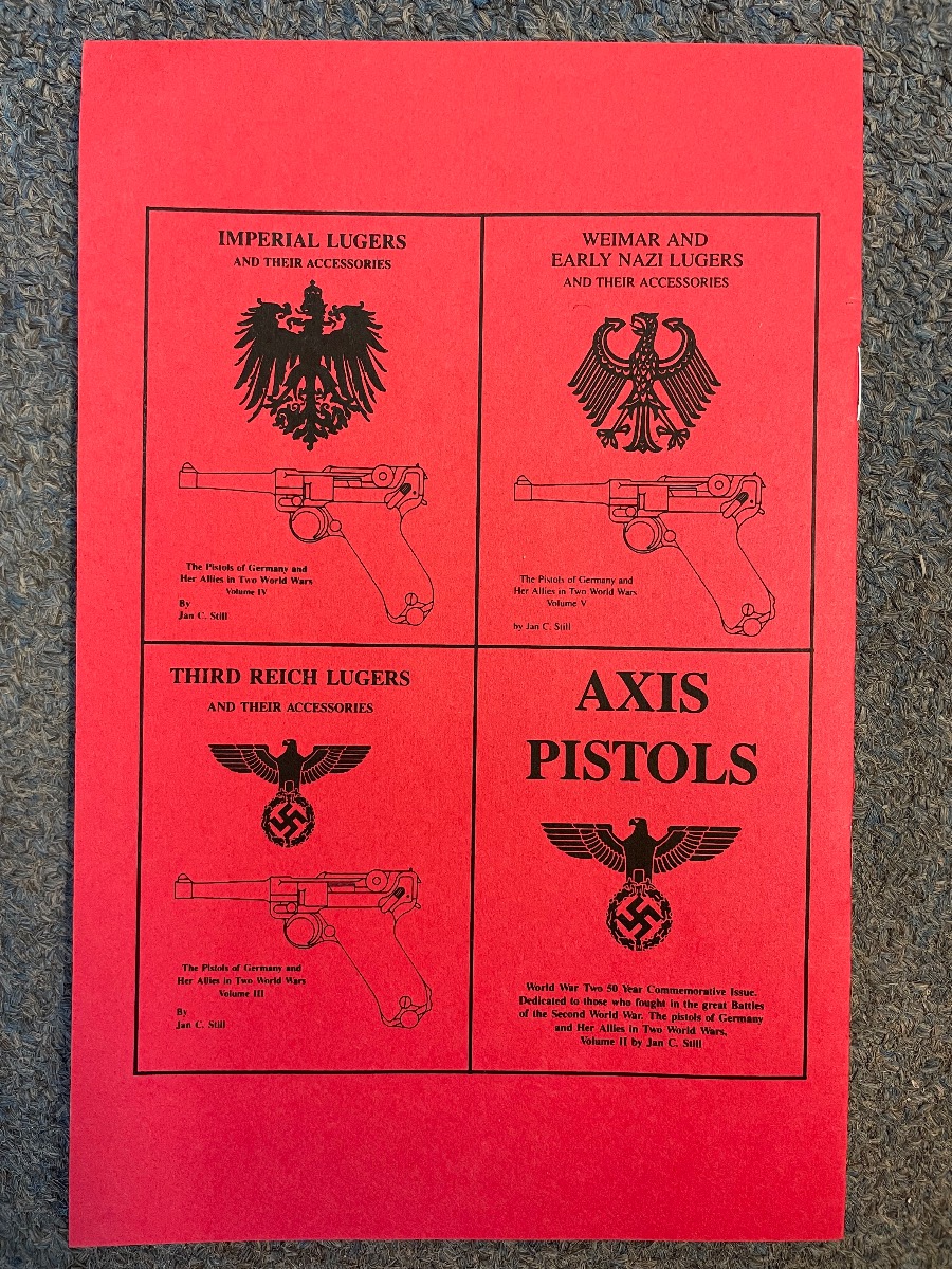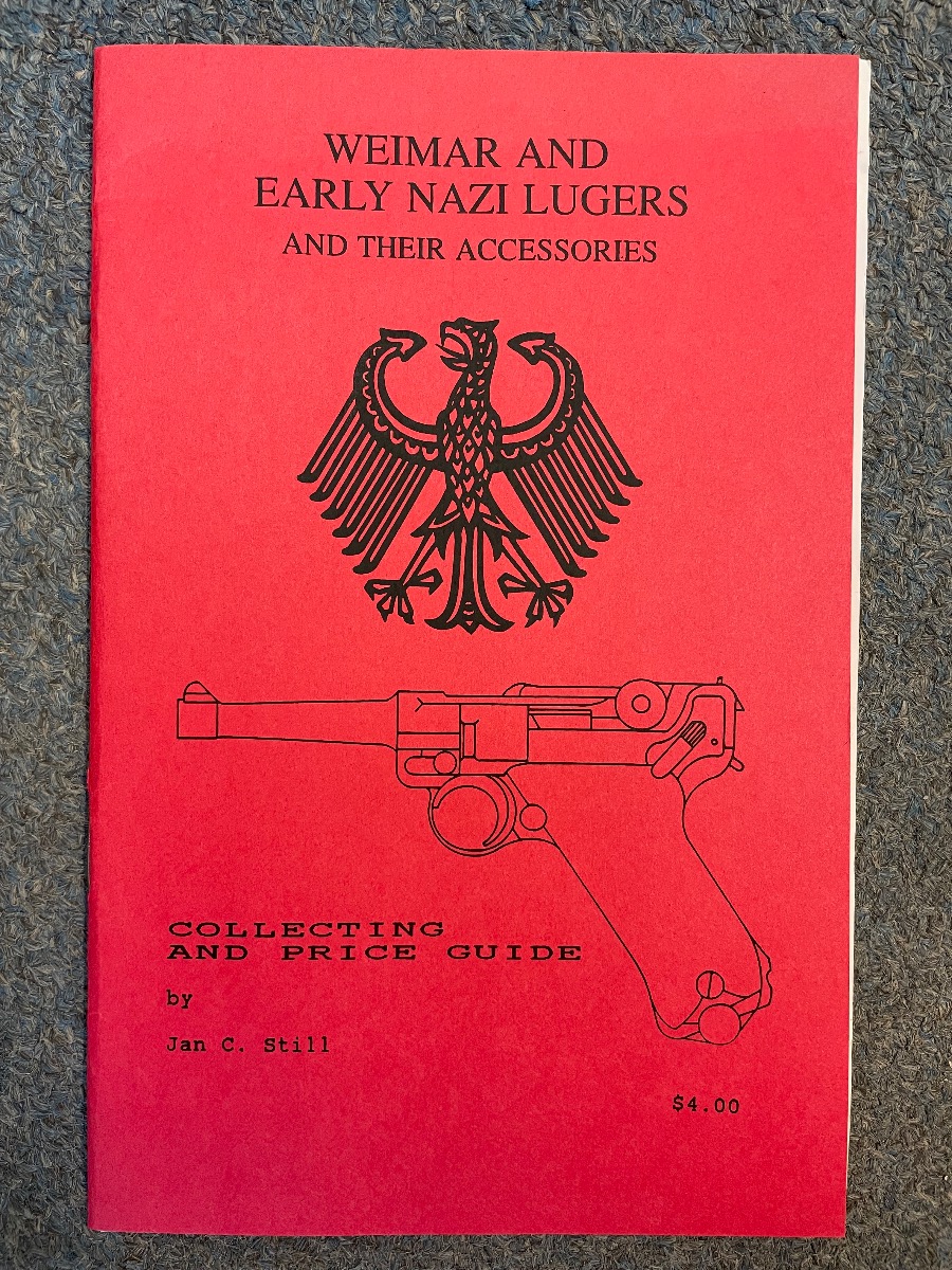 2/6/23 – This is a great condition copy of Jan C. Still’s collector resource book, “Weimar And Early Nazi Lugers And Their Accessories” Volume 5 of his series on WW2 Axis pistols. The book includes the original price guide. The hardcover exterior has some minor surface blemishes and scratches but is still in great overall condition. All interior pages are in excellent condition. Excellent WW2 Luger collector resource book.