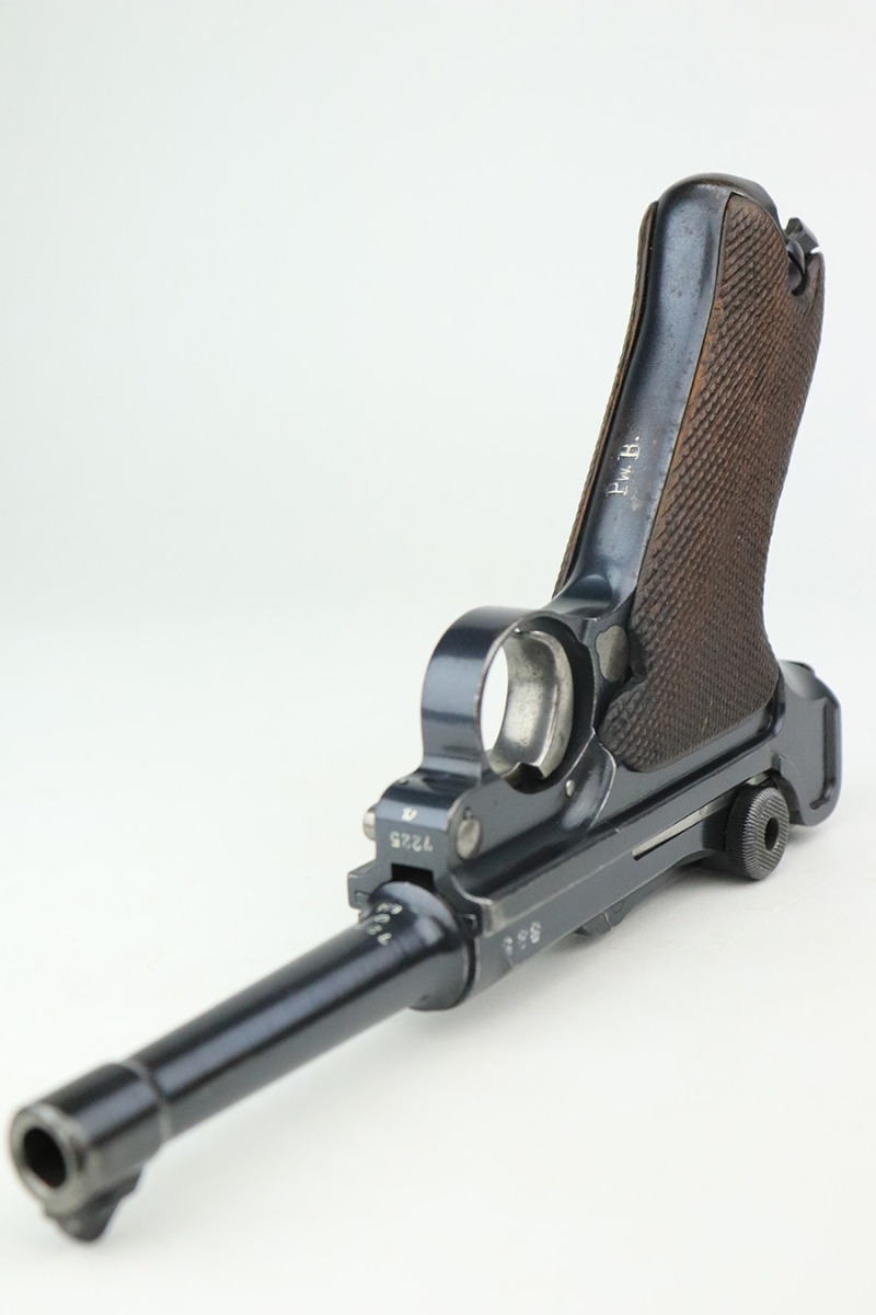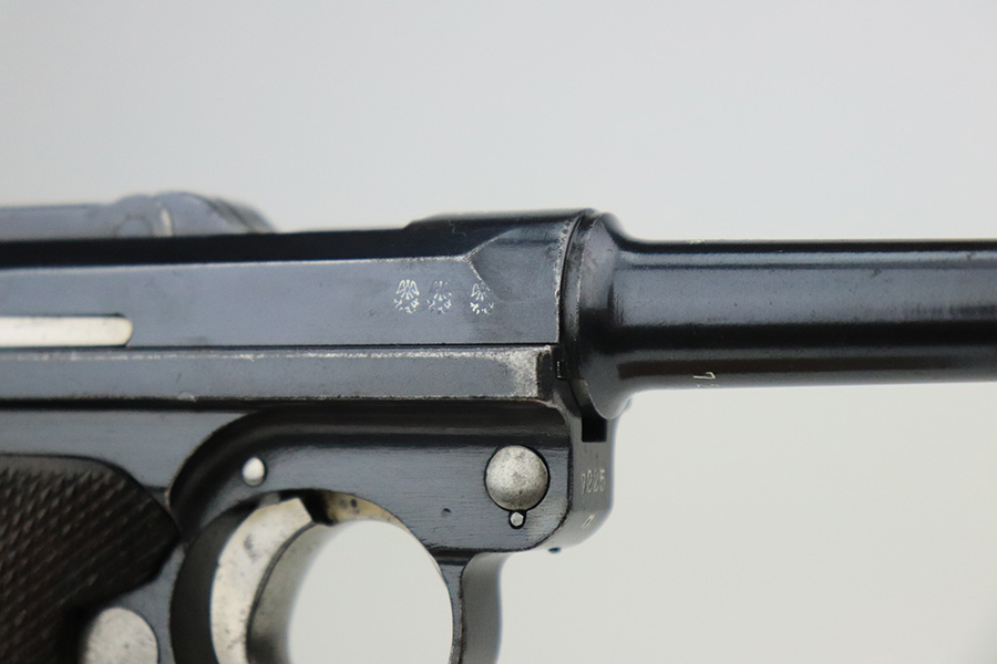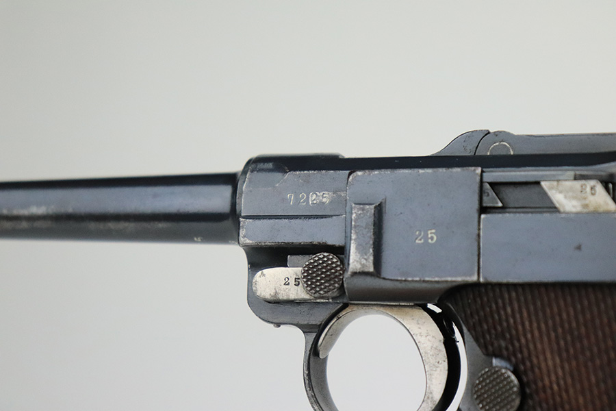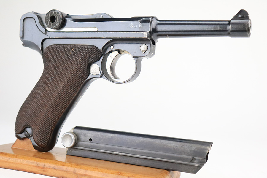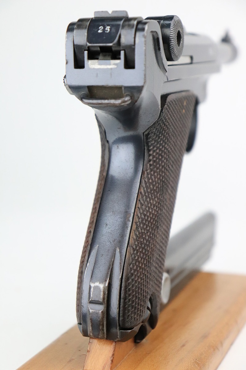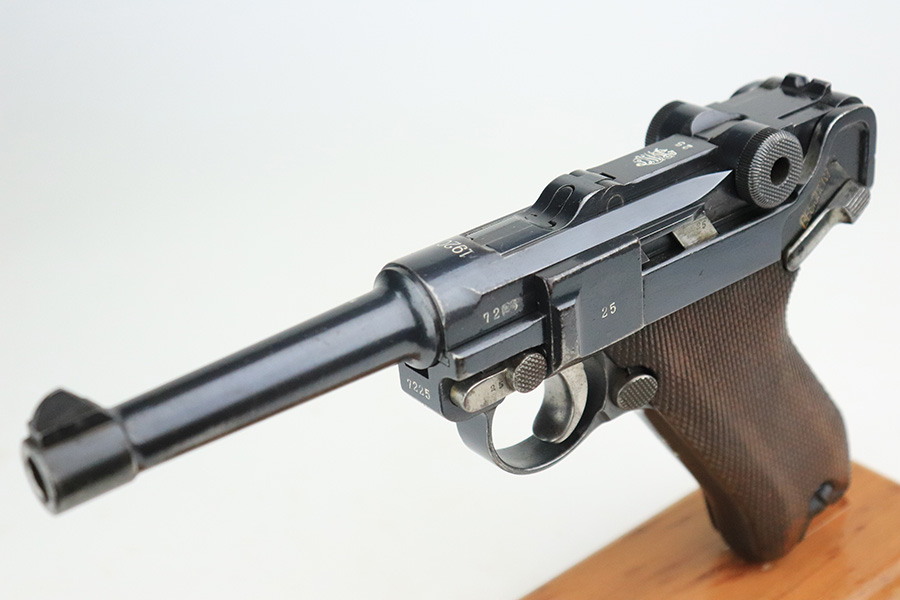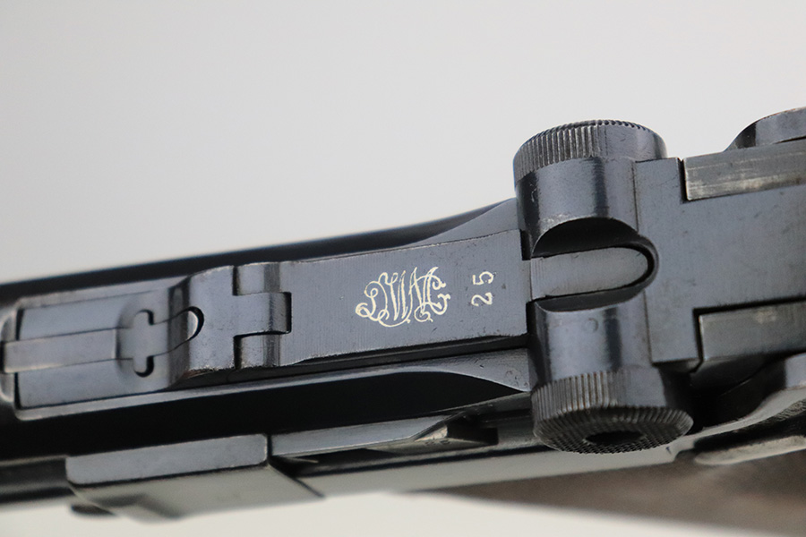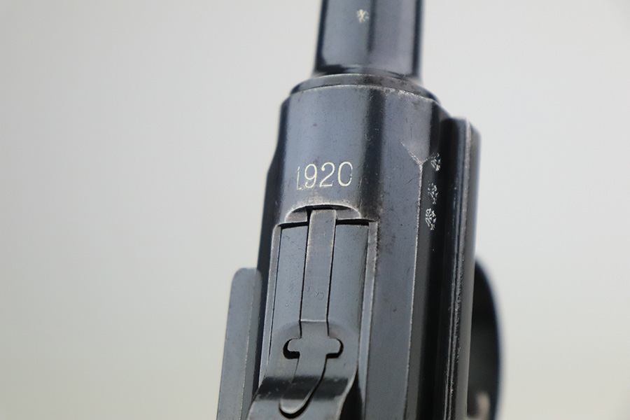 6/17/22 – This is a very nice example of a DWM Luger that was issued to the Weimar-era German police force. It is all matching, has a “1920” government property marking on the chamber, Weimar-era proofs on the right side of the slide, and has a “Pw.B.” unit marking on the front strap, indicating this gun was issued to the Polizeiwehr Bayern (Bavarian Police Defense Force). It has retained about 95-96% of its bluing. Very minor wear on the side plate, side rails, and around the muzzle. Areas of pin-pricking throughout, concentrated mostly around the high edges and on the grip straps. Comes with slightly worn un-numbered wood grips. The bore has decent rifling, but there is pin-pricking throughout. Comes with a blank bottom WW2-era magazine.