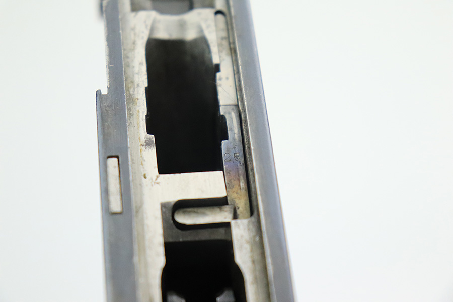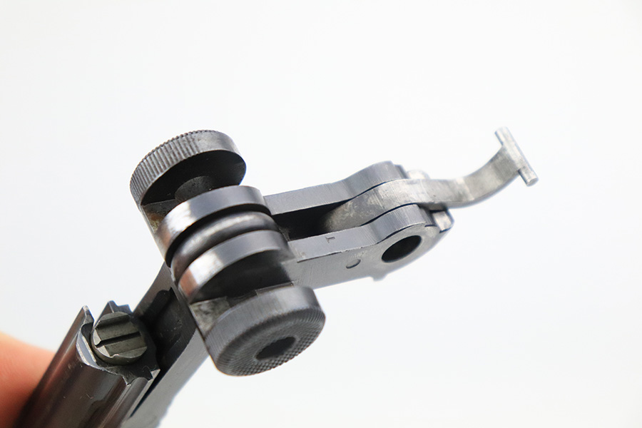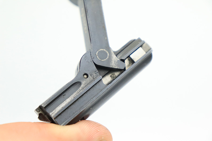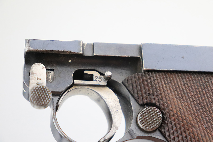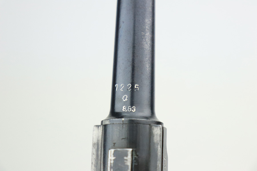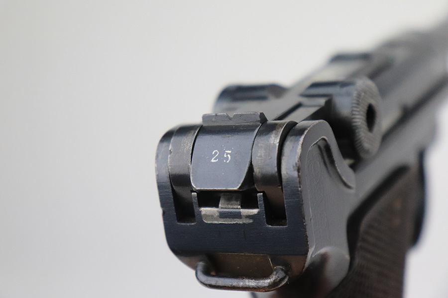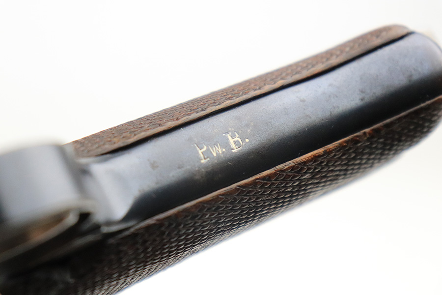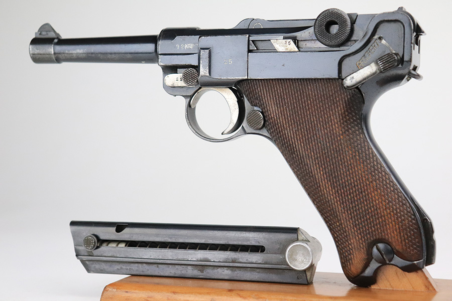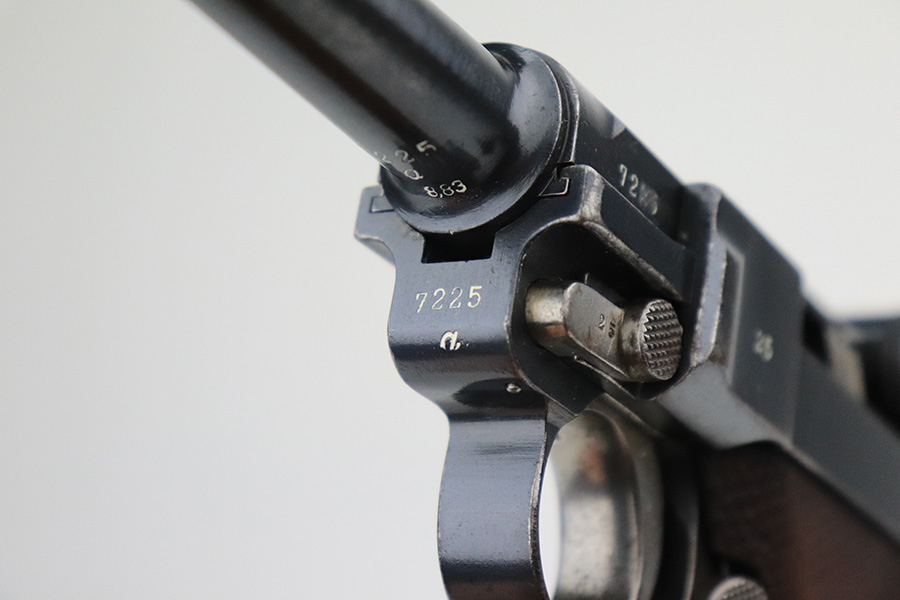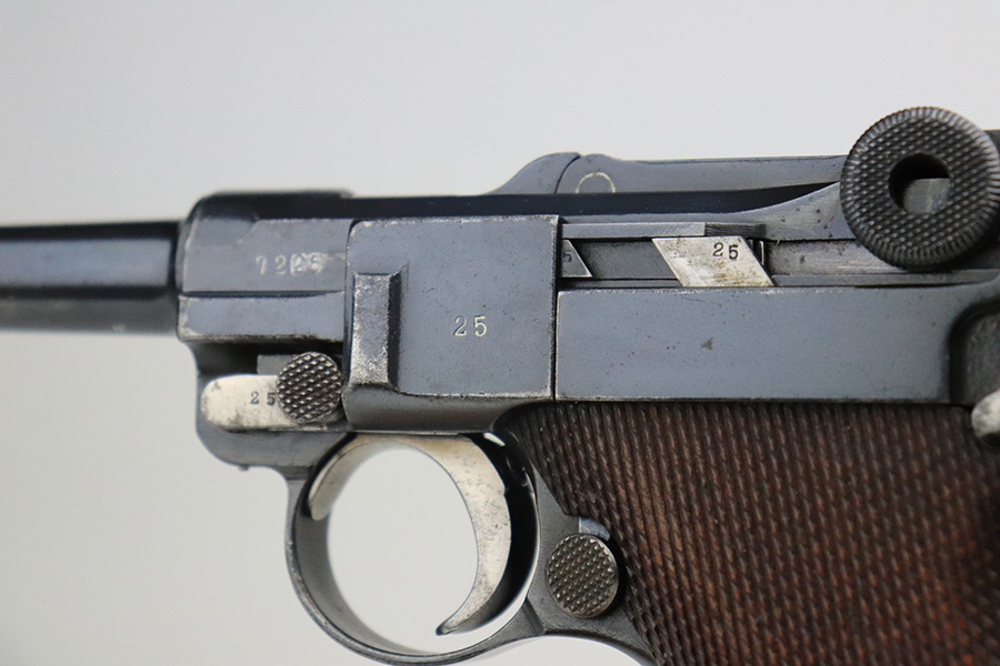 6/17/22 – This is a very nice example of a DWM Luger that was issued to the Weimar-era German police force. It is all matching, has a “1920” government property marking on the chamber, Weimar-era proofs on the right side of the slide, and has a “Pw.B.” unit marking on the front strap, indicating this gun was issued to the Polizeiwehr Bayern (Bavarian Police Defense Force). It has retained about 95-96% of its bluing. Very minor wear on the side plate, side rails, and around the muzzle. Areas of pin-pricking throughout, concentrated mostly around the high edges and on the grip straps. Comes with slightly worn un-numbered wood grips. The bore has decent rifling, but there is pin-pricking throughout. Comes with a blank bottom WW2-era magazine.