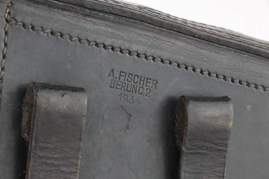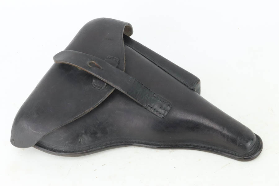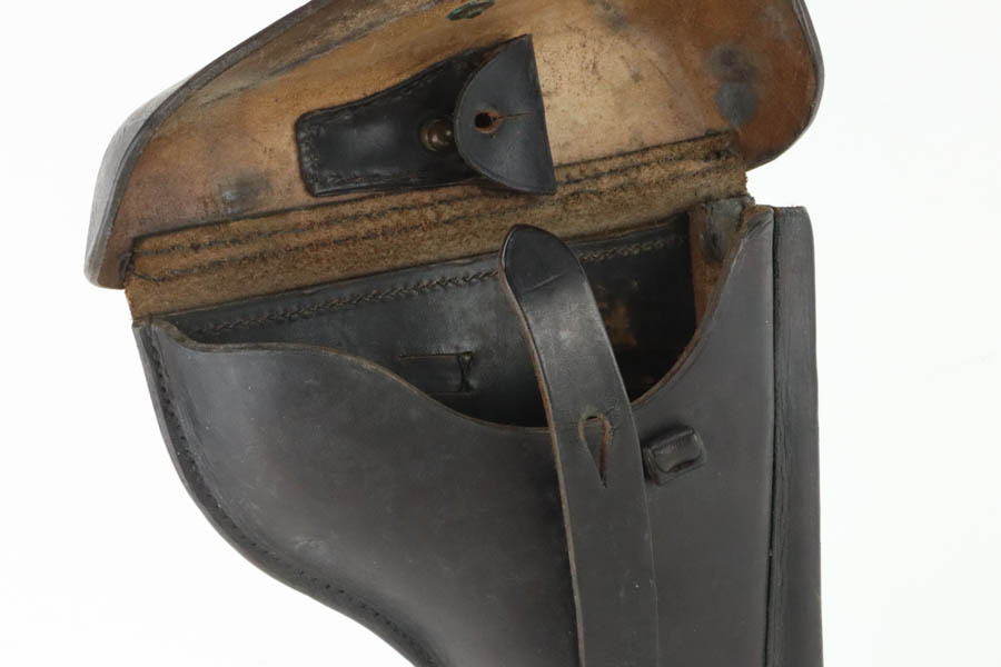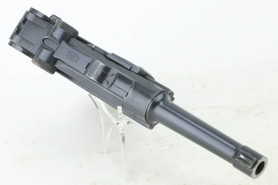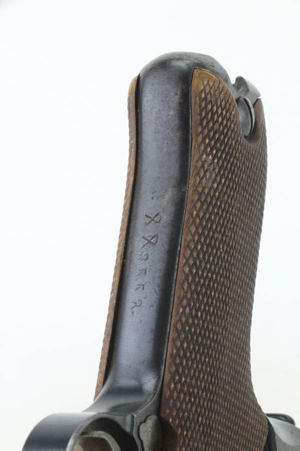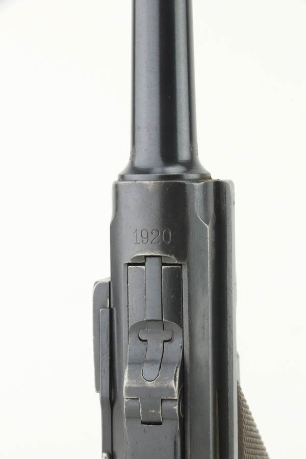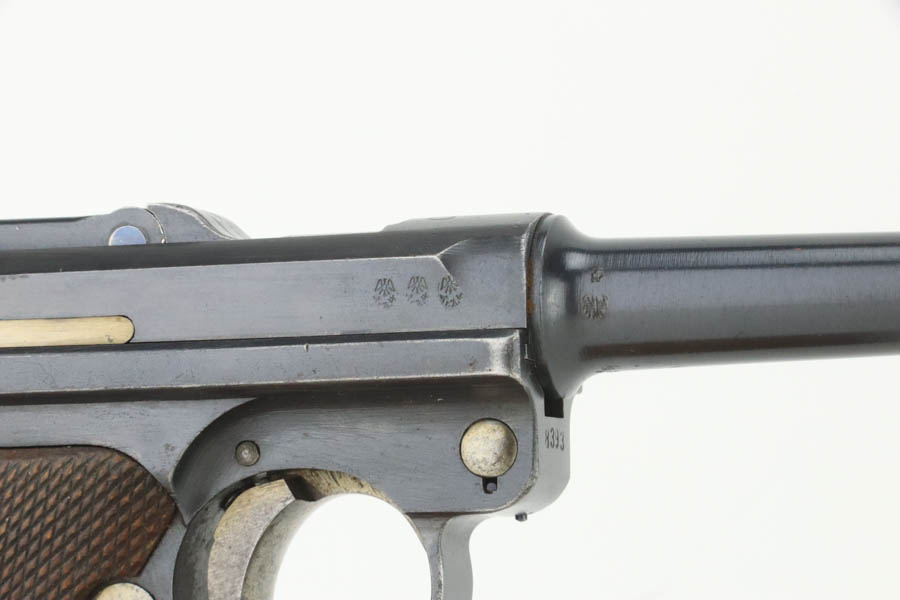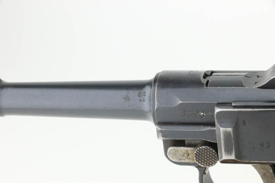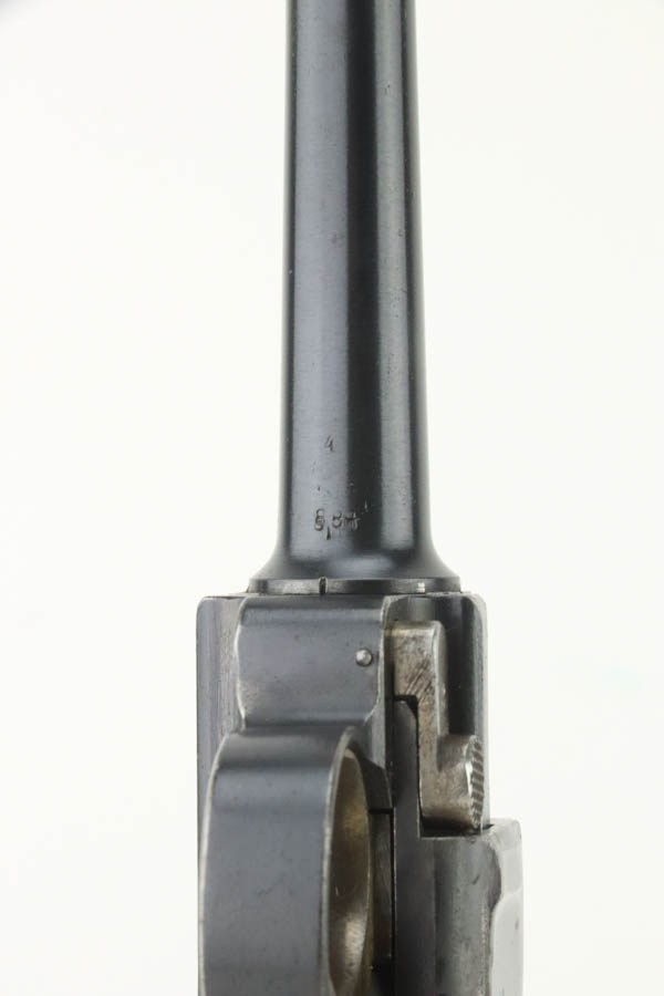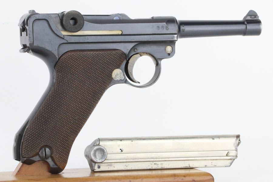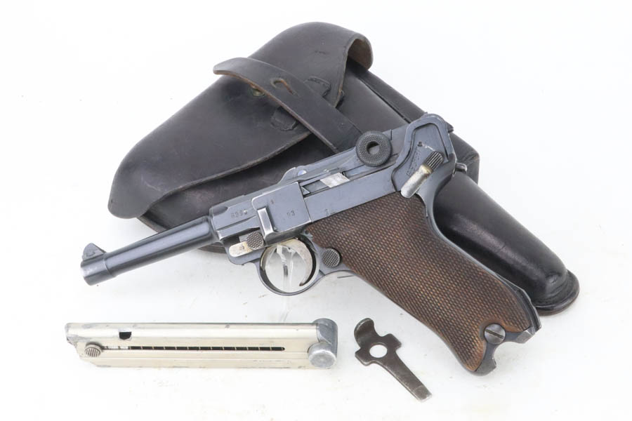 7/24/24 – This is an excellent example of a Weimar-Era DWM police Luger. There is a crossed-out police unit marking on the front strap with added police sear and magazine safeties. All matching with Weimar-Era eagle proofs on the right side of the slide. It comes as a rig with a matching-numbered “Star K” proofed police magazine, an excellent 1934-dated police holster, and a police unit-marked Luger tool (not matching). The gun’s finish rates about 96% with just minor high edge wear, minor muzzle wear, and some light patina and pin-pricking on the grip straps. Fitted with un-numbered wood grips. The bore has good rifling, but there is light pin-pricking throughout.