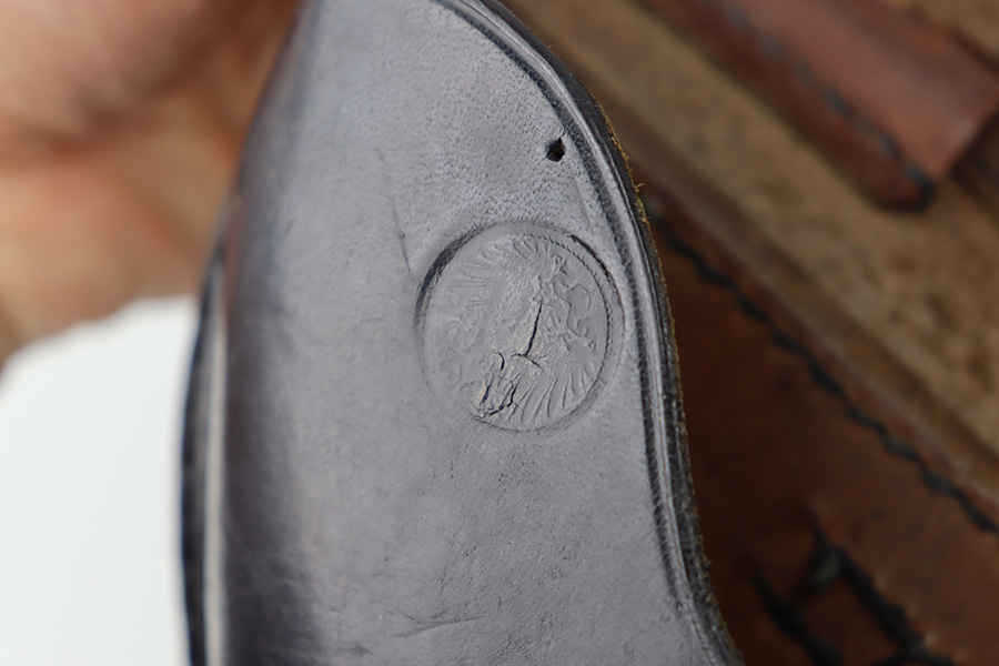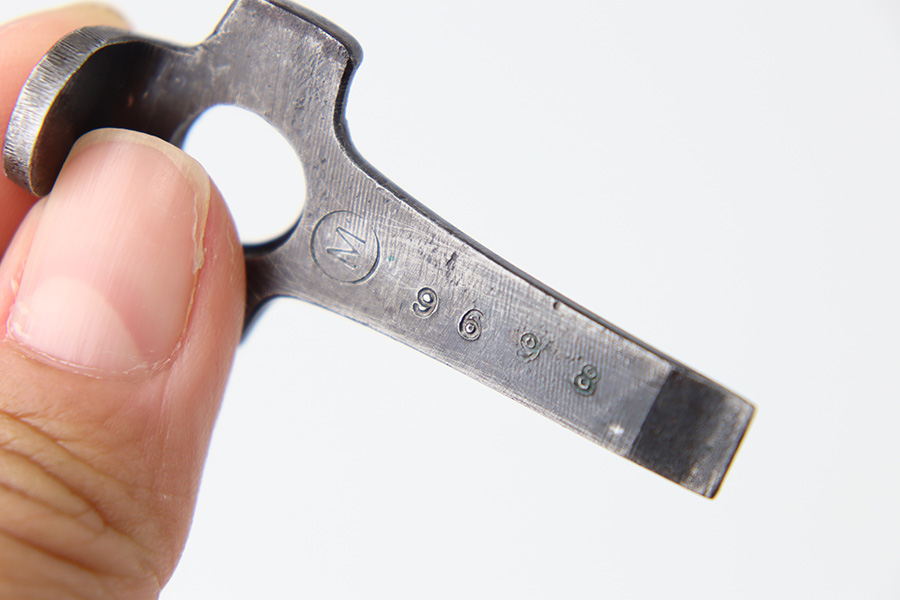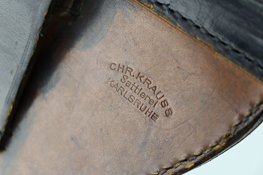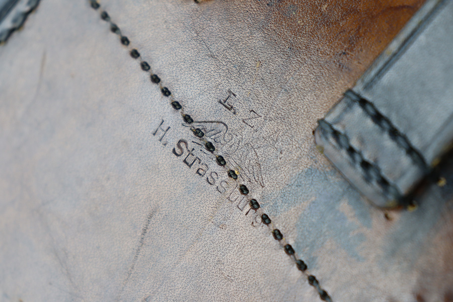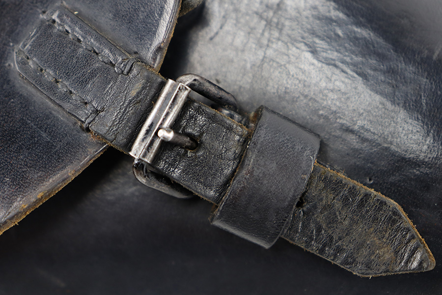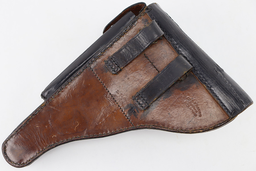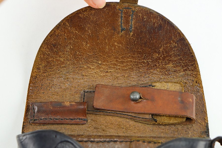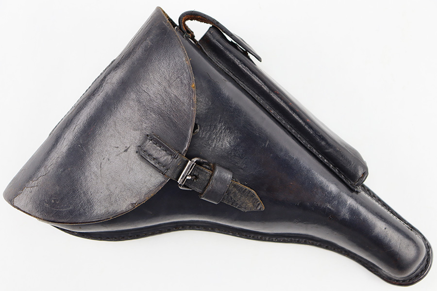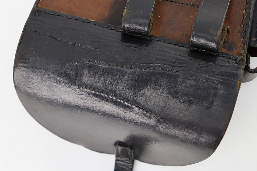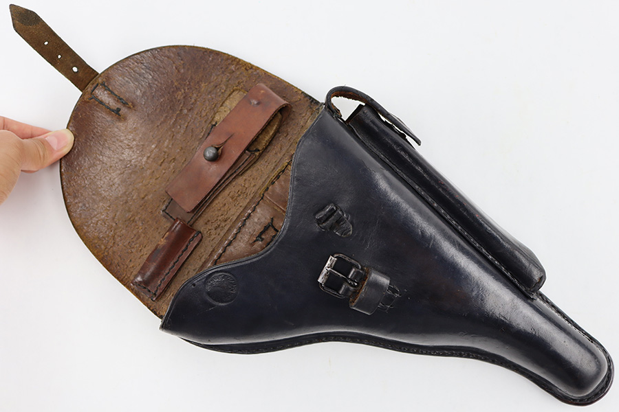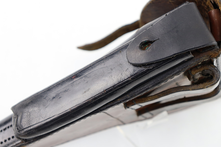8/31/23 – This is (what we believe) a Weimar era Luger holster. The holster comes with an unmarked Luger cleaning rod and tool. The holster leather is maker stamped on the back leather, and has LZA distributor stamps on the front and back leather. These stamps are typically found on WW1 era holsters, but the style of this holster is unlike most WW1 examples. It’s possible this could have been put together from leftover WW1 era leather. The front leather, near the mouth opening, is stamped with a circular stamp that looks like it could potentially have a Weimar eagle inside, but the stamp is faint and faded. The leather shows mild signs of use and normal pliability throughout. The biggest flaw is the side closure knob for the magazine pouch is missing / broken. No notable stitching issues.