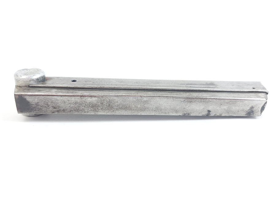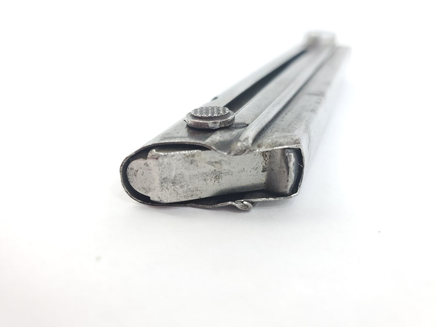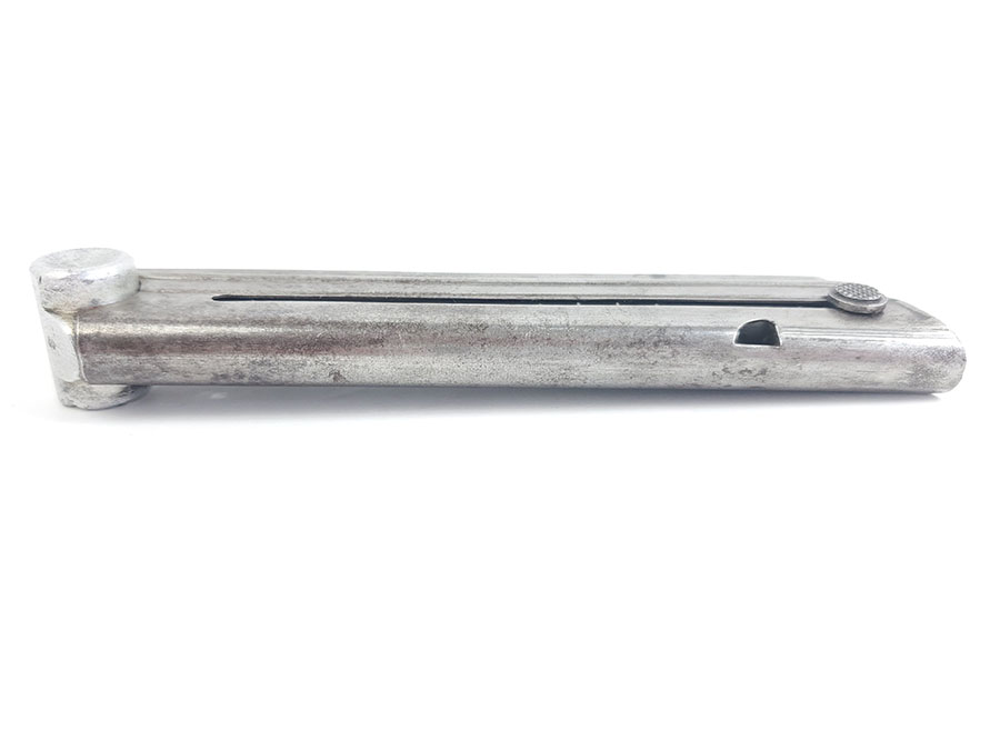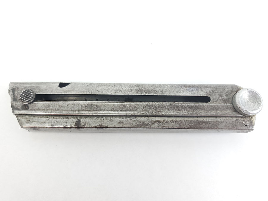 6/9/20 – This is an original Weimar era / early WW2 era police luger magazine. The magazine has a nickled tube that is in good condition but there is surface patina and discoloration throughout. No rust or pitting – just brown discoloration. The aluminum base is police numbered with no proof stamps. The spring is tight with smooth action – fully functional.