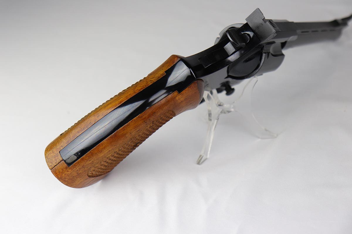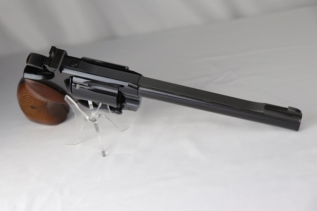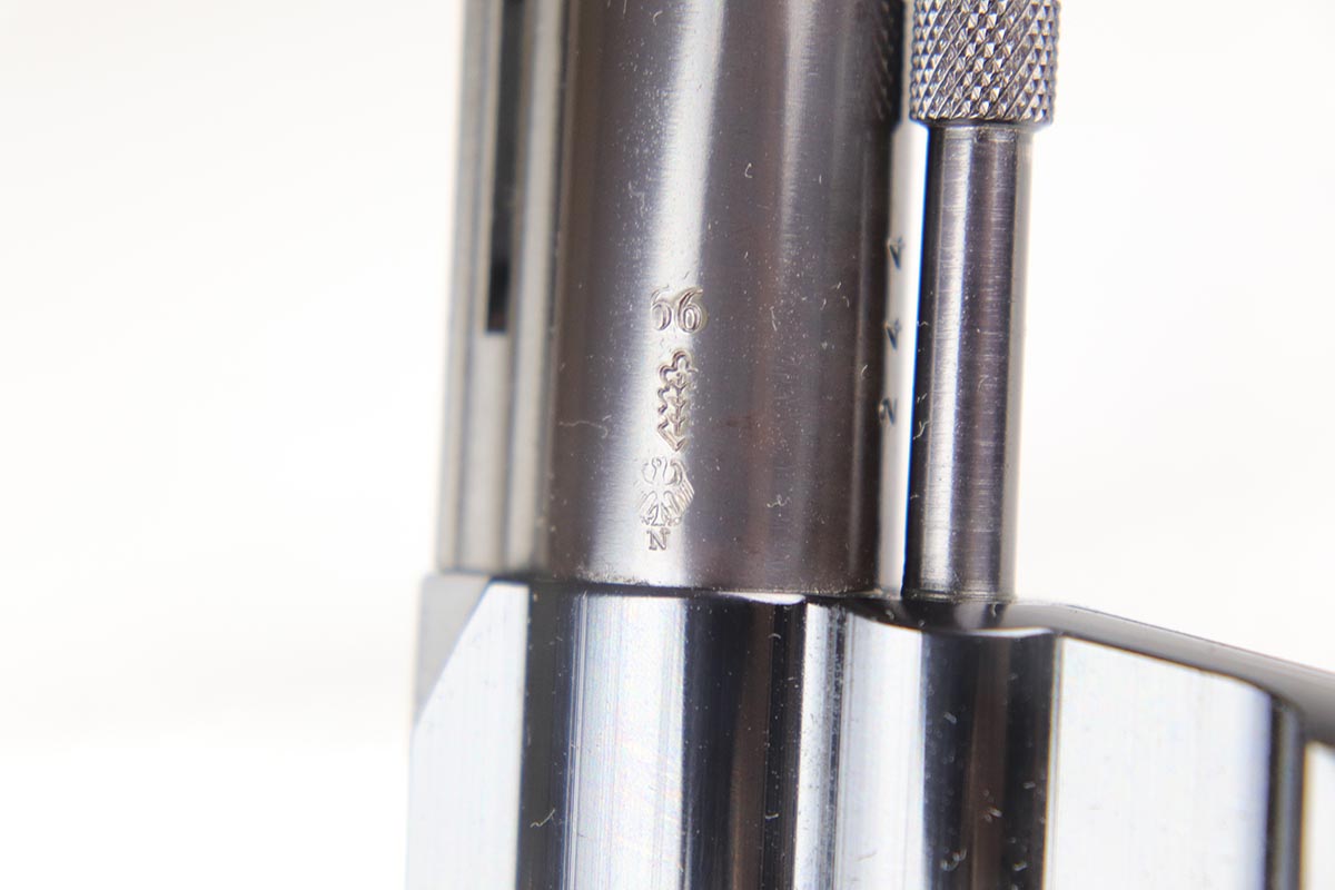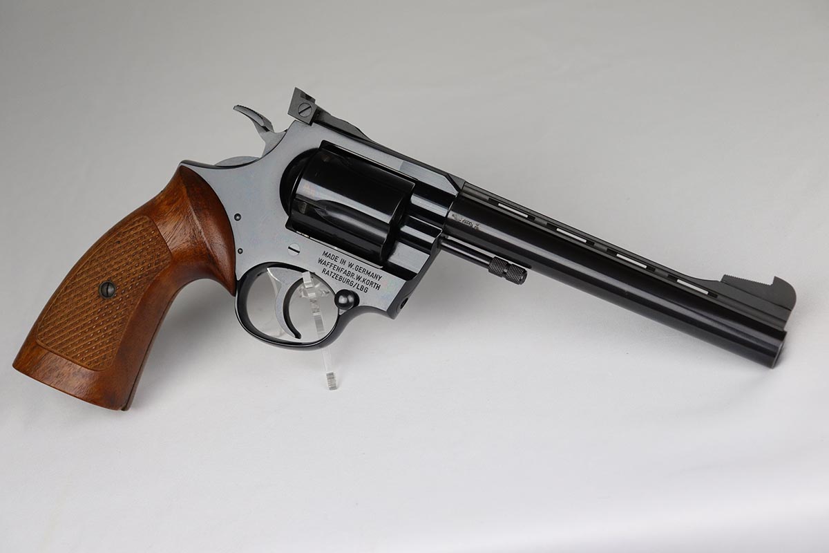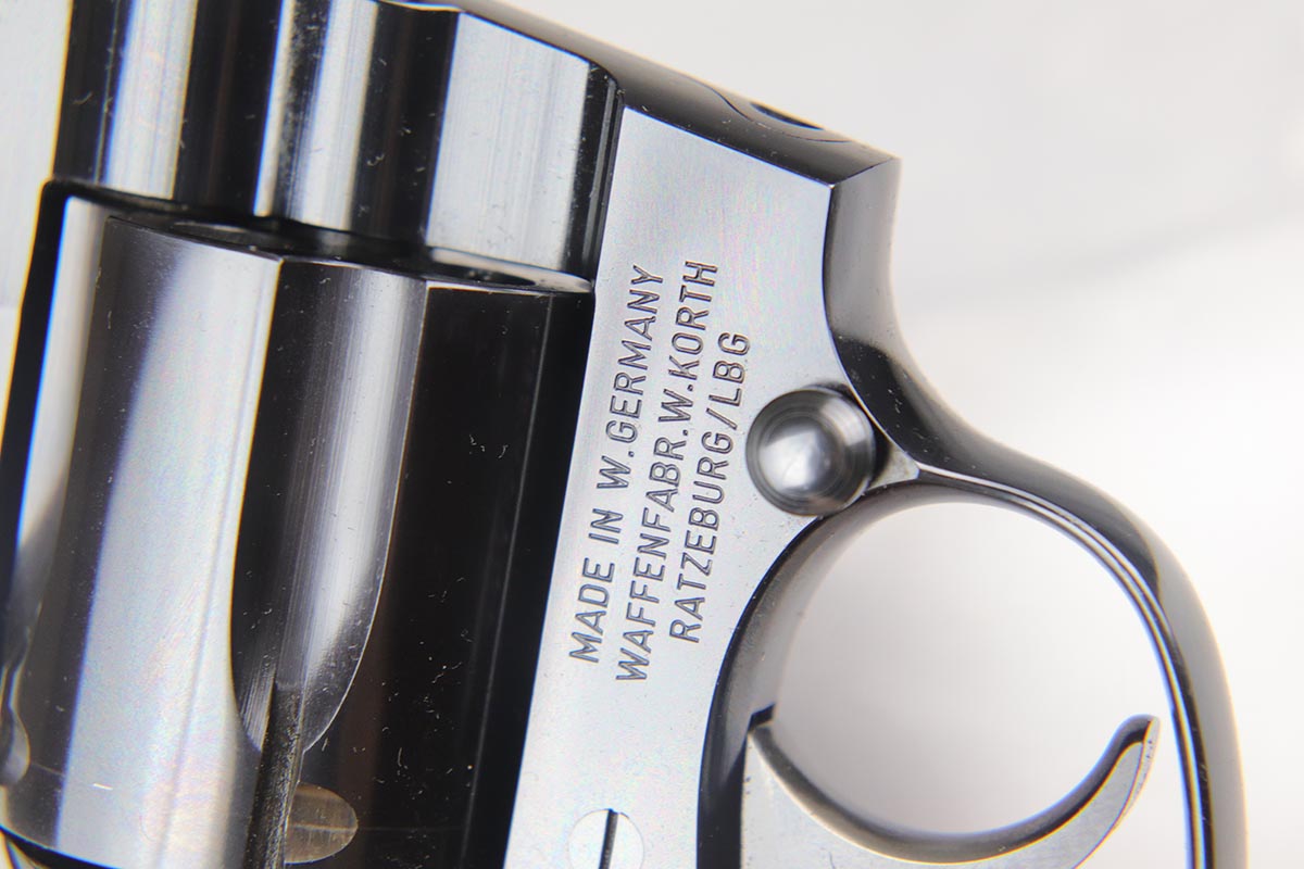 1/27/21 – Arguably the best and the most expensive revolver ever made, Korth was designed by Willie Korth in West Germany in the mid sixties, with all parts completely hand made from one solid billet of steel, hand fitted and beautifully finished. The trigger system was proprietary, invented by Herr Korth himself and rivaled the action of the S&W and Colt Python revolvers of that era. The cylinder was yet another innovation and could be removed from the frame together with yoke with a push of the button. This particular model is the “Sport” model, chambered in .357 magnum, with a 6-inch barrel, adjustable rear sight, and target checkered grips, which proved to be the best combination for a target and a tactical shooter alike. The trigger pull is like butter – crisp and easy. The finish is high gloss original blue rates at 98+% with a tiny rub mark on the rear grip strap. The bore is mint. The gun is proofed and dated 66 (1966) on the barrel which qualifies for C&R.
