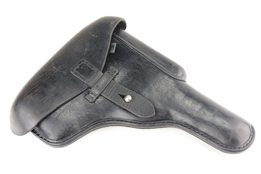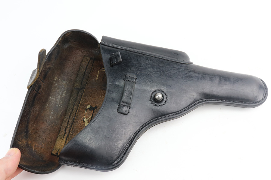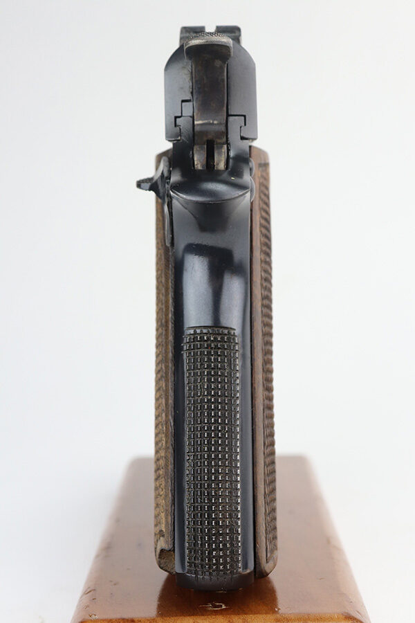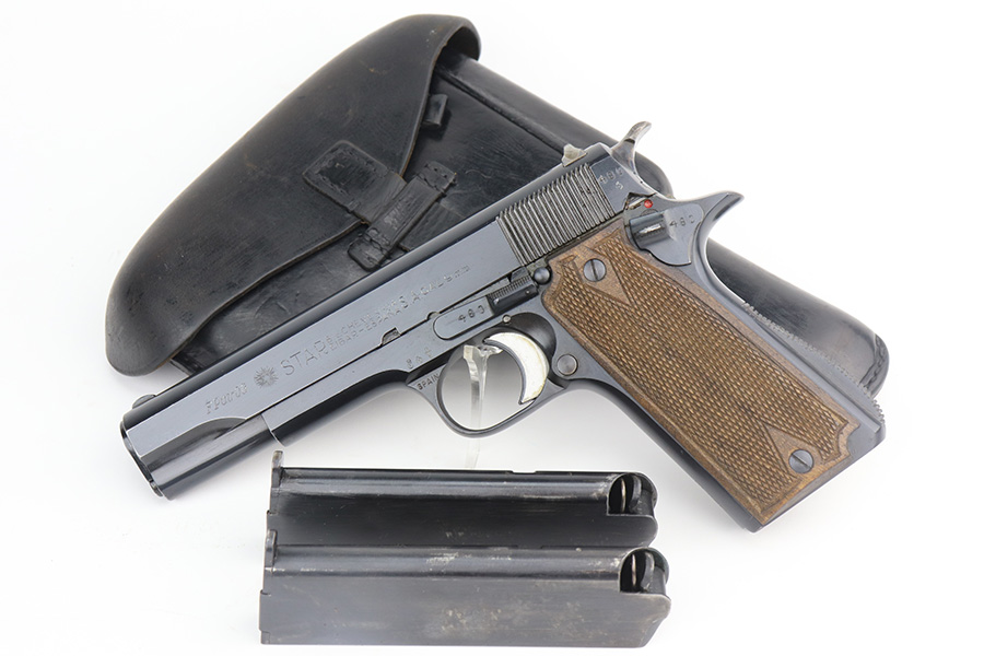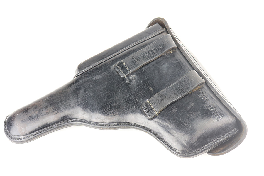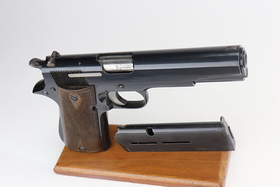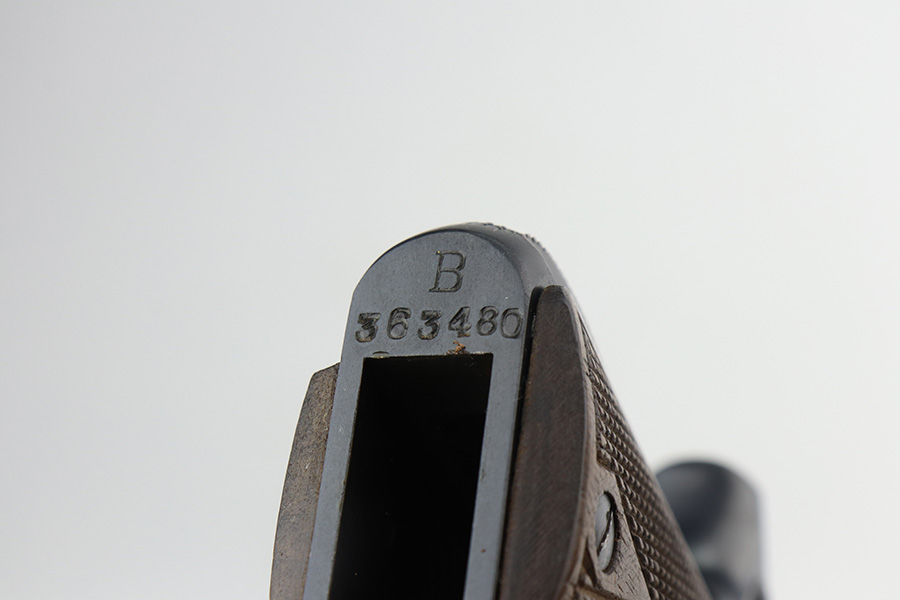 6/14/21 – This is a near-mint example of a Star Model B rig issued to the West German police force after WW2. The gun is all matching, has the proper Spanish proofs, and has a West German police “LPN” marking on the front strap. “Spain” marking on the trigger guard. The gun comes complete with two original matching magazines and a matching holster. The holster was given a different serial number initially that was later scratched out and re-numbered. The gun has retained more than 98% of its finish with just hints of wear around the high edges of the slide and a few marks on the front strap. Excellent bore – shiny with good rifling and very minor freckling here and there. Excellent wood grips.
