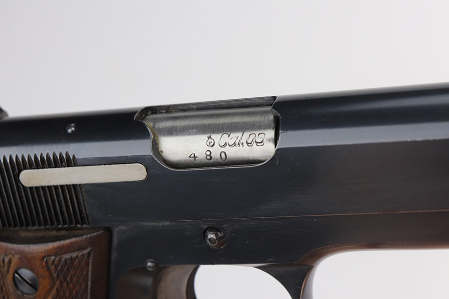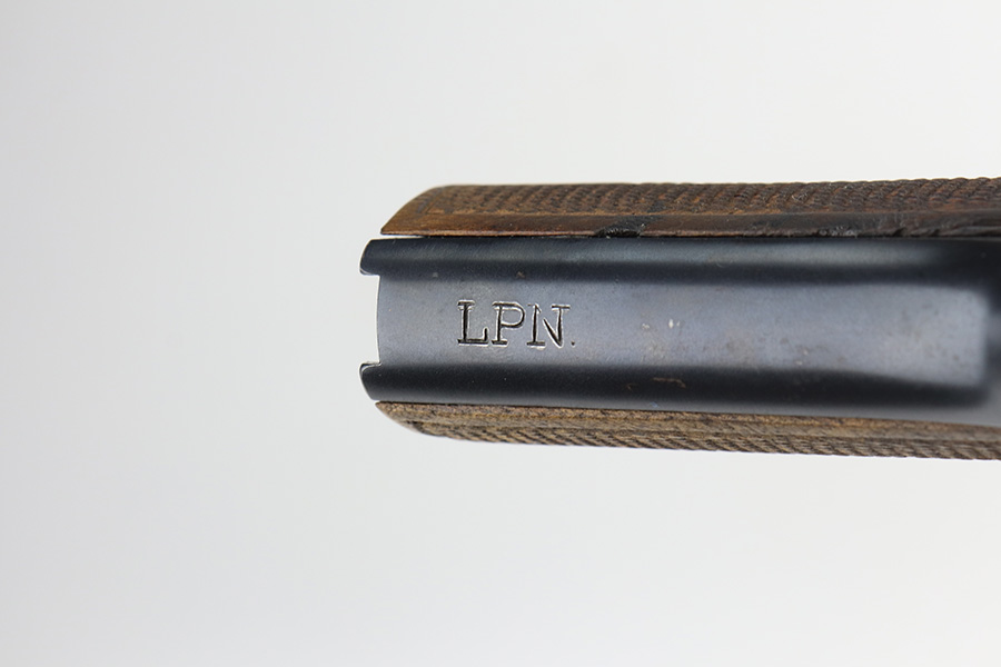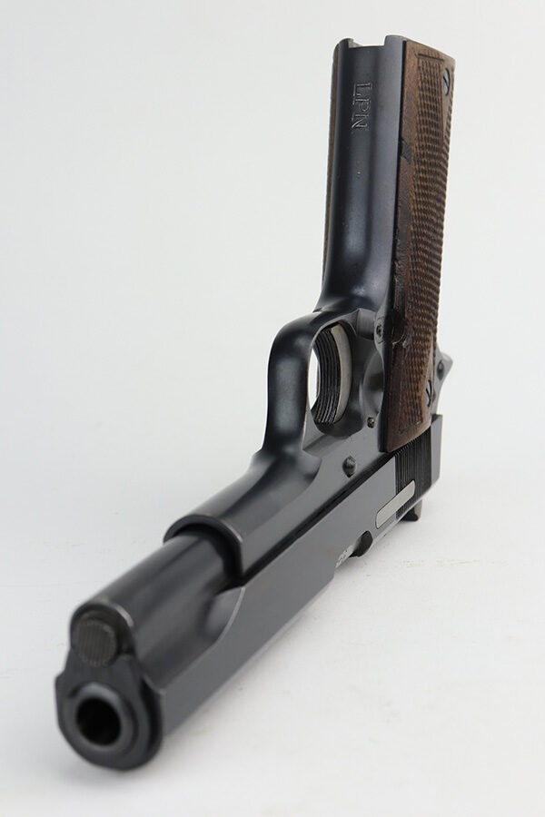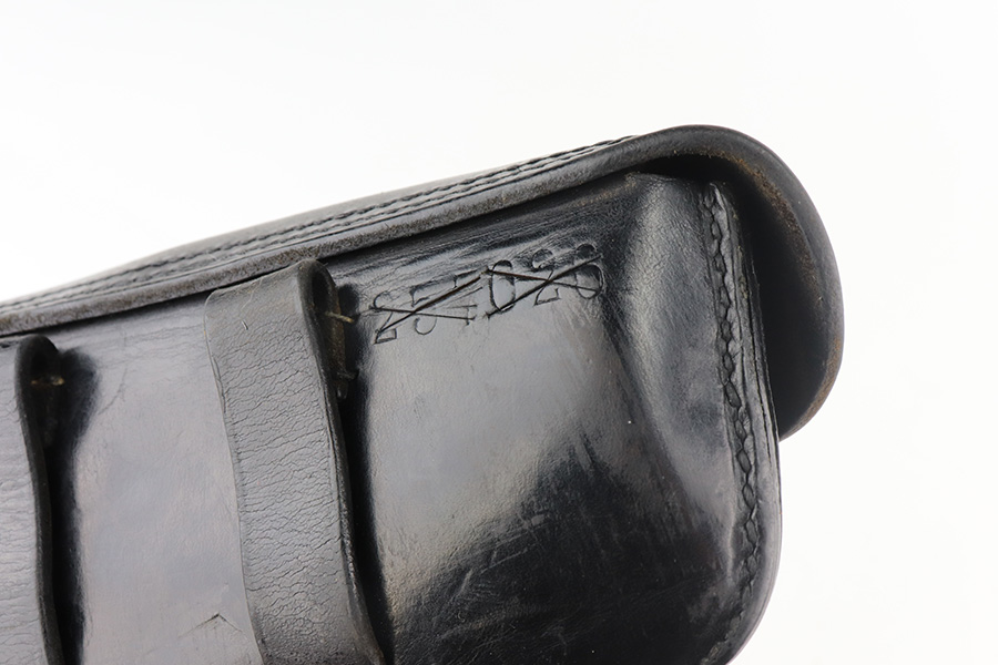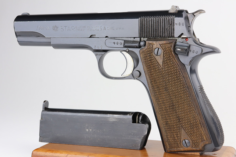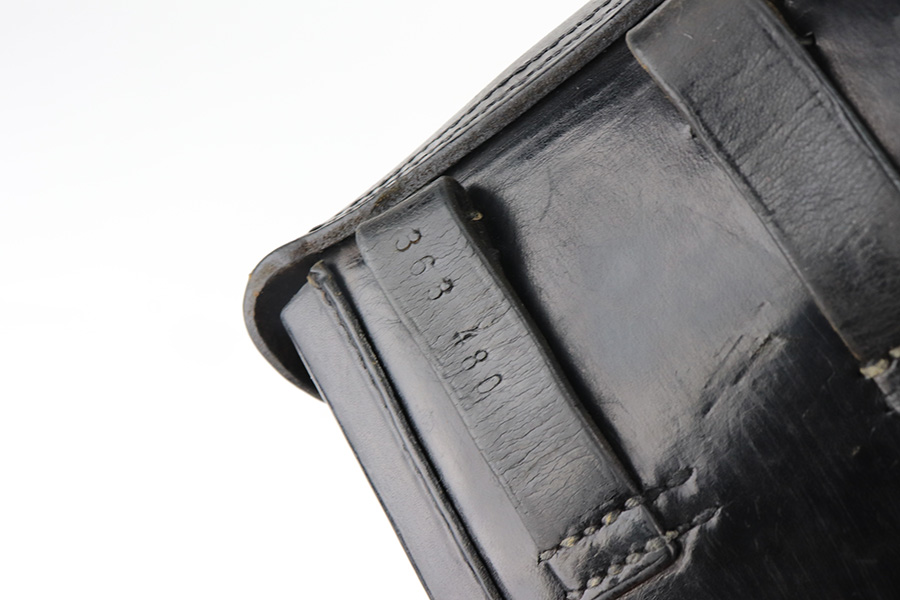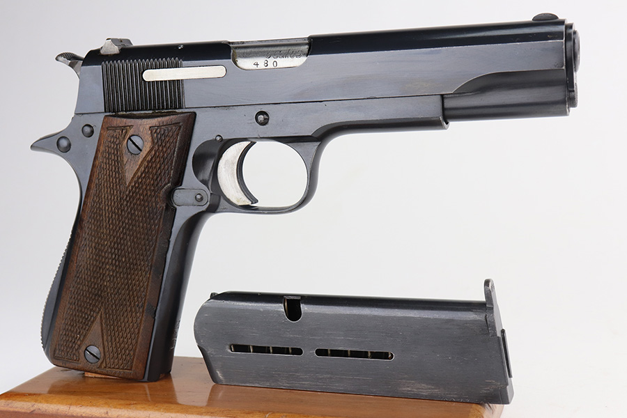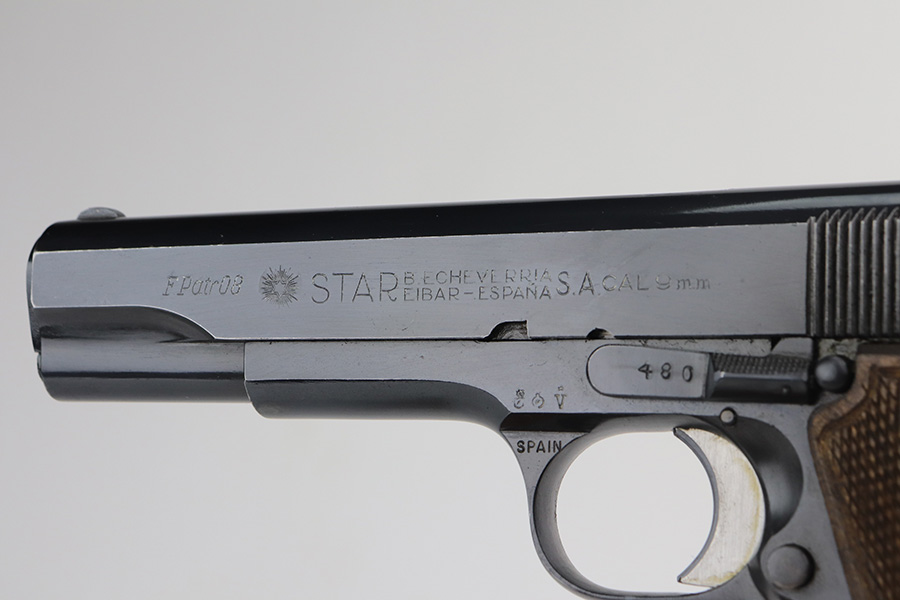 6/14/21 – This is a near-mint example of a Star Model B rig issued to the West German police force after WW2. The gun is all matching, has the proper Spanish proofs, and has a West German police “LPN” marking on the front strap. “Spain” marking on the trigger guard. The gun comes complete with two original matching magazines and a matching holster. The holster was given a different serial number initially that was later scratched out and re-numbered. The gun has retained more than 98% of its finish with just hints of wear around the high edges of the slide and a few marks on the front strap. Excellent bore – shiny with good rifling and very minor freckling here and there. Excellent wood grips.