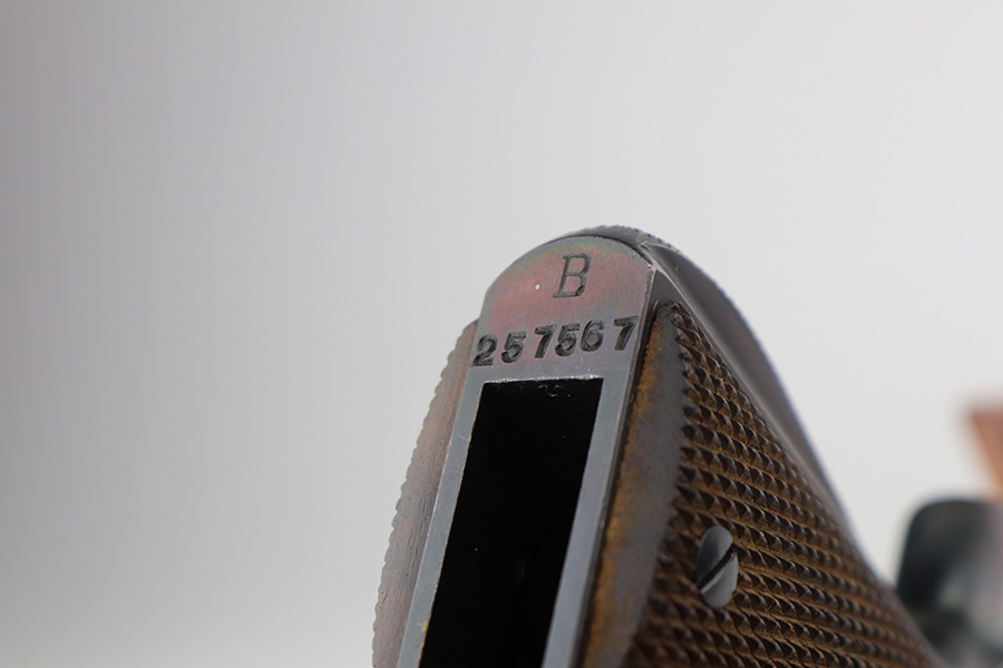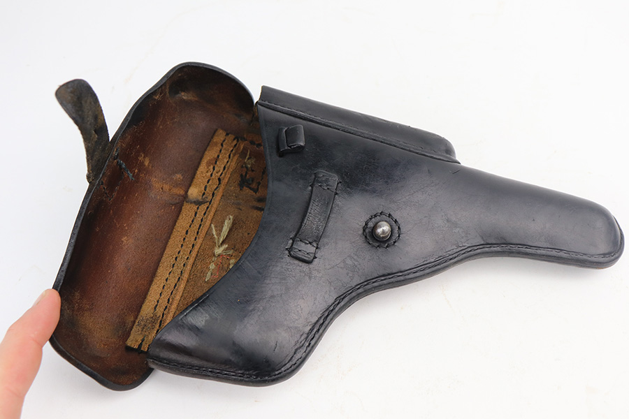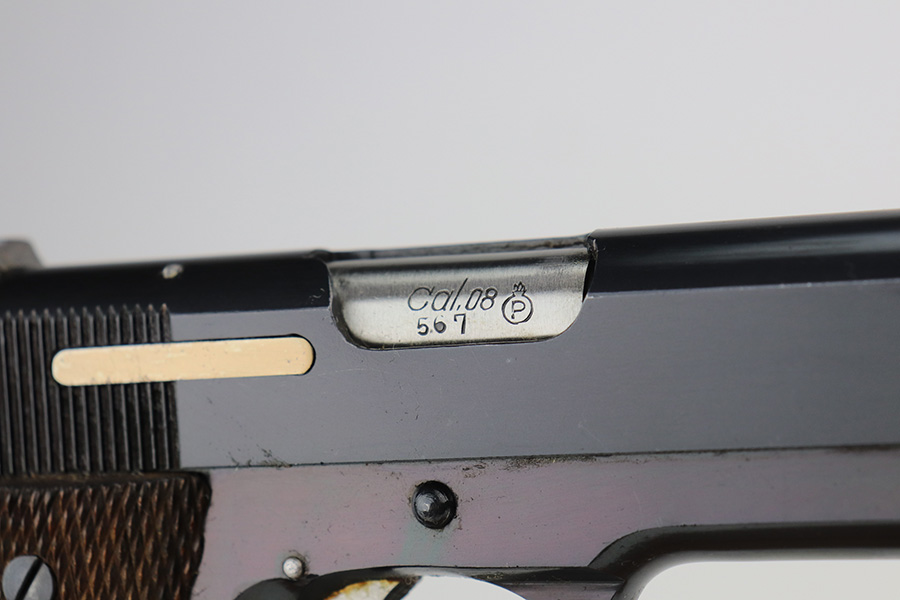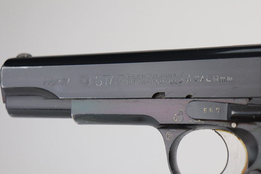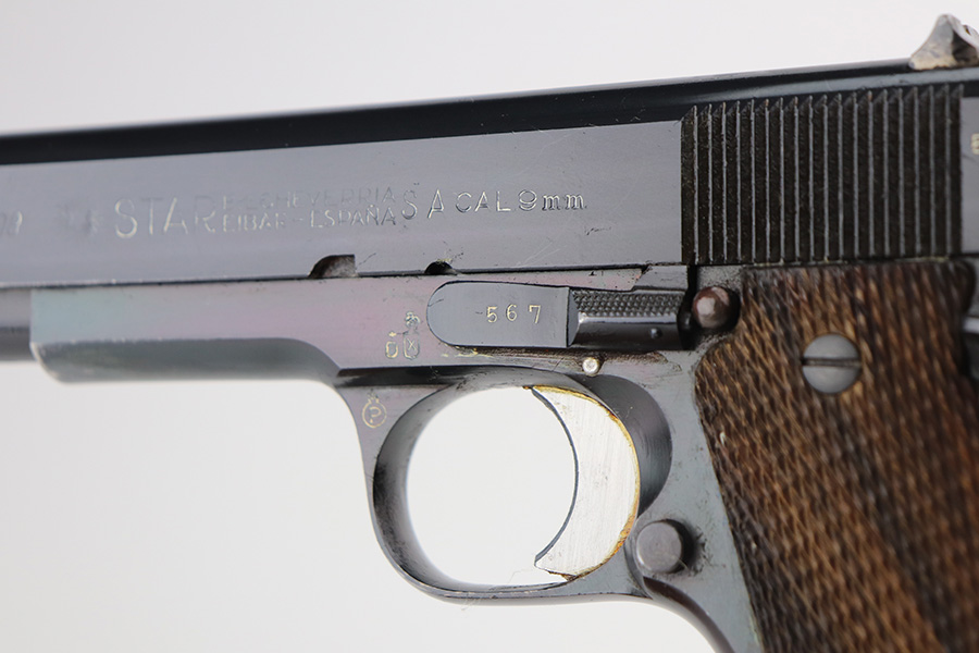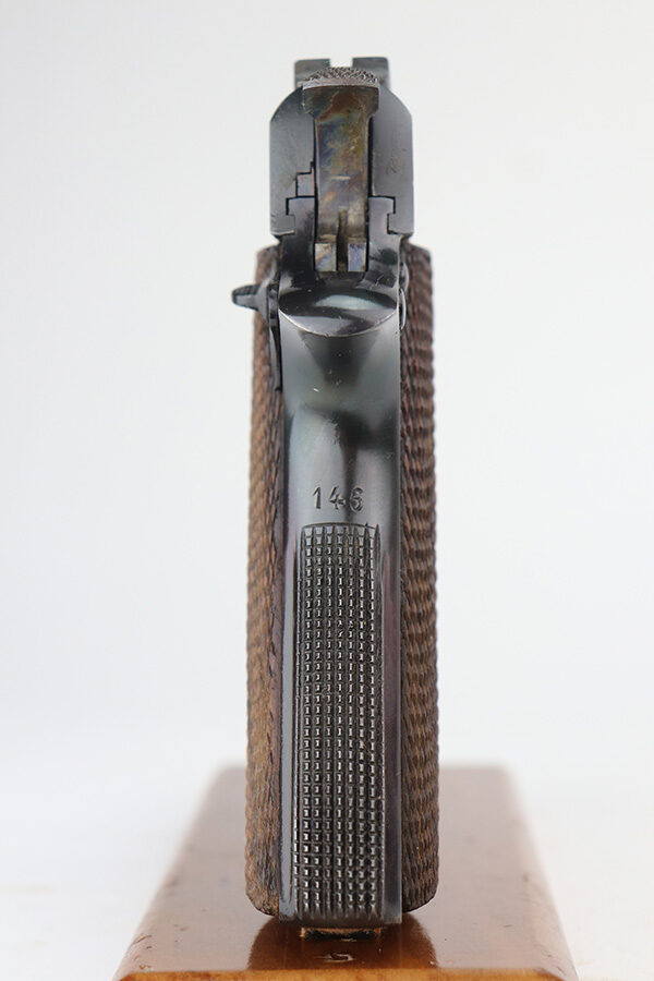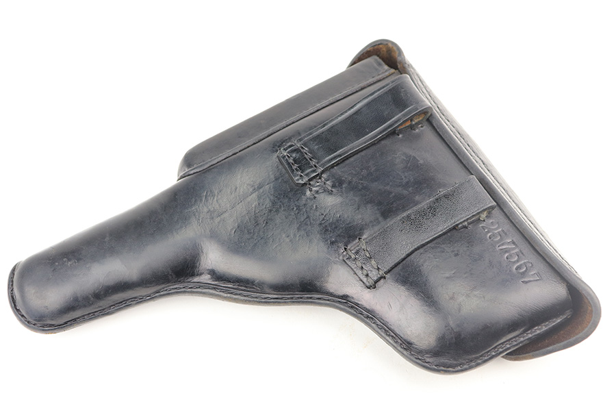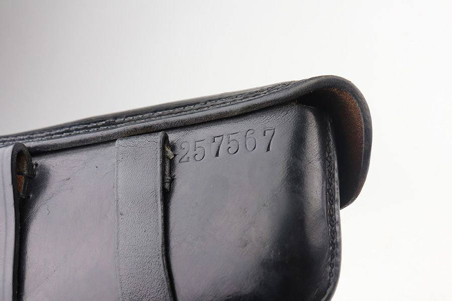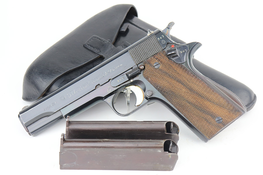 6/9/21 – This is a near-mint example of a Star Model B issued to the West German Police force after WW2. The gun is all matching, has the proper Spanish proofs, and has the proper “LPN” West German Police marking on the front strap. The rig comes with two matching magazines and a matching holster – both numbered at the police arsenal. It has retained about 98% of its bluing – just minor wear on the muzzle and some light handling marks on the front strap. One small spot of minor wear on the top of the slide. Parts of the frame have a really nice plumb color. Excellent wood grips. Mint bore.
