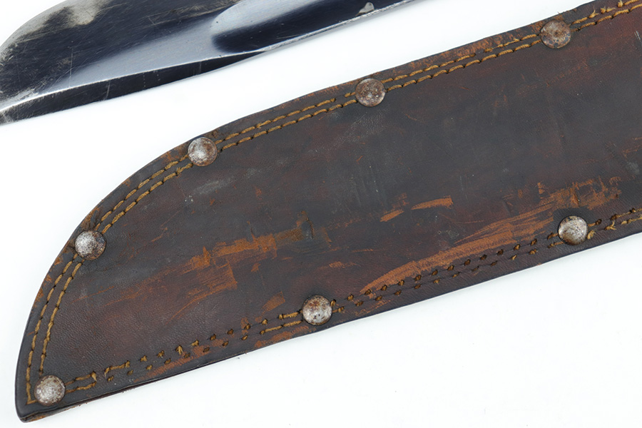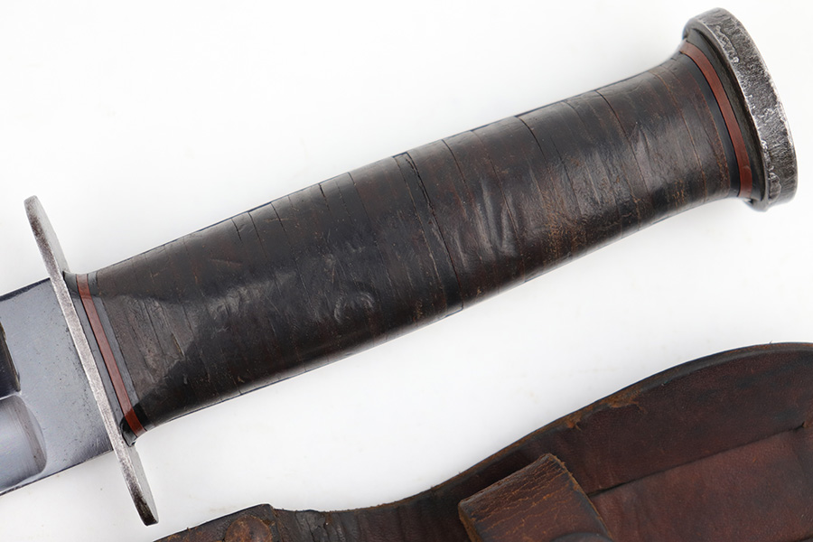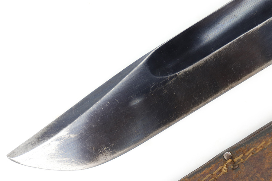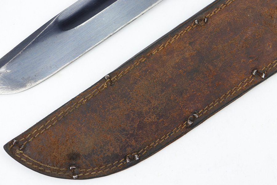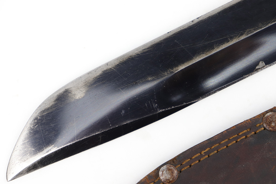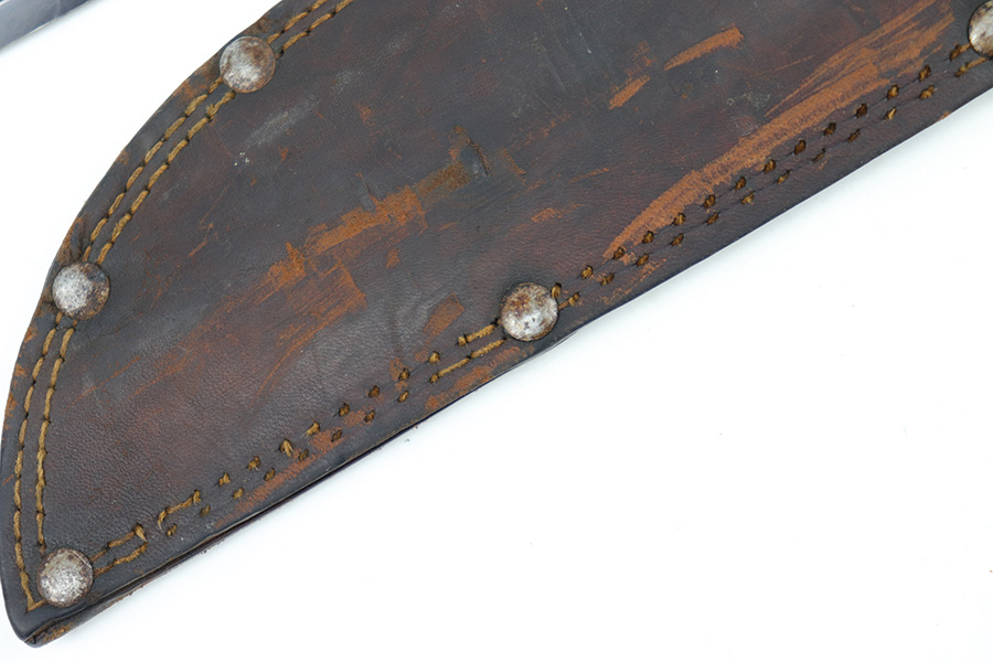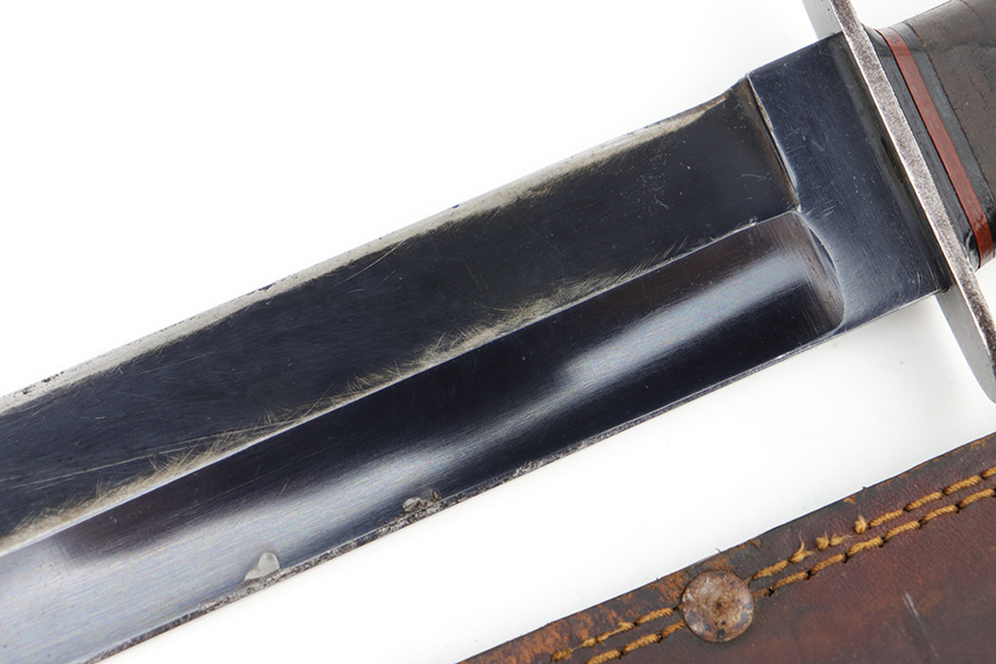 3/28/23 – This is an original Western G46-8 military fighting / utility knife. The G46-8 was a larger size (8 inch blade) fighting knife that Western developed during WW2. The blade features a nice high polish blued finish that’s still in great shape. There’s some mild finish loss on the edge of the groove, and most of the wear is near the tip and edge of the blade. Some light signs of sharpening and use. The leather handle is in great shape with mild aging wear. Nice early red and black spacers. Comes with an unmarked leather sheath.