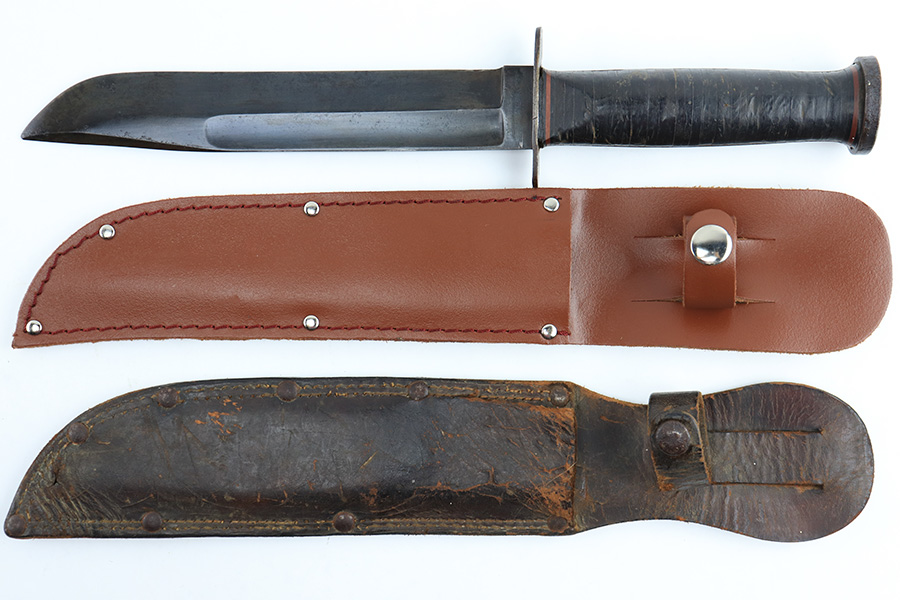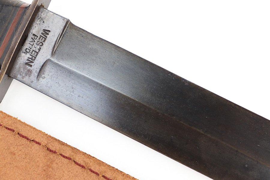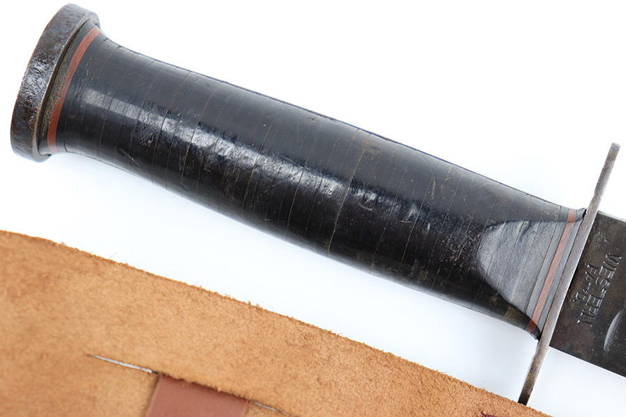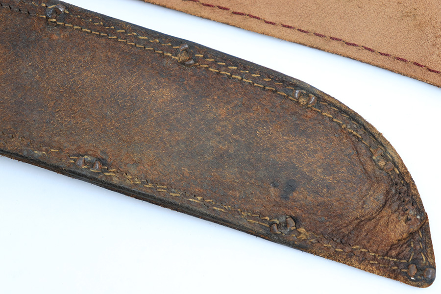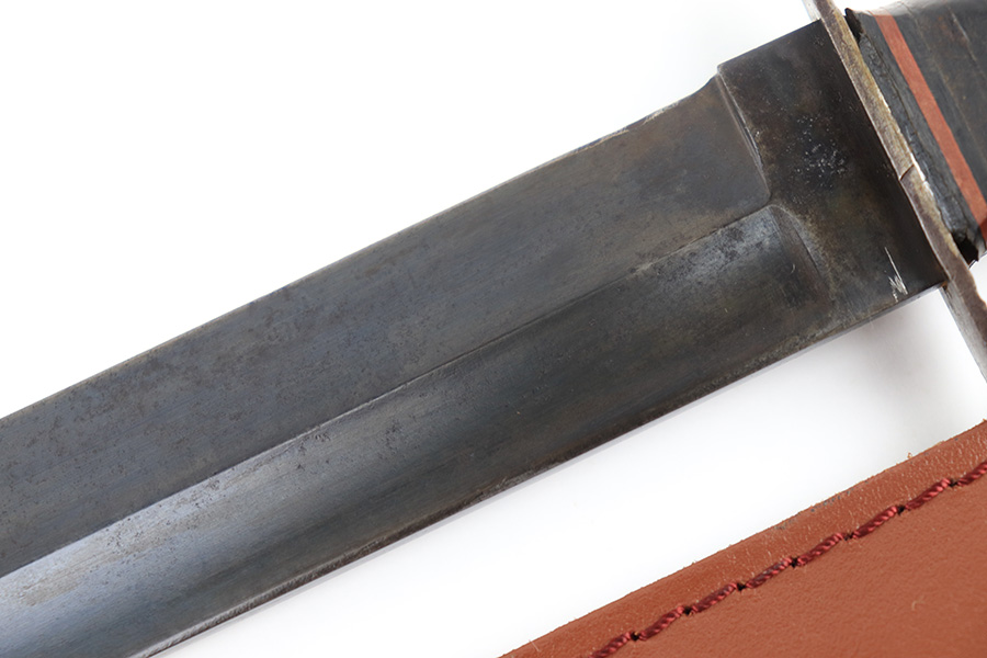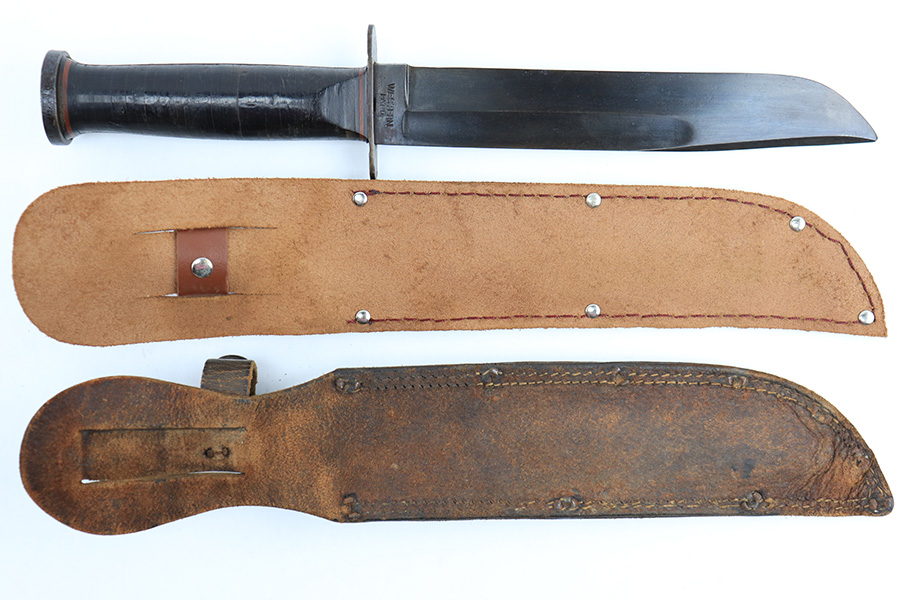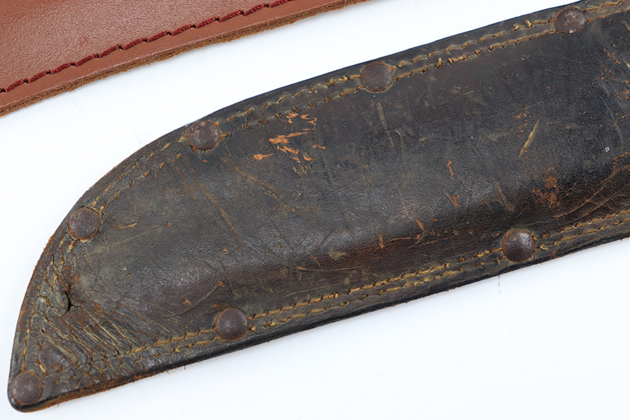 8/18/23 – This is a fairly scarce, original Western G46-8 military fighting / utility knife. The G46-8 was a larger size (8 inch blade) fighting knife that Western developed during WW2. The blade is in very good overall condition with dark patina and surface wear mixed within the finish. There’s a small area of pitting on one side as well. The edge is in great condition with no signs of sharpening. The leather handle is has mild age and handling wear but is tight, and retains the original, early style black and red spacers. Comes with a worn, period correct leather scabbard, as well as a postwar scabbard that’s in minty condition.