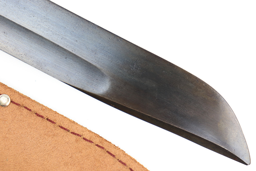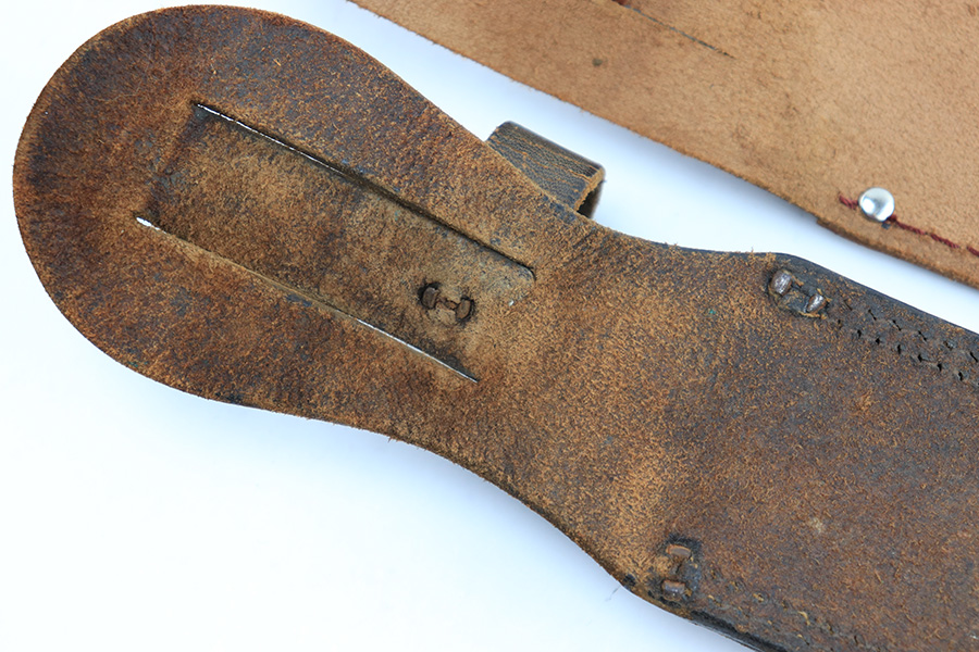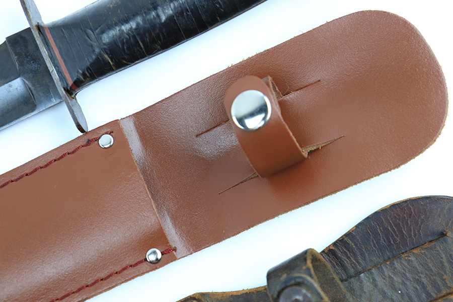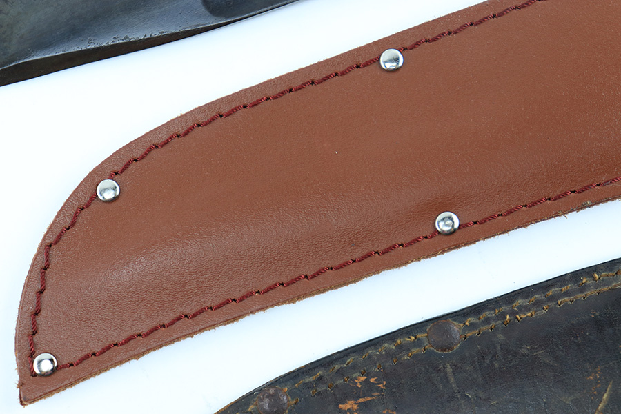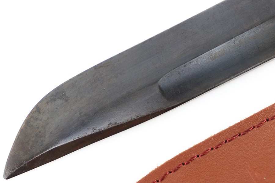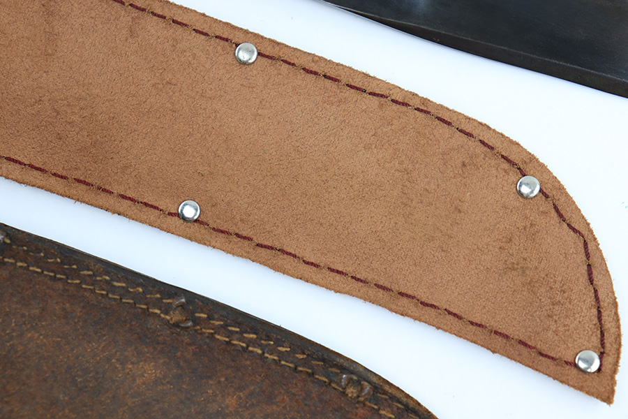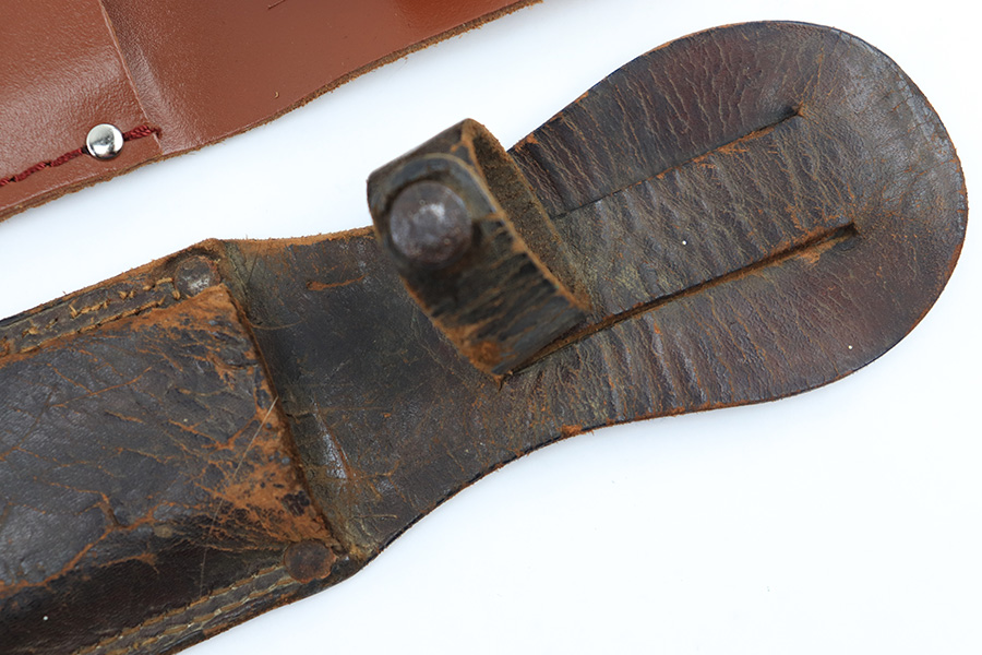 8/18/23 – This is a fairly scarce, original Western G46-8 military fighting / utility knife. The G46-8 was a larger size (8 inch blade) fighting knife that Western developed during WW2. The blade is in very good overall condition with dark patina and surface wear mixed within the finish. There’s a small area of pitting on one side as well. The edge is in great condition with no signs of sharpening. The leather handle is has mild age and handling wear but is tight, and retains the original, early style black and red spacers. Comes with a worn, period correct leather scabbard, as well as a postwar scabbard that’s in minty condition.