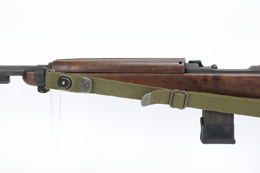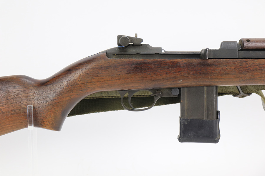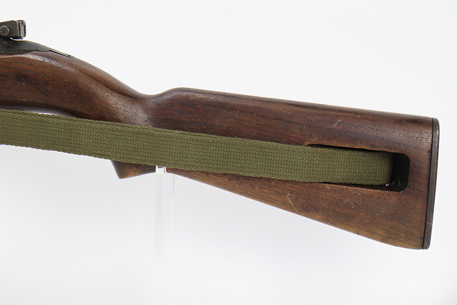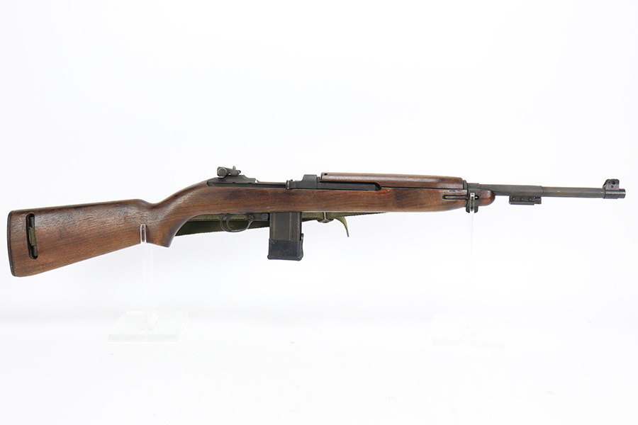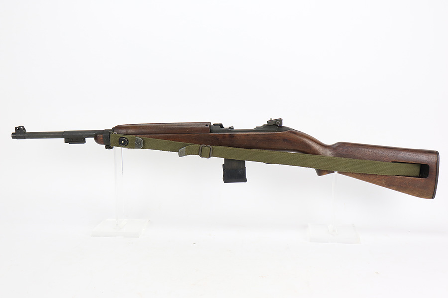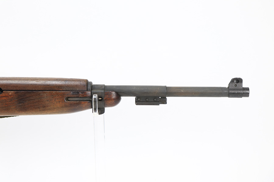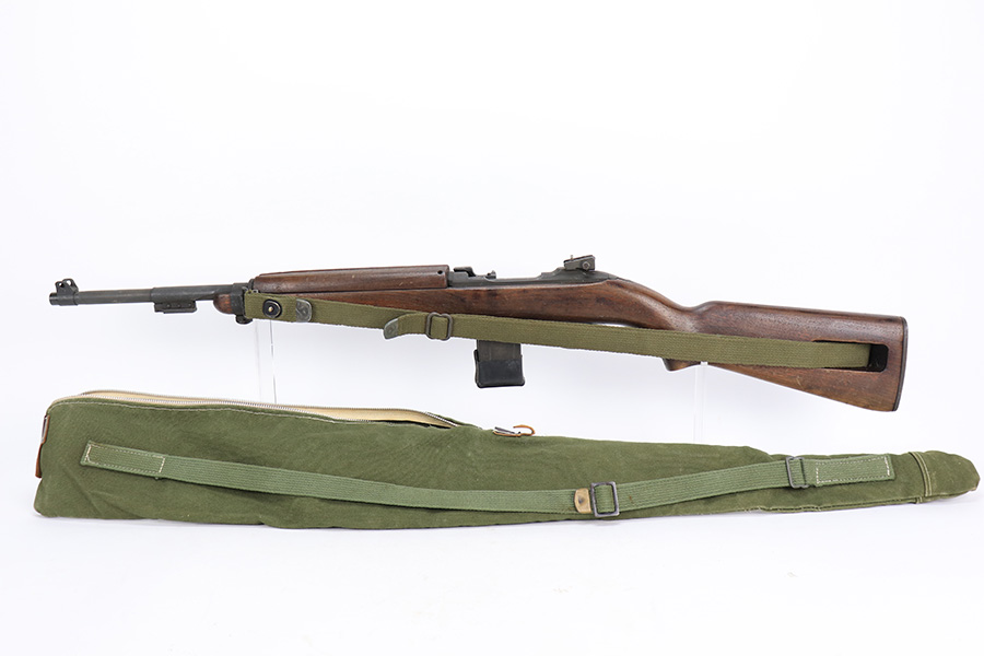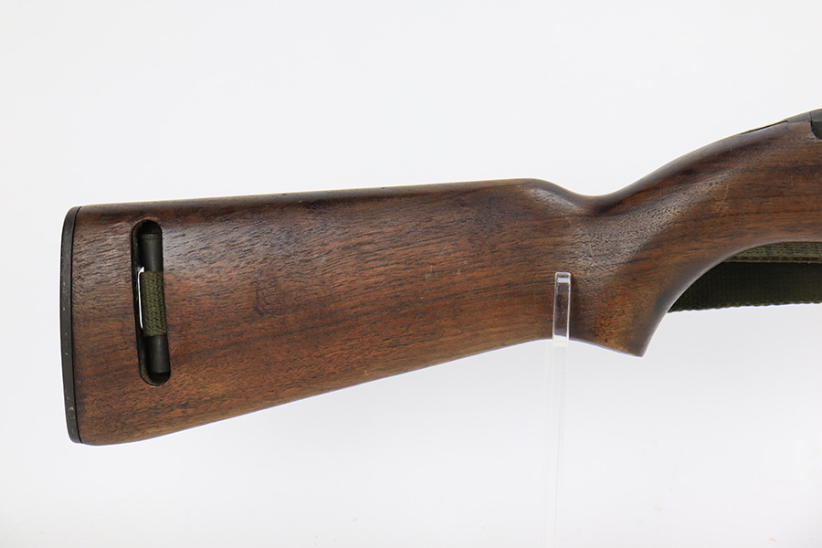 5/16/23 – This is an excellent example of a Winchester M1 Carbine issued to the US military in about 1943. The receiver is Winchester, the barrel was made by IBM, and the stock is “IO” Inland marked. There is an arsenal rework stamp on the left side of the stock. Faint cross-canon cartouche on the right side of the butt stock. An adjustable rear sight and bayonet lug were added, likely for re-issue during the Korean War. It comes with one magazine, an oiler, a green canvas sling, and a green canvas carrying case. The metal parts have retained nearly all of their parkerized finish with just some small spots of discoloration here and there. Excellent wood stock with just some tiny dings on the upper hand guard. Minty bore.