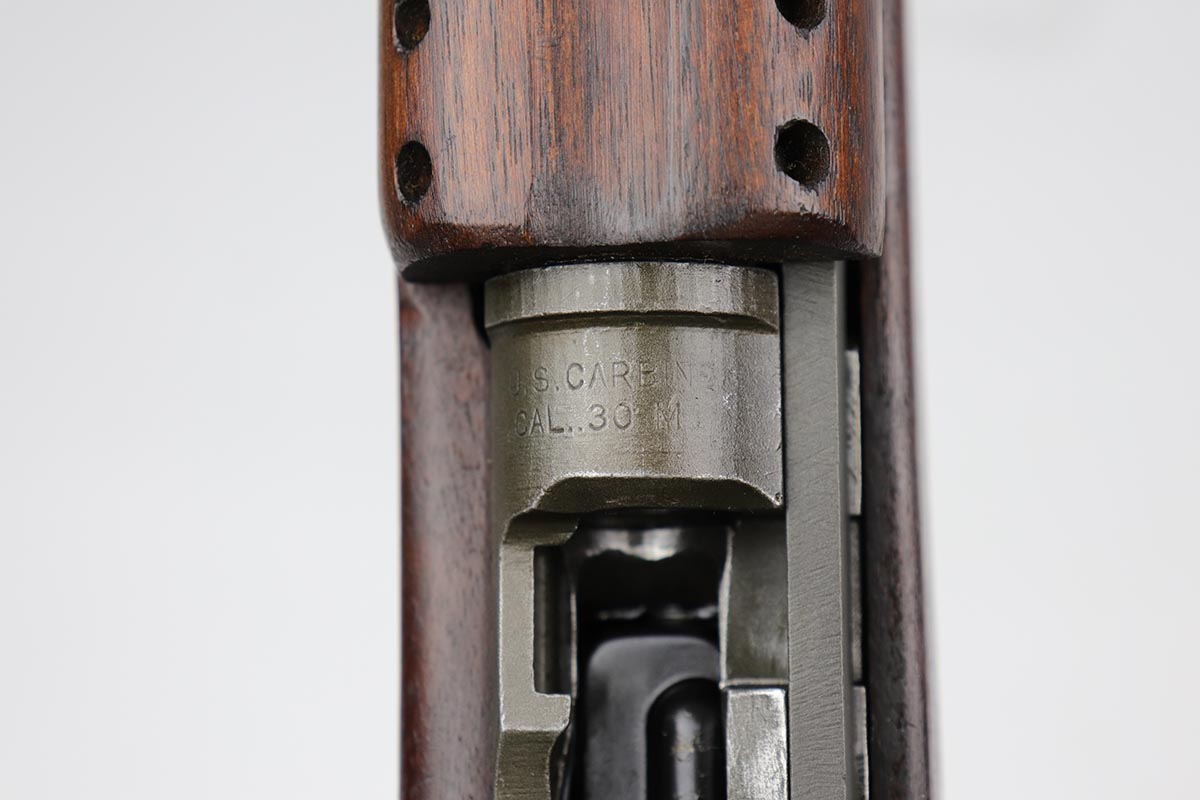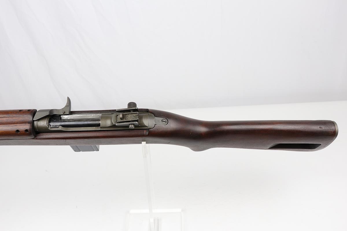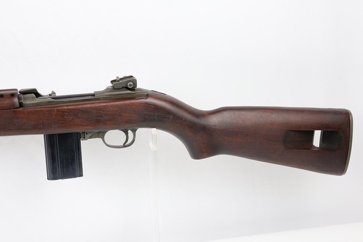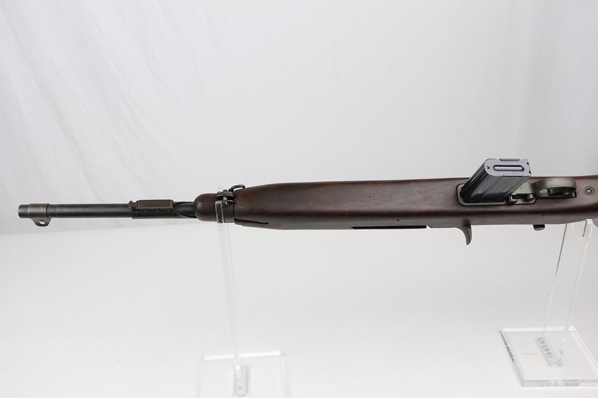 6/14/19 – This is an excellent example of a Winchester M1 Carbine, made in the latter months of 1944. Low wood stock with sharp cartouche on right side of stock. W proof on barrel and in the sling well. Handguard is also W marked inside. Excellent parkerized finish on metal parts with correctly blued bolt. Stock is in great shape with only minor nicks and dings. Has adjustable rear sight and bayo lug – may have been made at the end of World War II and then never issued until the Korean War. Excellent bore. S-O marked magazine.