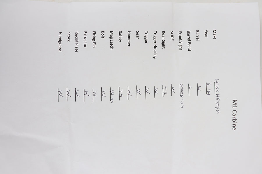 1/14/22 – This is an excellent example of a Winchester M1 Carbine from 1944. The rifle is mostly correct and original, but a full parts guide is included in the photos for this listing. The bayonet lug is the most obvious modifications, likely done after the war. Terrific parkerized finish throughout with just a bit of wear on the trigger guard. Terrific stock but may have been lightly sanded at some point. Minty bore.