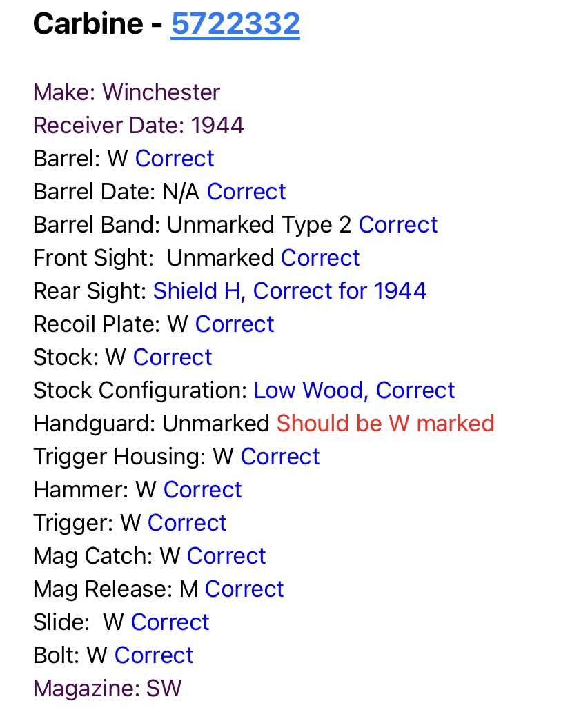8/6/21 – This is a nice Winchester M1 Carbine from 1944. A full parts list is included in the photos for the listing, but the rifle is all original aside from the handguard. It’s unmarked but should feature a W marking, so was likely replaced at some point. All the parts are original Winchester parts, though the bolt should likely be blued so may have been parkerized after the war. The metal finish is in good condition with most of the wear along the barrel. Mint bore, hardly looks used. Adjustable rear sight is correct for this serial range. Nice stock with no major defects. Sling included.