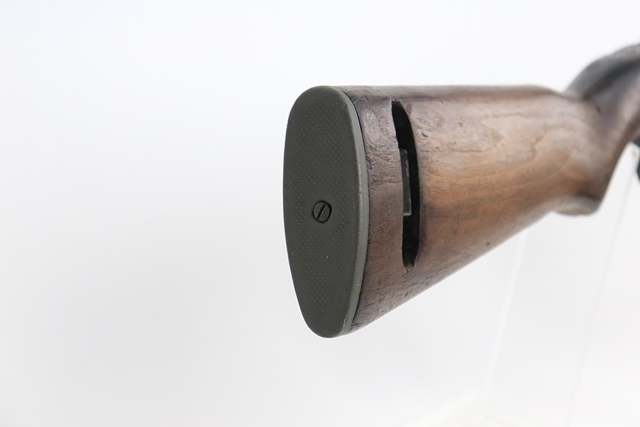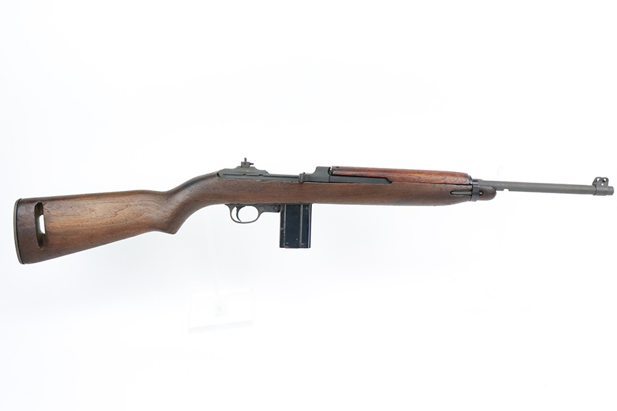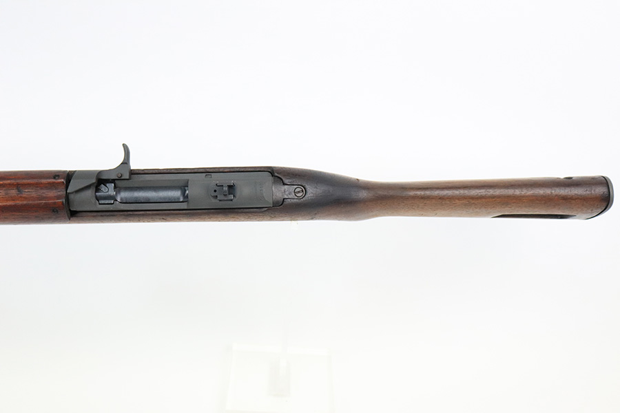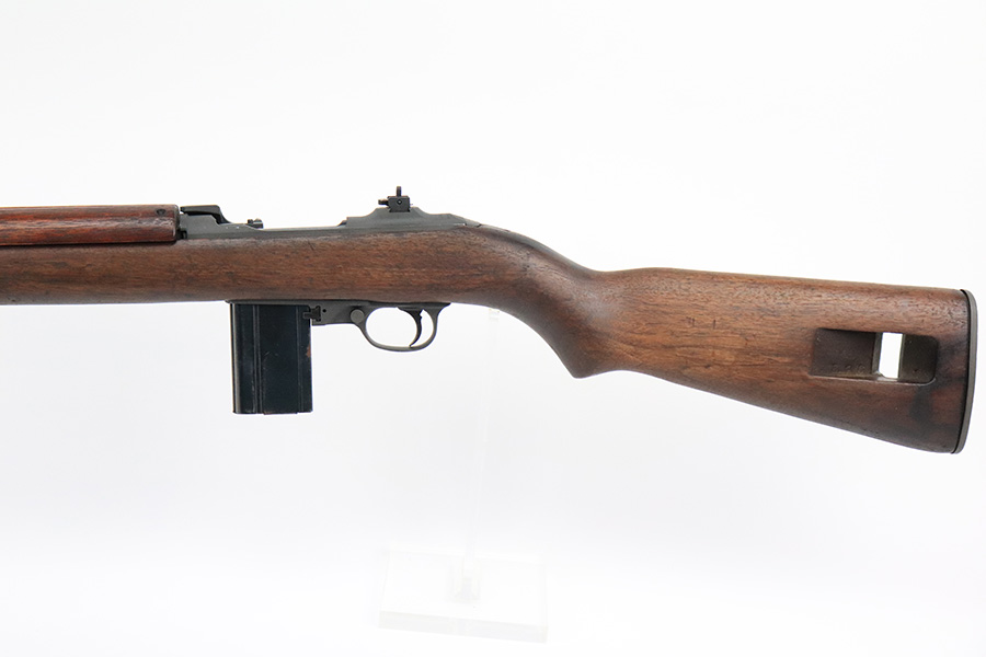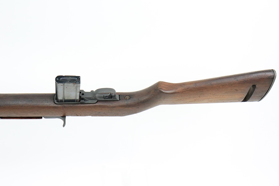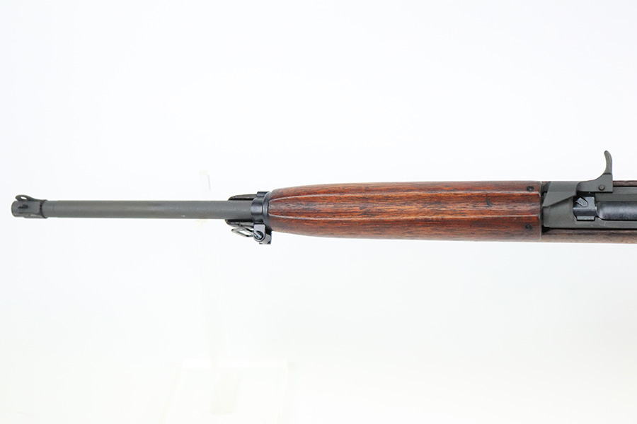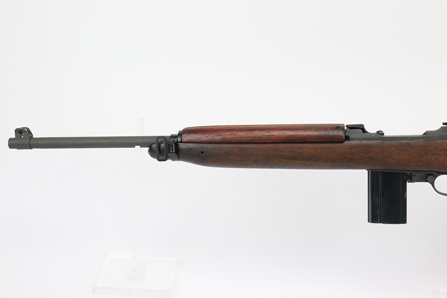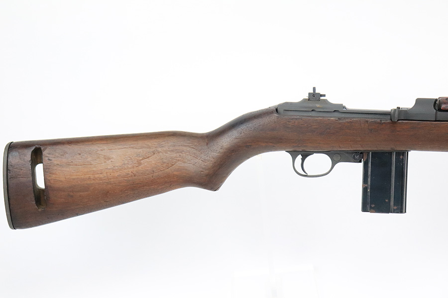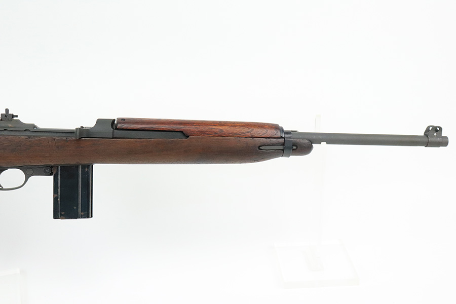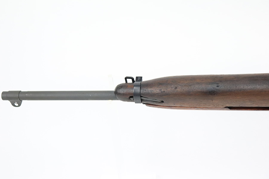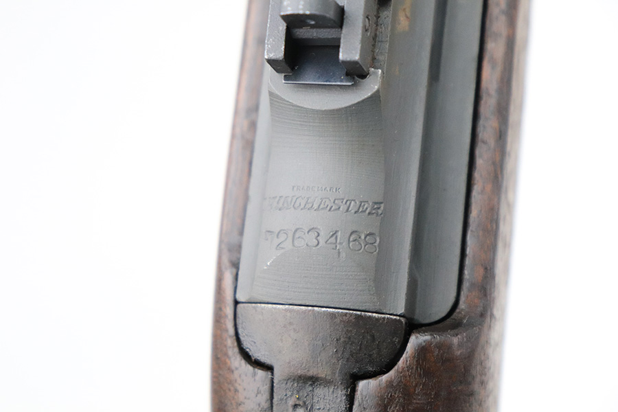 6/14/22 – This is a very nice example of a Winchester M1 Carbine issued to the US military around 1943. Both the receiver and barrel are Winchester. The stock is not maker marked but looks like it has an “816” rack number in the sling well. The condition of the stock and upper handguard do not match. “S” marked flip-up rear sight. Comes with one proper magazine. From examining the finish, we believe this gun has been adrenal reworked and refinished. In any case, there is very little actual finish loss – just a few tiny handling marks here and there and some areas of tiny pitting under the finish along the barrel. Minor dings, dents, and scratches along the stock. The handguard is in better condition. The bore has good rifling, but there is spotty oxidation here and there.