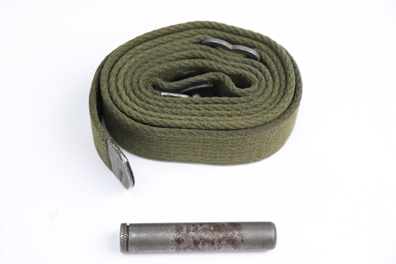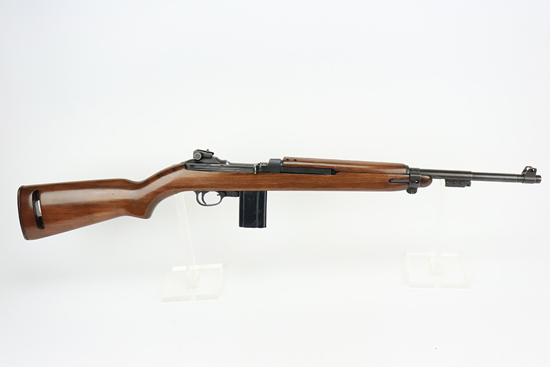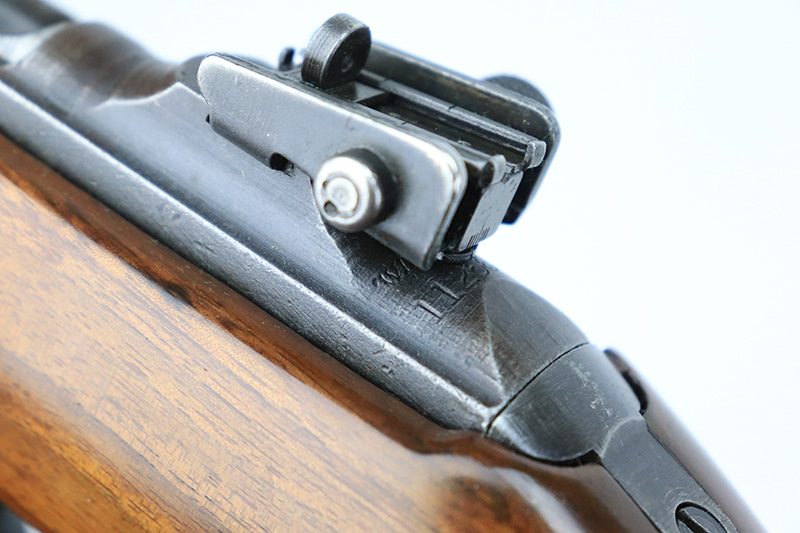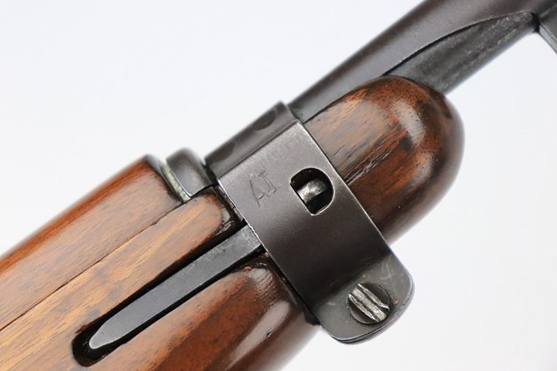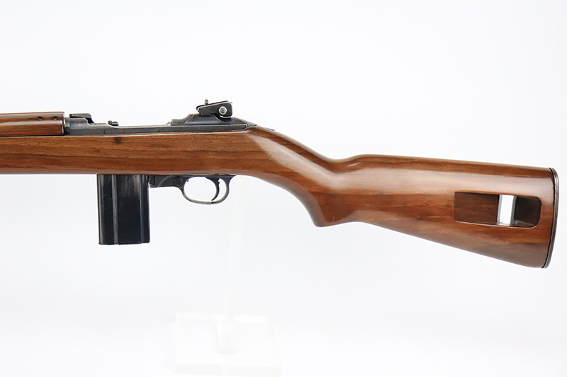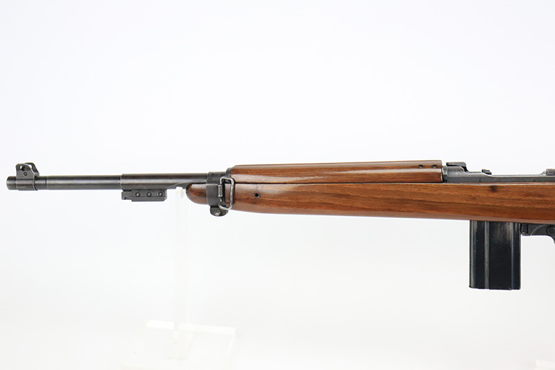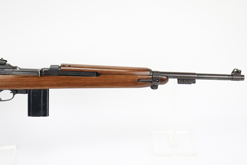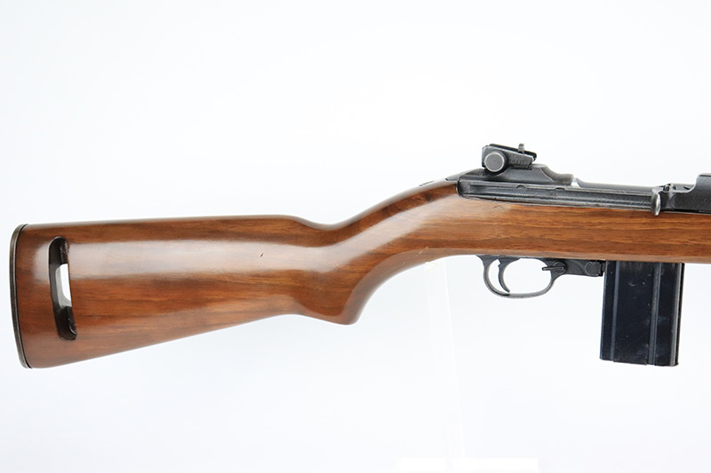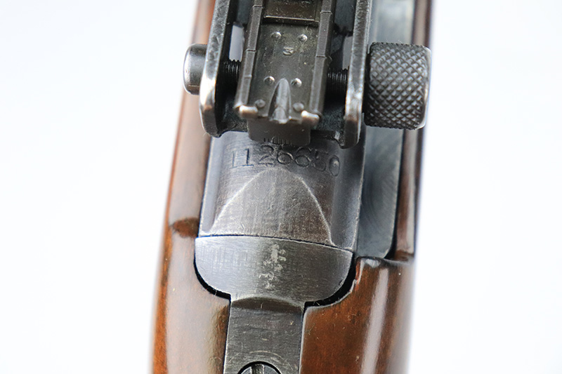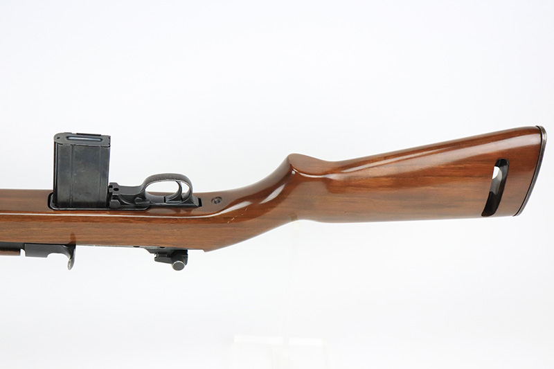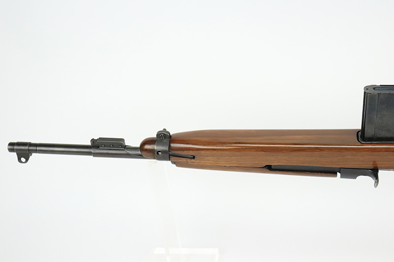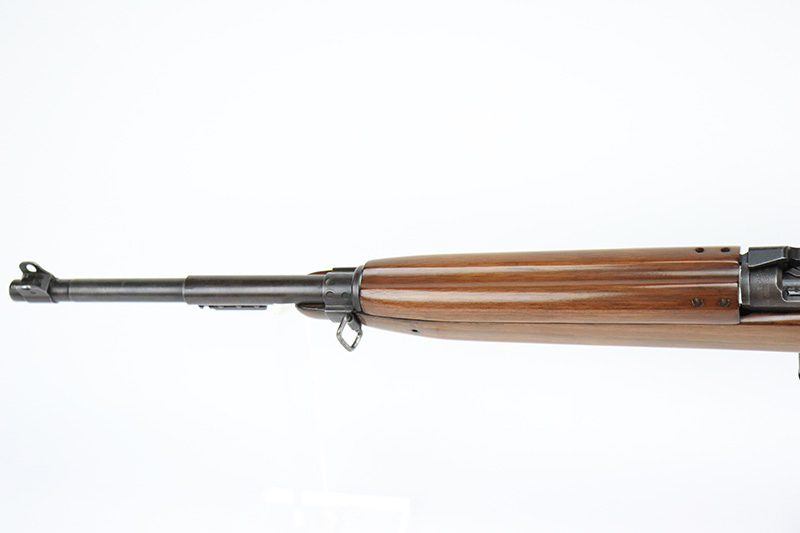 9/16/22 – This is a nice Winchester M1 Carbine from 1943 that was re-worked after the war. It was probably first modified for Korea, and then a subsequent owner had the stock sanded and lacquered so the markings are no longer visible. The finish on the metal parts is original, with minor thinning on the receiver. Winchester barrel and receiver. Bayo lug and adjustable rear sight added postwar. Bore has good rifling but some freckling and minor pitting in the grooves. Stock has no cracks or chips. Comes with a postwar mag pouch, sling, oiler and repro mag.