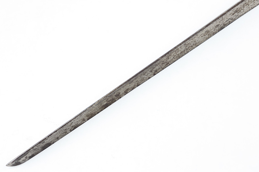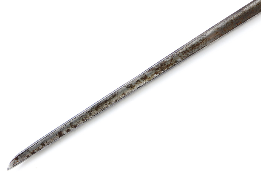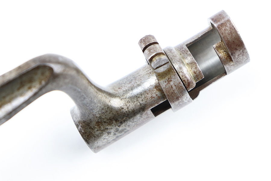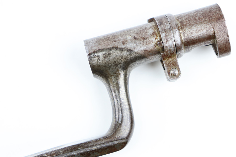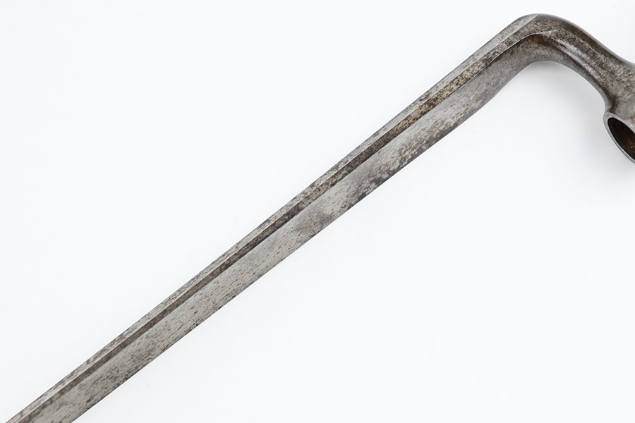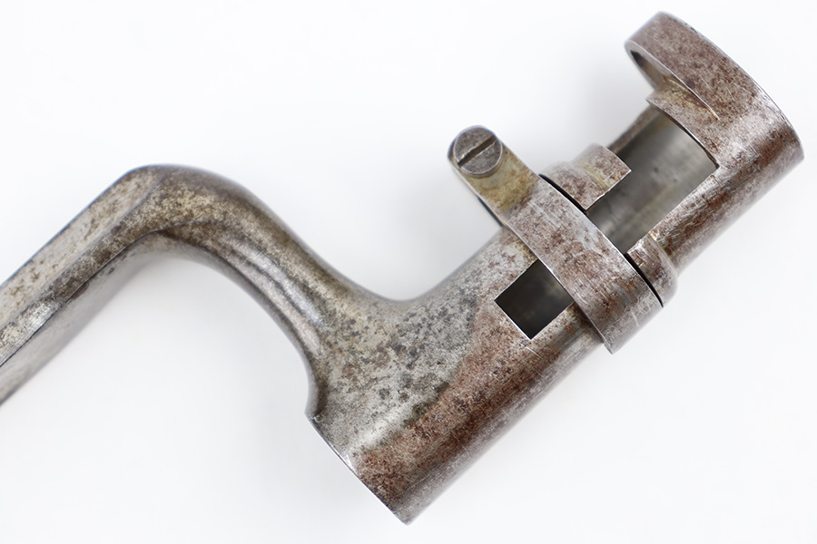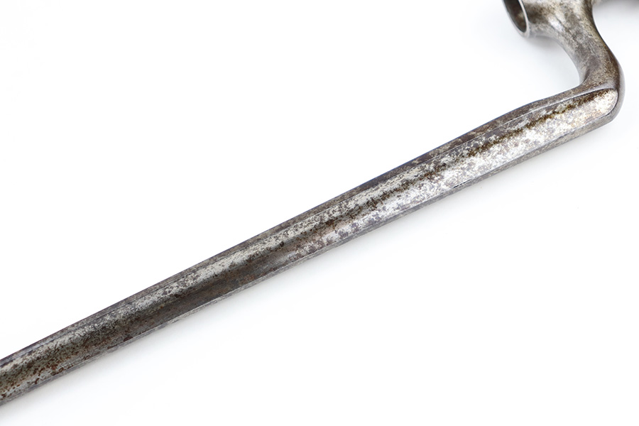 9/6/23 – This is a Winchester M1886 Musket Socket bayonet. The spike bayonet comes as shown, with no scabbard included. The blade measures about 18 inches long, and overall length is around 21.25 inches. There’s light surface patina and dark discoloration throughout the bayonet, but no major areas of textured rust or pitting. There’s one small area of pitting near the tip of the blade. No markings or stamps, and a functional release swivel.