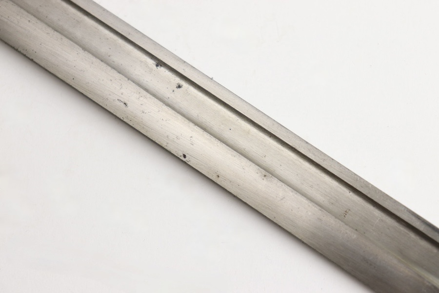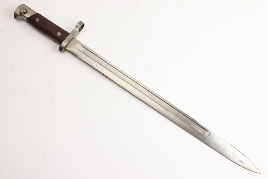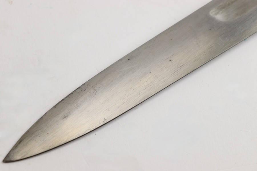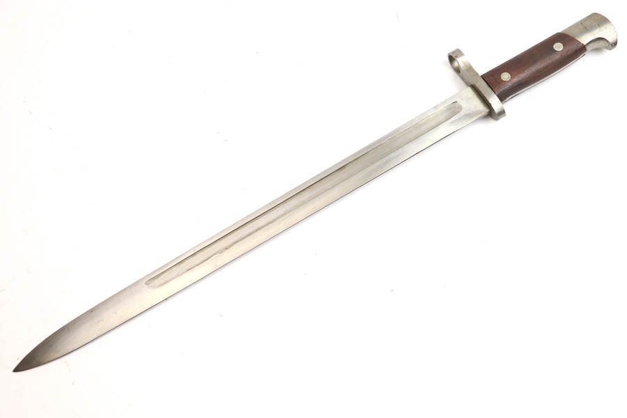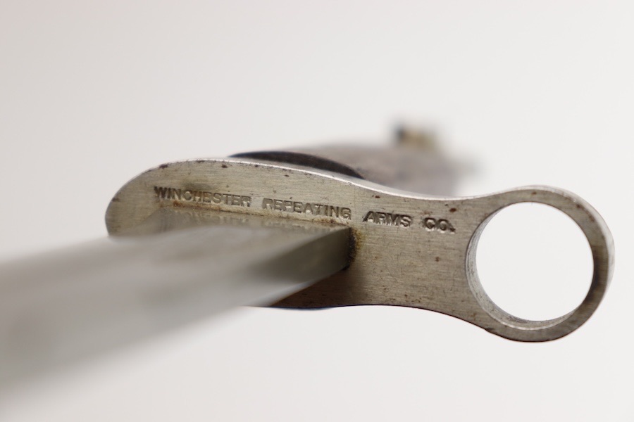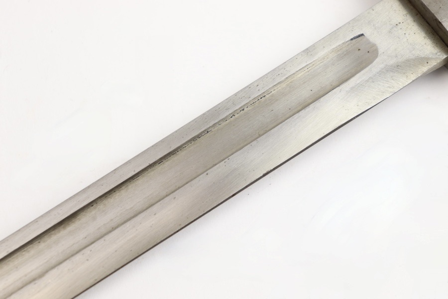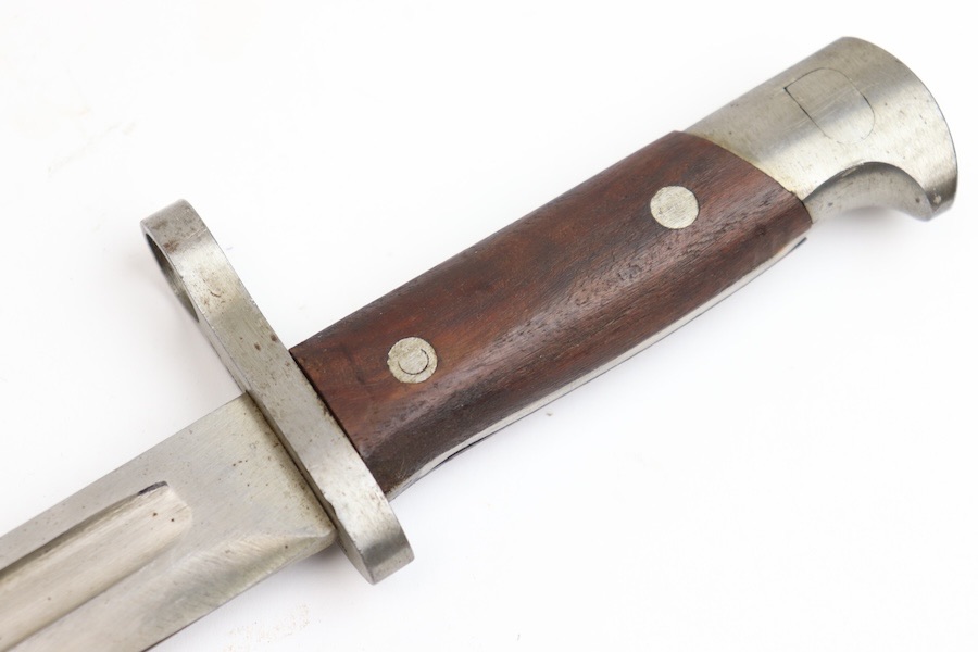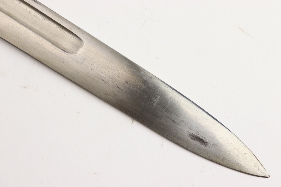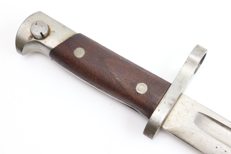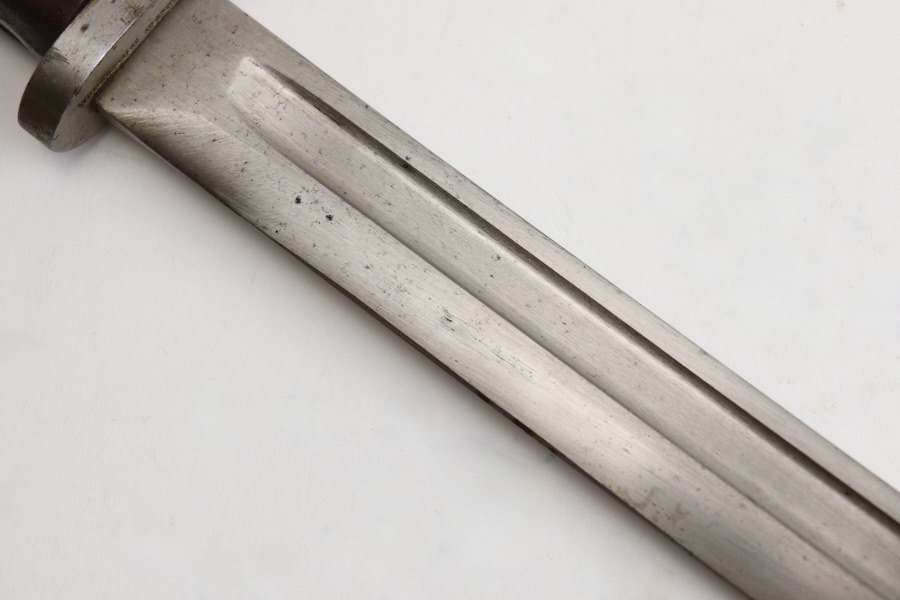 9/28/23 – This is a rare original Winchester M1895 Sword bayonet. The blade shows minor pin pricking of patina near the ricasso with rub marks down the fuller on both sides. The edge has not been sharpened. Maker stamp is on the top edge of the cross guard (Winchester Repeating Arms Co). Pommel and cross guard show minor pin pricking with no significant issues. Wood grips are mint condition with no wear or damage. Overall great condition and fairly uncommon bayonet. No scabbard included.