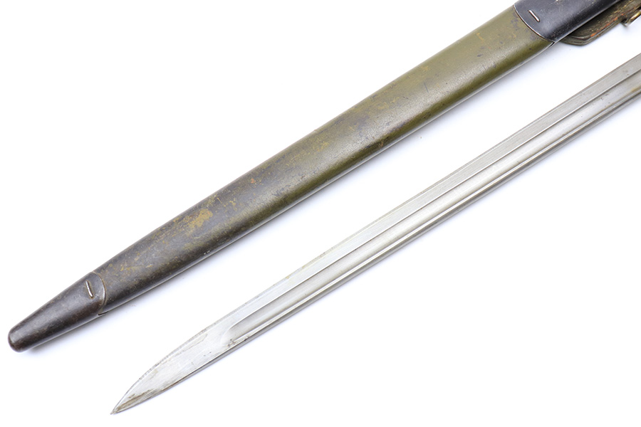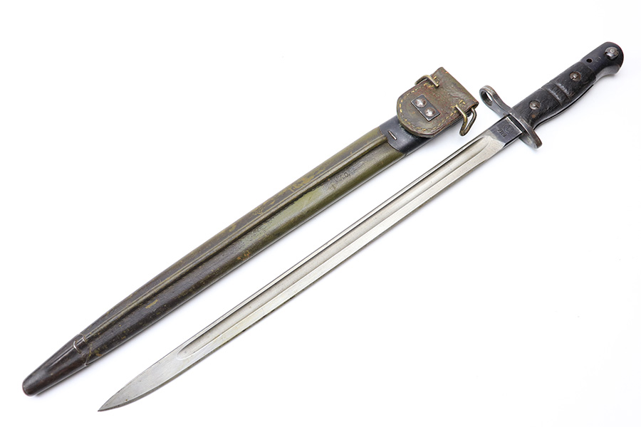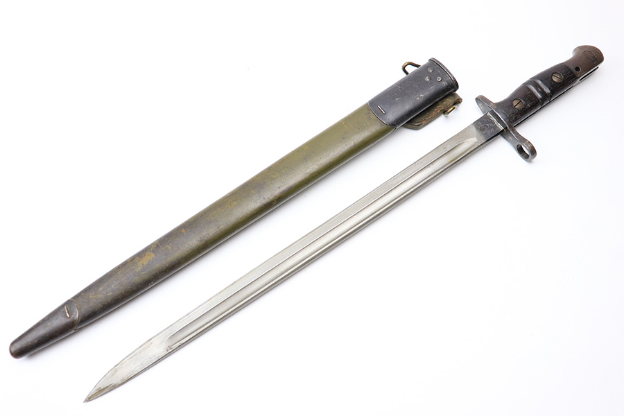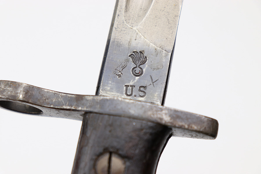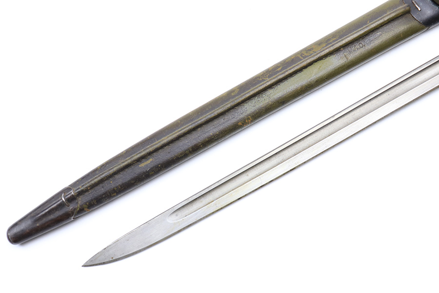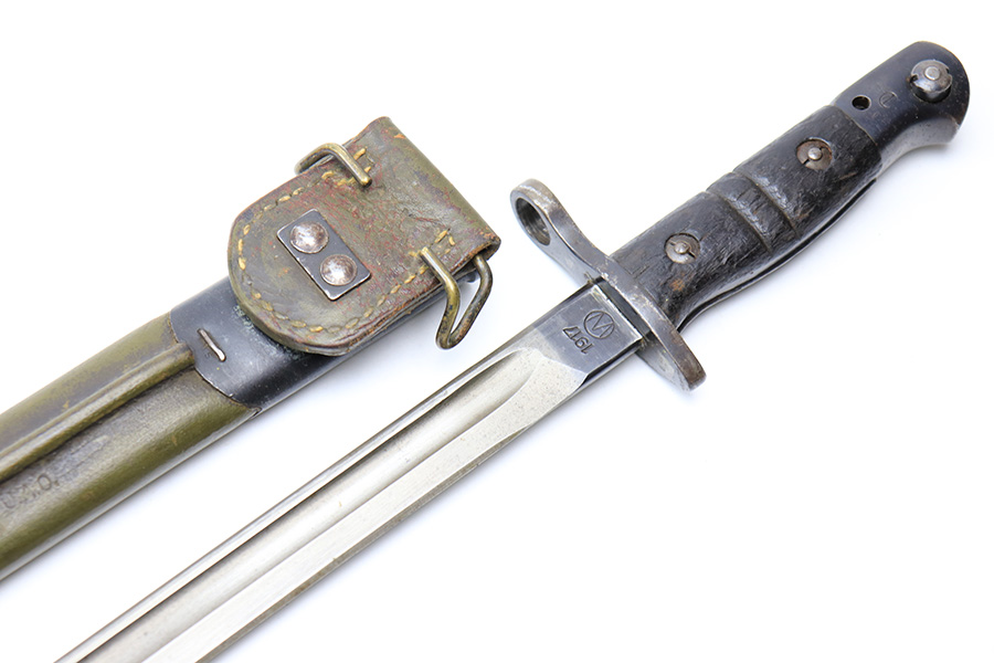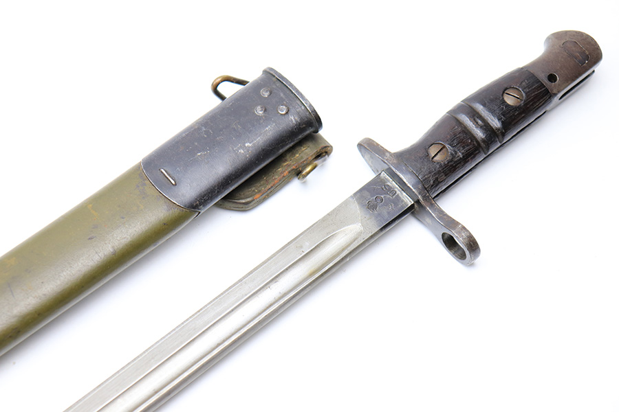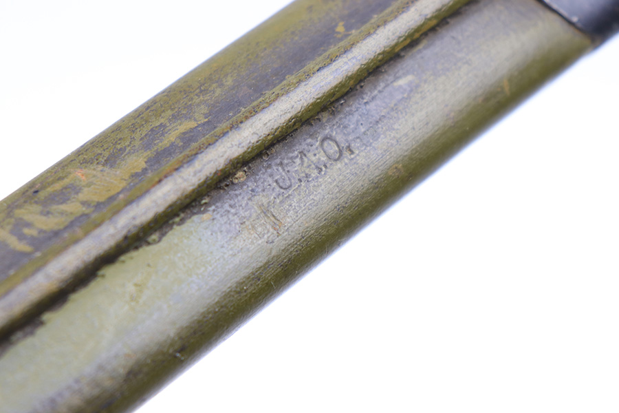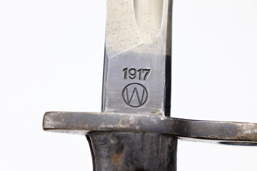 3/22/22 – This is an excellent condition WW1 production Winchester M1917 bayonet. These bayonets are often paired with Winchester Trench & Riot Shotguns. This example is in excellent condition with a clean blade and original, unpainted scabbard. The blade is maker stamped, dated, and ordnance stamped as shown. There’s no signs of sharpening and very minimal spots of discoloration. The hand guard and pommel both have surface wear and normal patina. No issues with the wood grips. The scabbard has some mild surface wear but is in excellent overall condition and still in its’ original configuration.