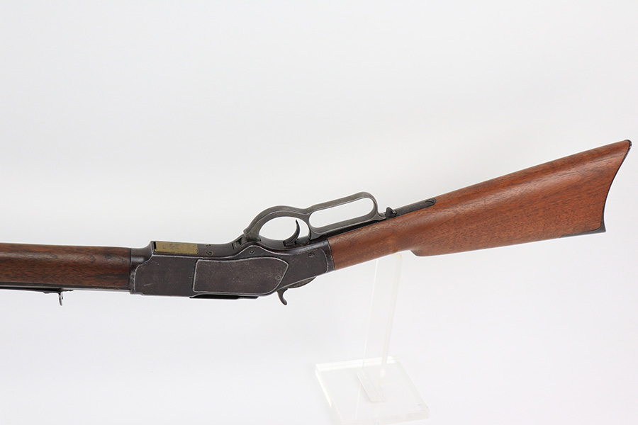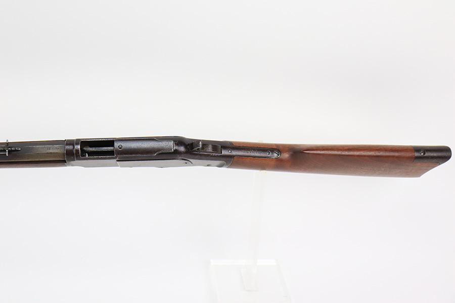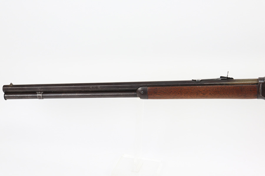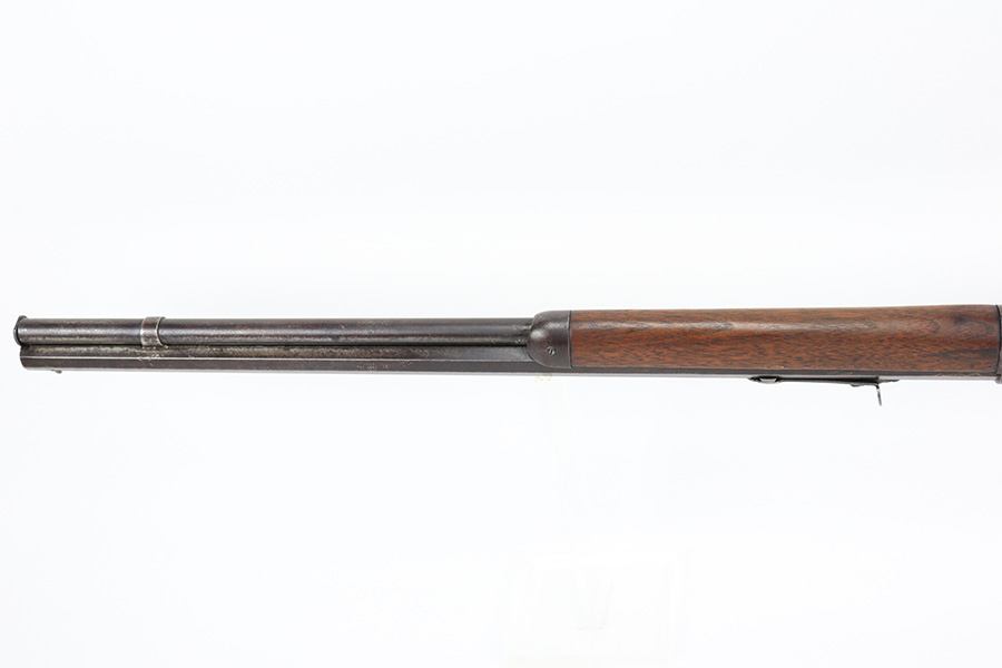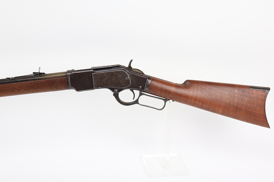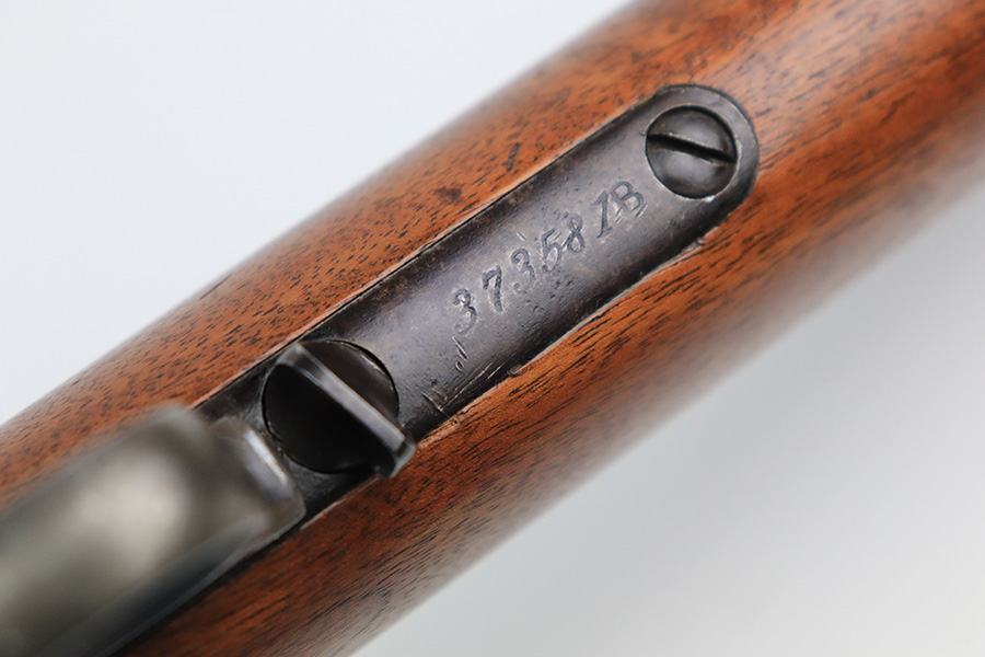5/5/22 – This is a Winchester Model 1873 lever action rifle manufactured in 1890. The gun is fully functional and in fair condition overall. There is noticeable heavy brown patina and spotty oxidation throughout. An area of discoloration on the barrel just behind the rear sight. There are some vice grip marks here and there along the barrel and a series of tiny dings on the brass floor plate. The magazine tube insert looks like it was replaced. The stock is minty but appears to have been sanded. The bore is poor – worn rifling with heavy pitting throughout.