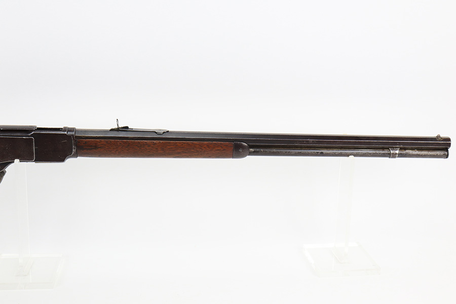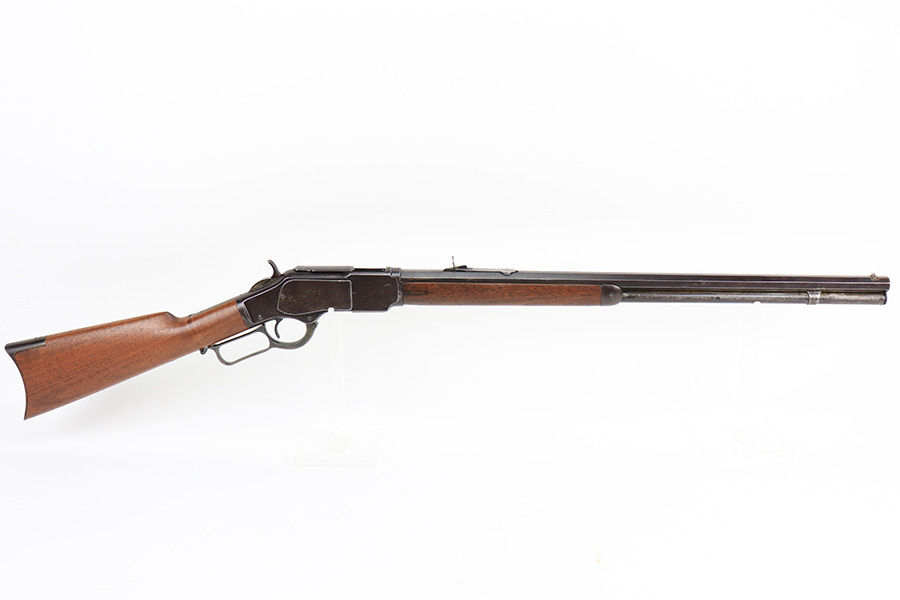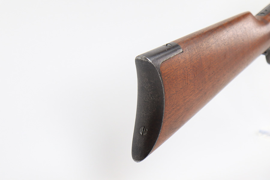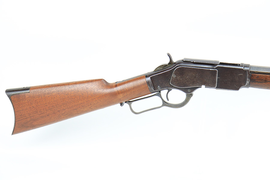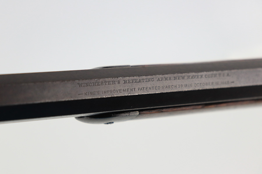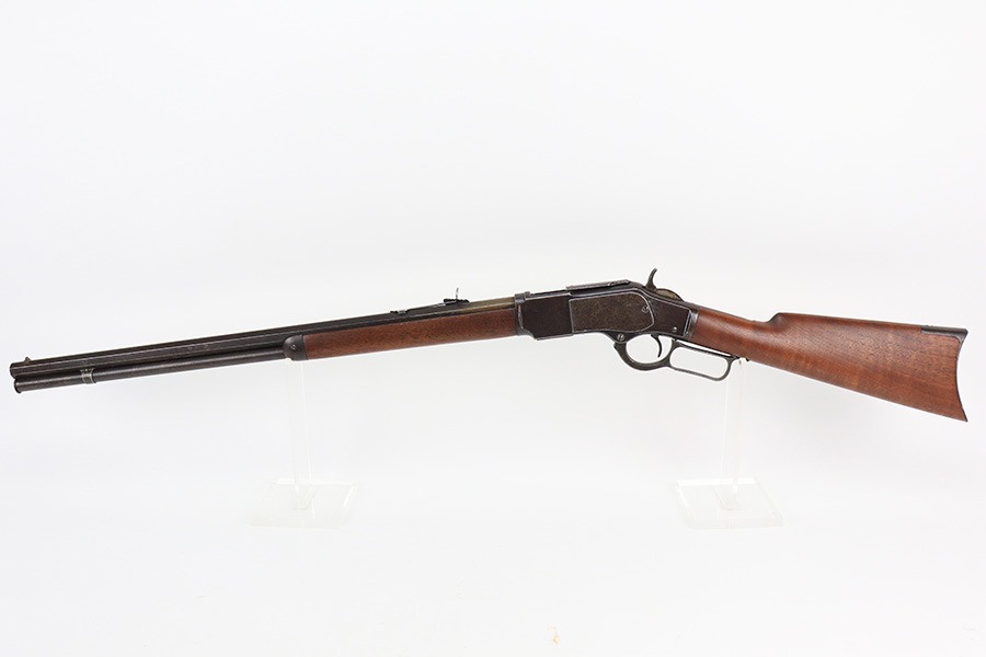 5/5/22 – This is a Winchester Model 1873 lever action rifle manufactured in 1890. The gun is fully functional and in fair condition overall. There is noticeable heavy brown patina and spotty oxidation throughout. An area of discoloration on the barrel just behind the rear sight. There are some vice grip marks here and there along the barrel and a series of tiny dings on the brass floor plate. The magazine tube insert looks like it was replaced. The stock is minty but appears to have been sanded. The bore is poor – worn rifling with heavy pitting throughout.