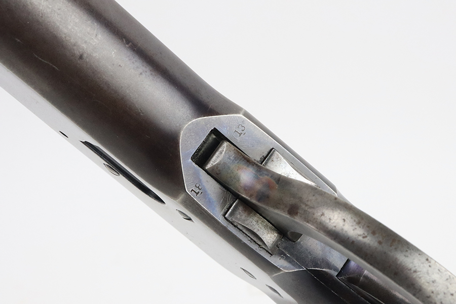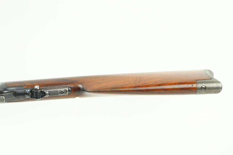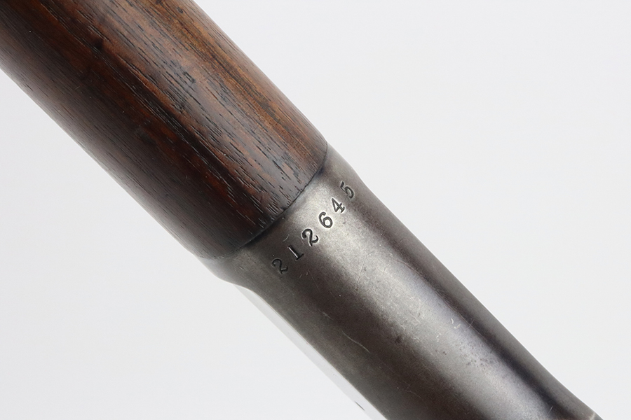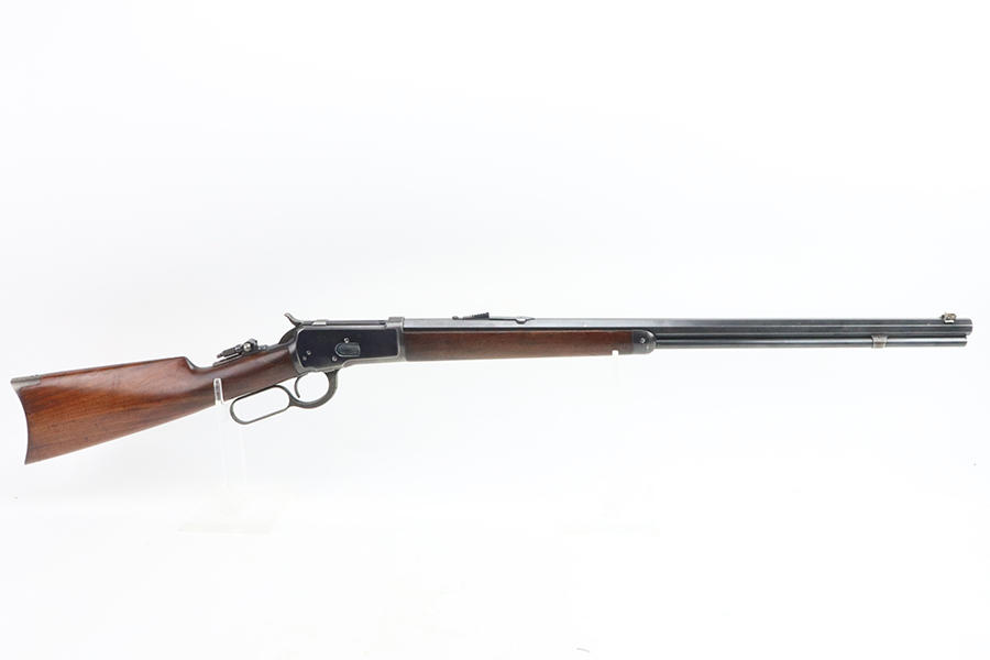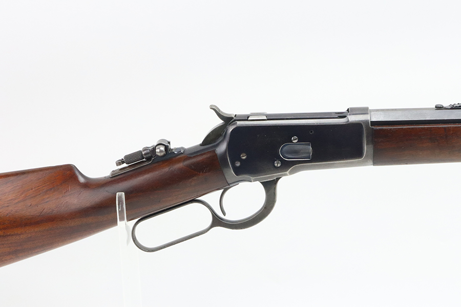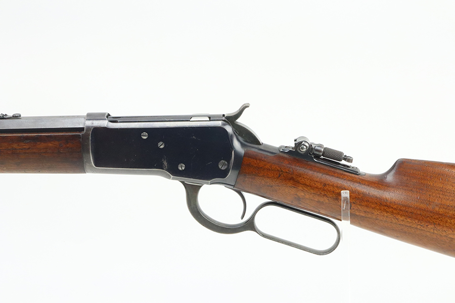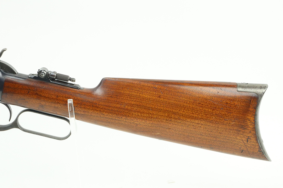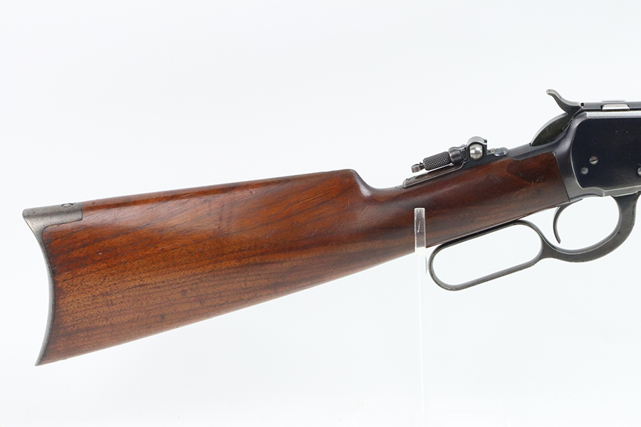 4/4/24 – This is a very nice example of a Winchester Model 1892 lever action rifle, manufactured in 1903 and chambered in .32 WCF. Equipped with a peep-style adjustable rear sight. The metal parts have retained somewhere between 85-90% of their original high polish finish. There is general high edge wear, but most of the finish loss is on the underside of the receiver. Some light scratches and handling marks on the receiver as well. Very nice wood furniture overall, but there are light scratches and bruises throughout. Excellent bore with great rifling.