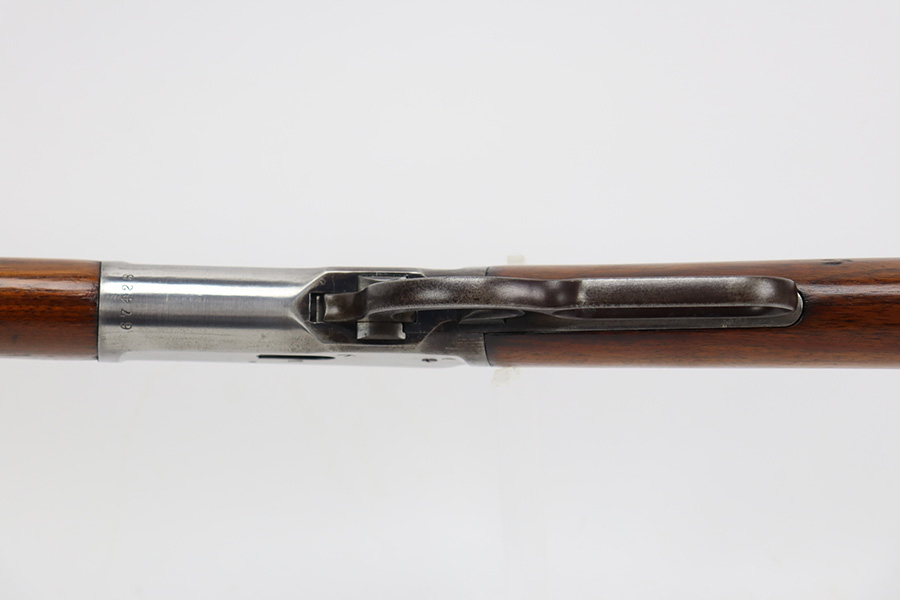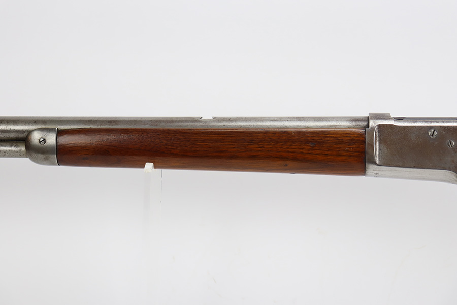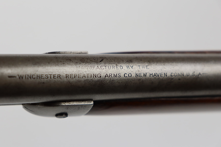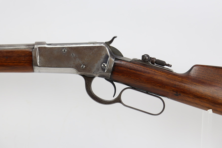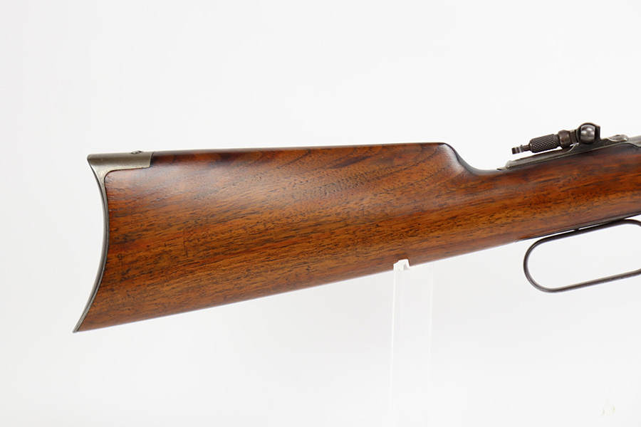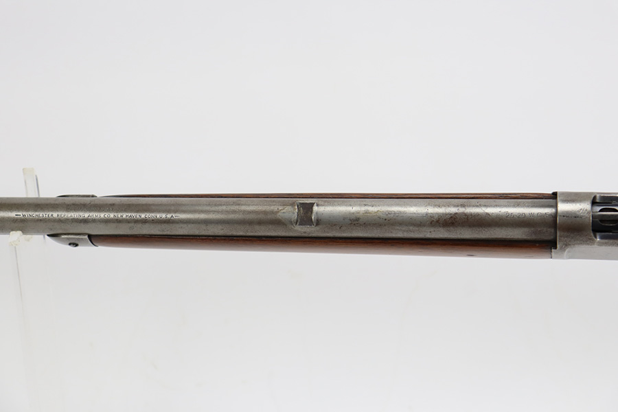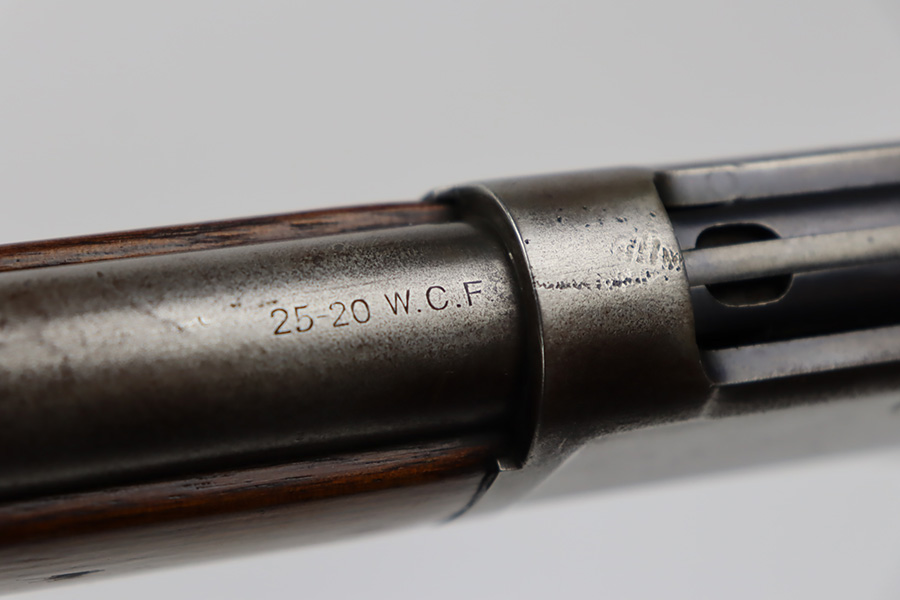 9/29/23 – This is a Winchester Model 1892 lever action rifle, manufactured in 1894 and chambered in .25-20 WCF. It is matching and has a peep-style rear sight. The bluing is virtually all gone with obvious finish loss and spotty brown patina throughout. Some areas of tiny pitting here and there, most noticeable on the receiver. Excellent wood furniture. The bore has good rifling with minor pin-pricking throughout.