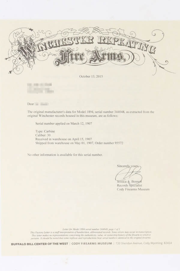 SOLD – Winchester Model 1894 w/ Letter & Leather Scabbard – 1907 mfg