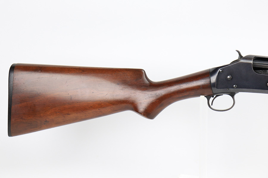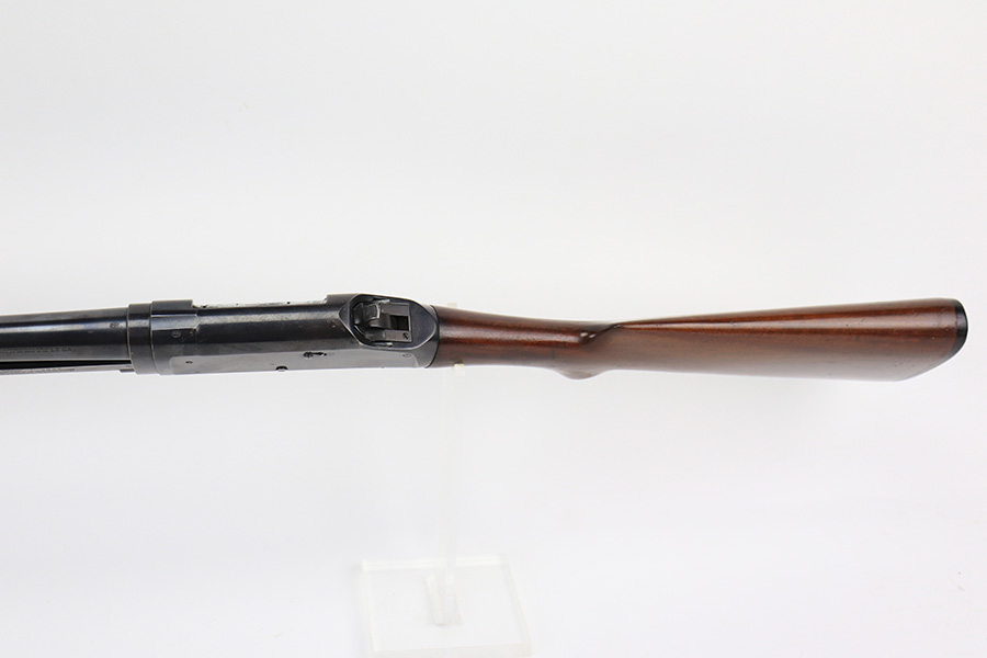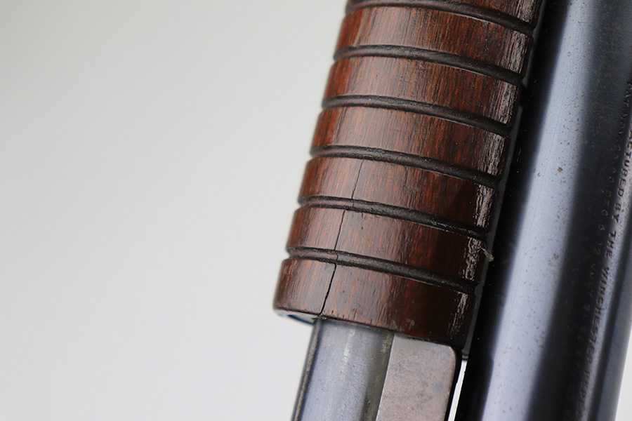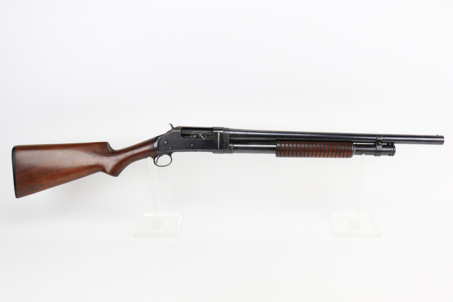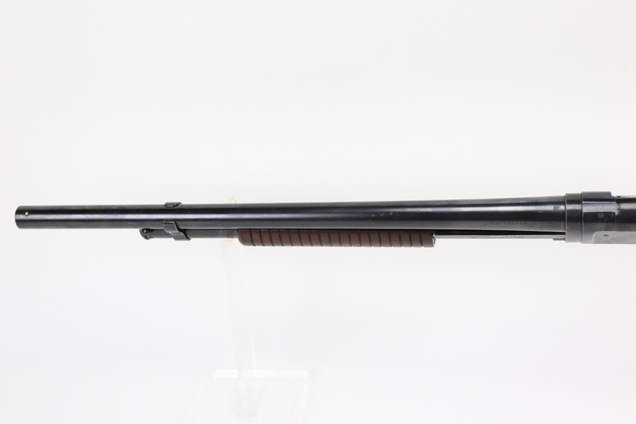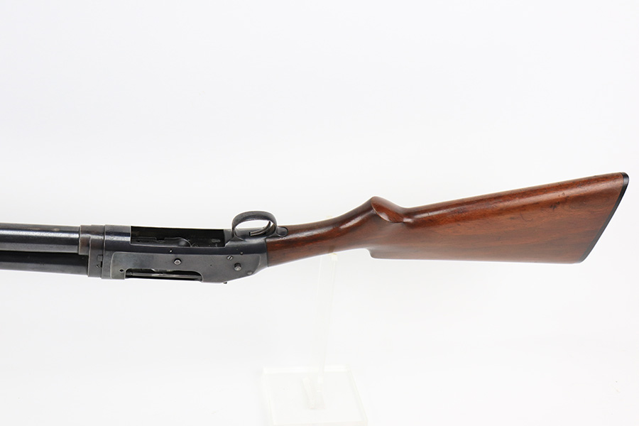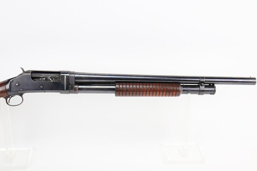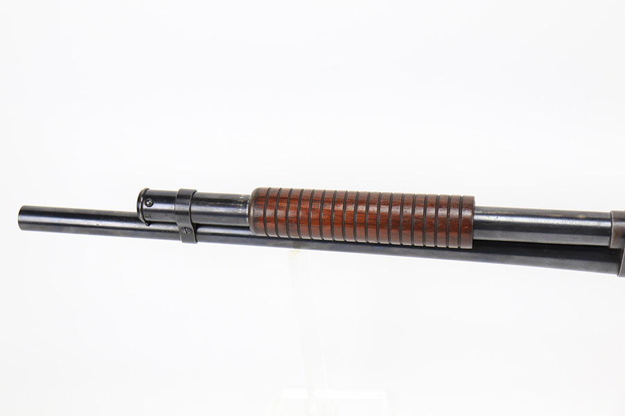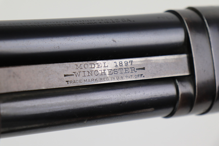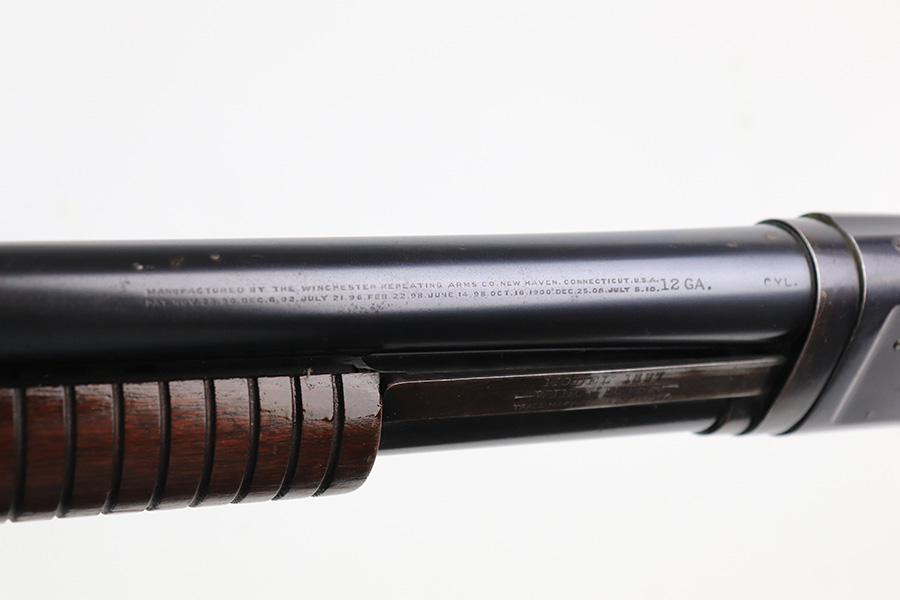4/22/22 – This is an all original and correct Winchester 1897 riot shotgun. Likely it was being made for WW1 but then the war ended so it was sold into the commercial market in 1918. The original finish rates at around 85% with standard age, but not corrosion on the metal. The stock is beautiful considering its age and has the early high comb on the top of the stock. The gun functions very well and will work well for sport shooting, hunting, or just for display as a fine piece of Winchester history. The barrel is marked “Cylinder bore” to show that it was made as a riot gun and not a cut down shotgun. Excellent example of a Model 1897 Riot Shotgun.