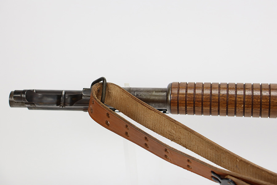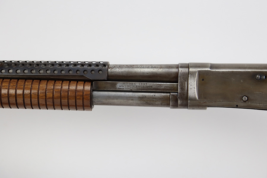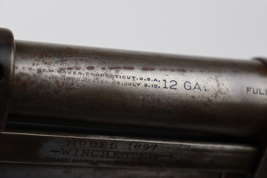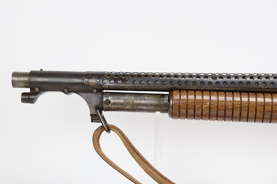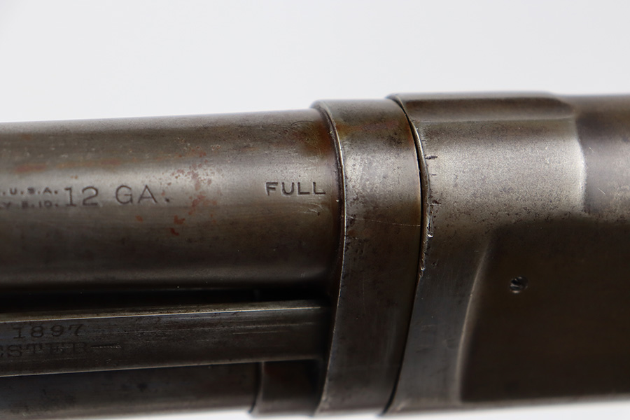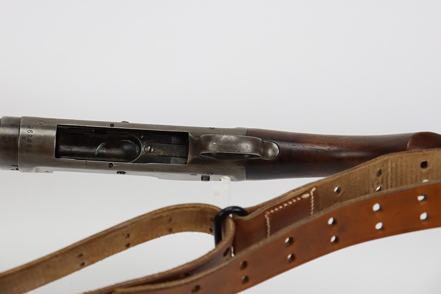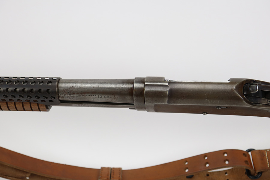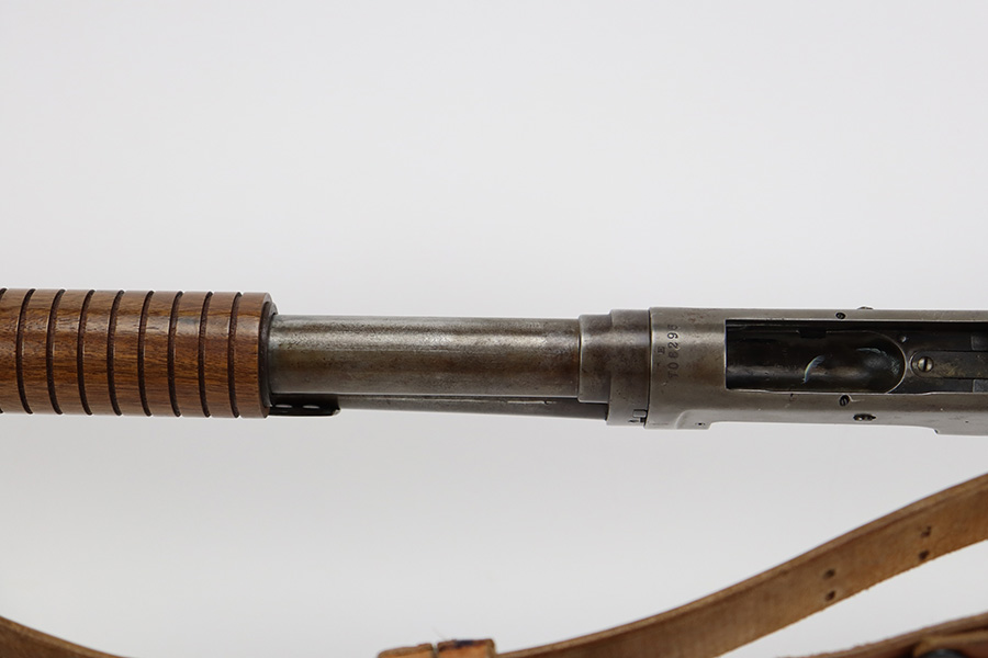 9/29/23 – This is a nice Winchester Model 1897 Trench Gun Build. The serial number on the gun itself dates to about 1922 and is outside the accepted serial range for guns of this configuration. The heat shield, wood forend, and leather sling are reproduction and were added later. The gun itself has lost nearly all of its finish with spotty brown patina throughout. Some discoloration on the heat shield. There are a couple of holes drilled into the end of the magazine tube. Excellent wood furniture. The bore has spotty surface oxidation and pitting.
