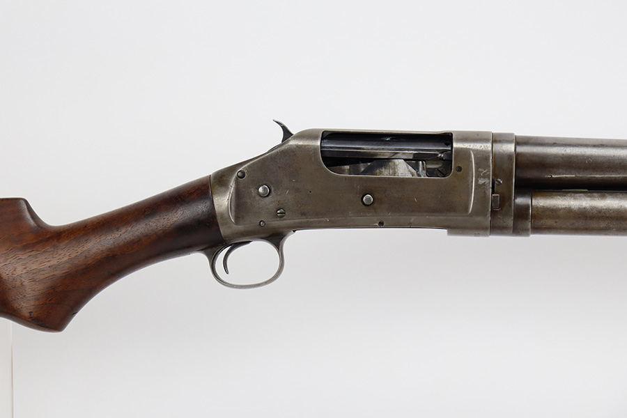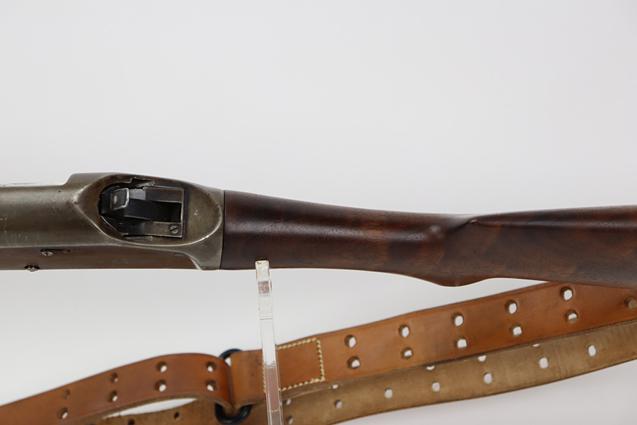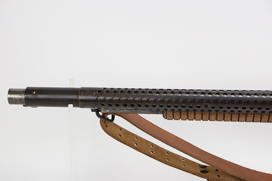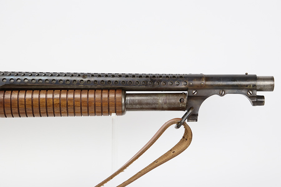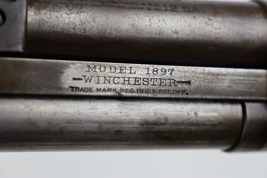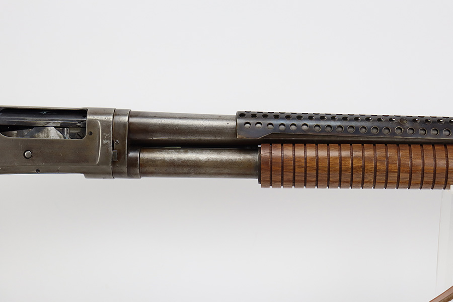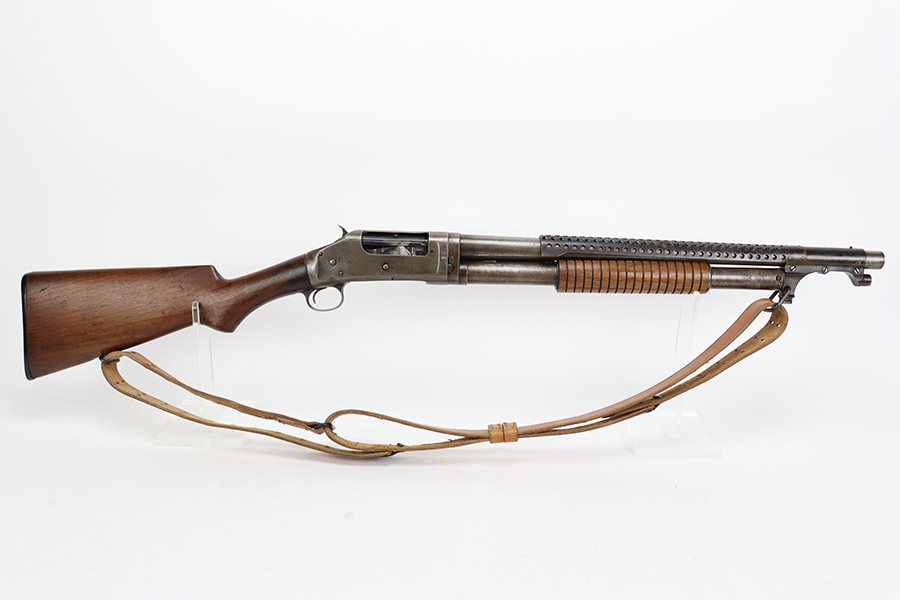 9/29/23 – This is a nice Winchester Model 1897 Trench Gun Build. The serial number on the gun itself dates to about 1922 and is outside the accepted serial range for guns of this configuration. The heat shield, wood forend, and leather sling are reproduction and were added later. The gun itself has lost nearly all of its finish with spotty brown patina throughout. Some discoloration on the heat shield. There are a couple of holes drilled into the end of the magazine tube. Excellent wood furniture. The bore has spotty surface oxidation and pitting.