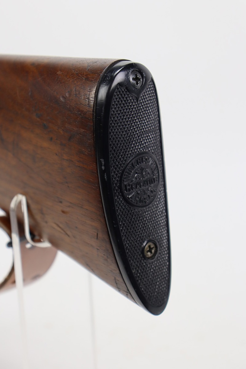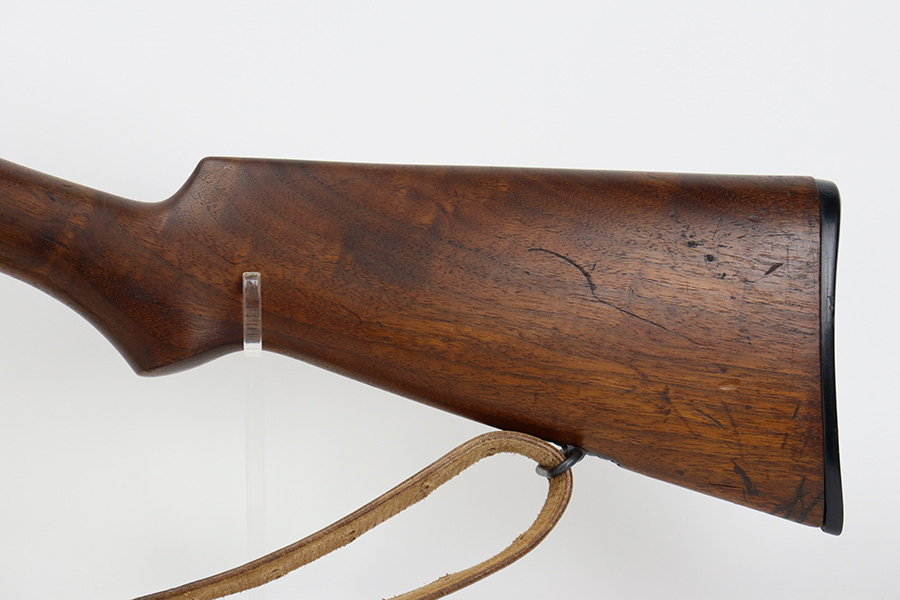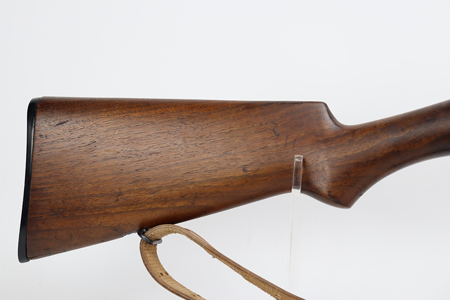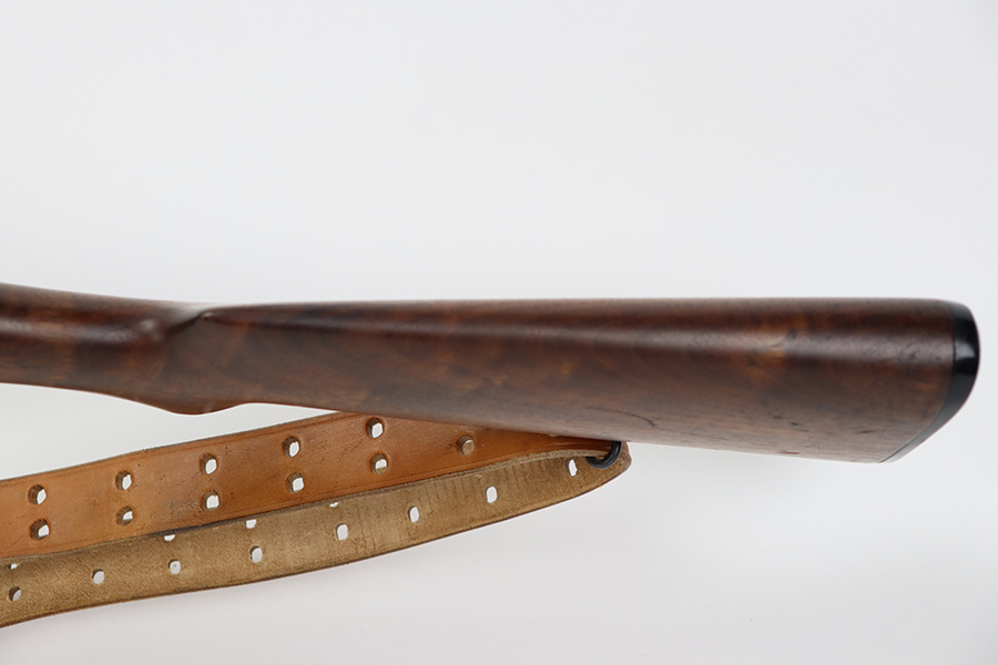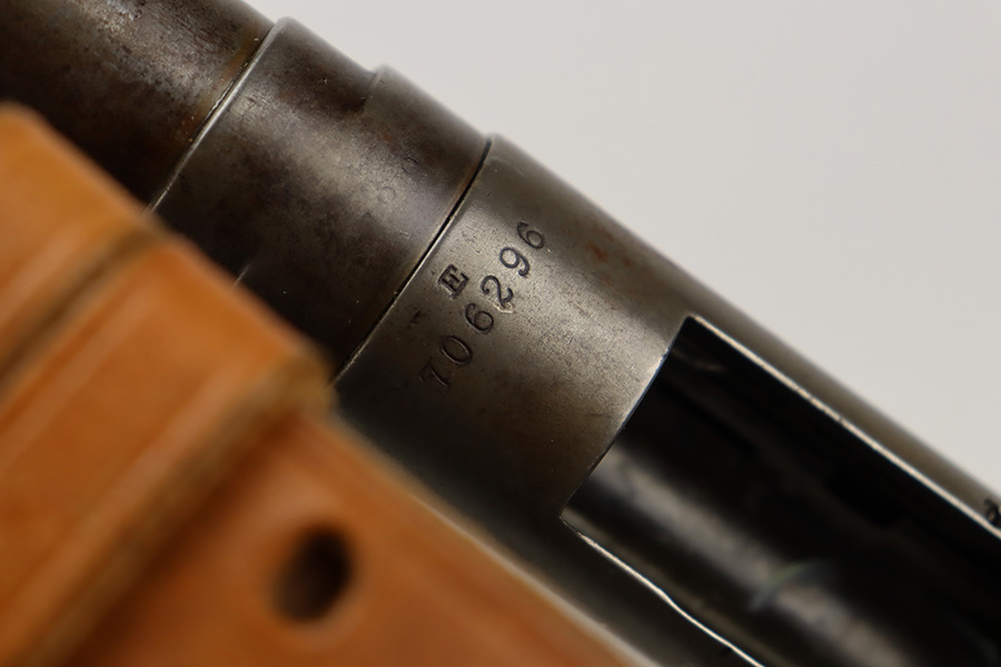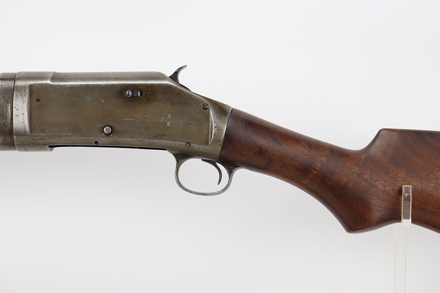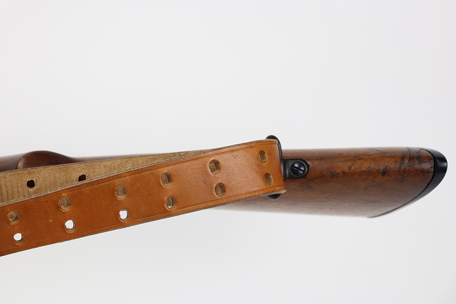 9/29/23 – This is a nice Winchester Model 1897 Trench Gun Build. The serial number on the gun itself dates to about 1922 and is outside the accepted serial range for guns of this configuration. The heat shield, wood forend, and leather sling are reproduction and were added later. The gun itself has lost nearly all of its finish with spotty brown patina throughout. Some discoloration on the heat shield. There are a couple of holes drilled into the end of the magazine tube. Excellent wood furniture. The bore has spotty surface oxidation and pitting.