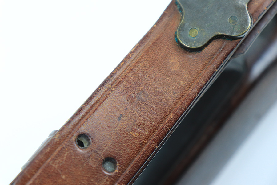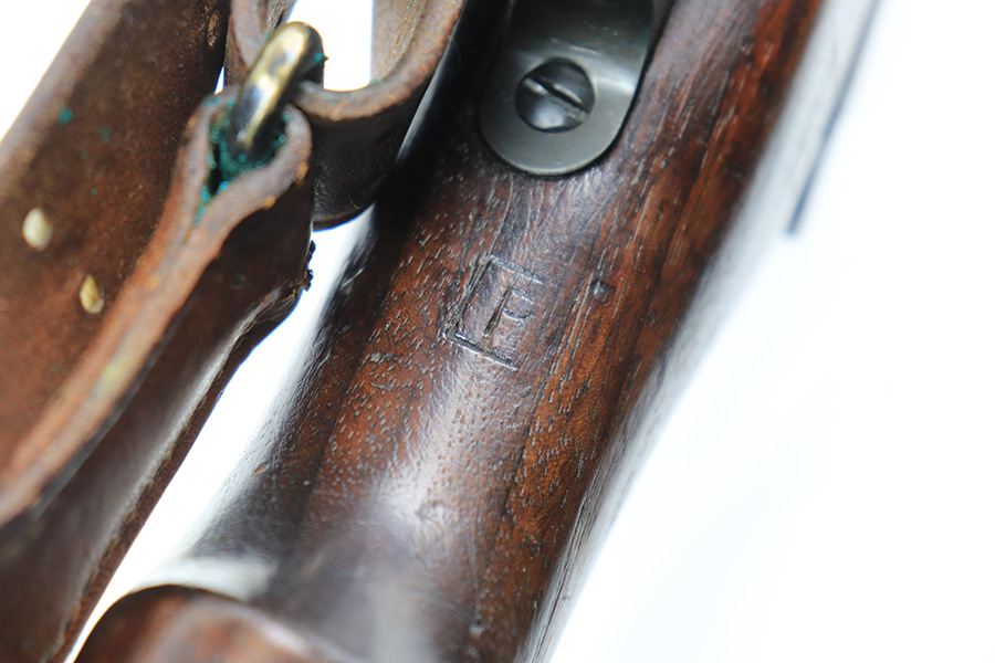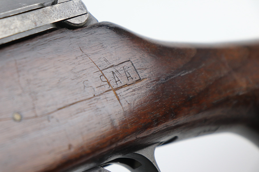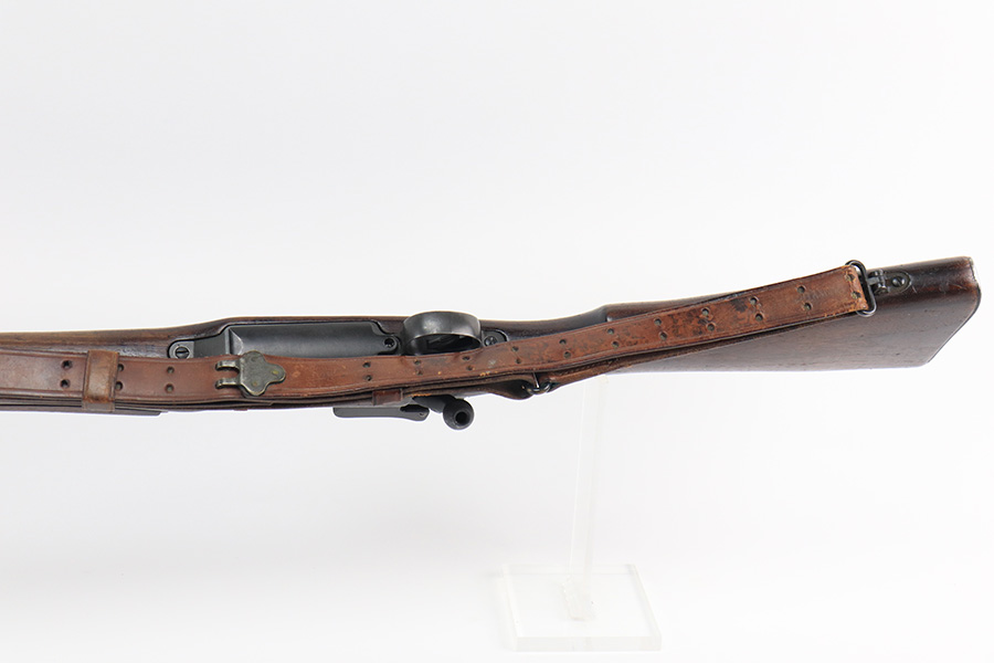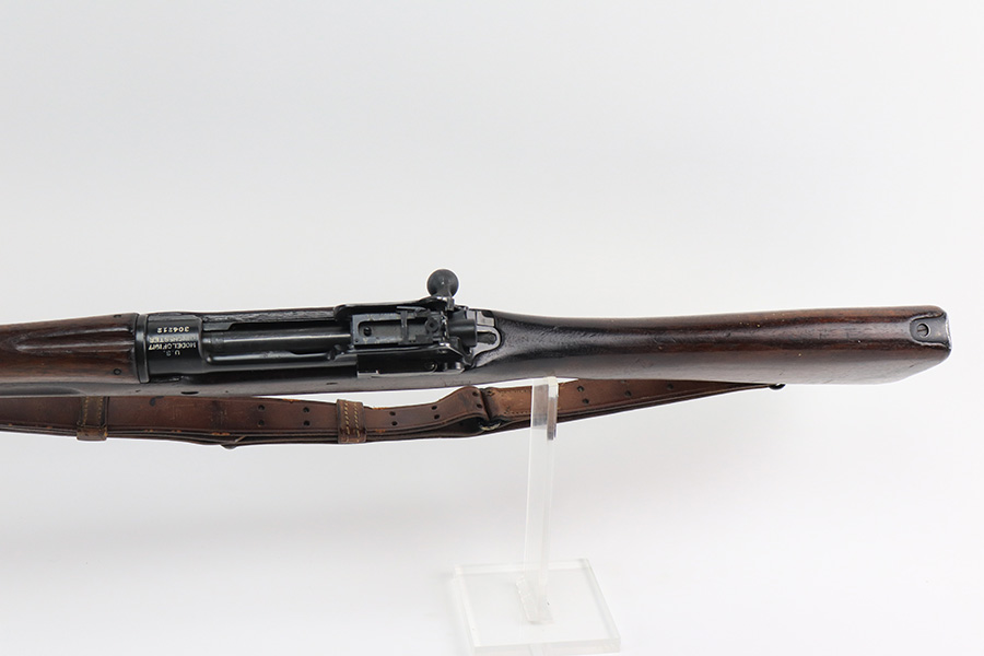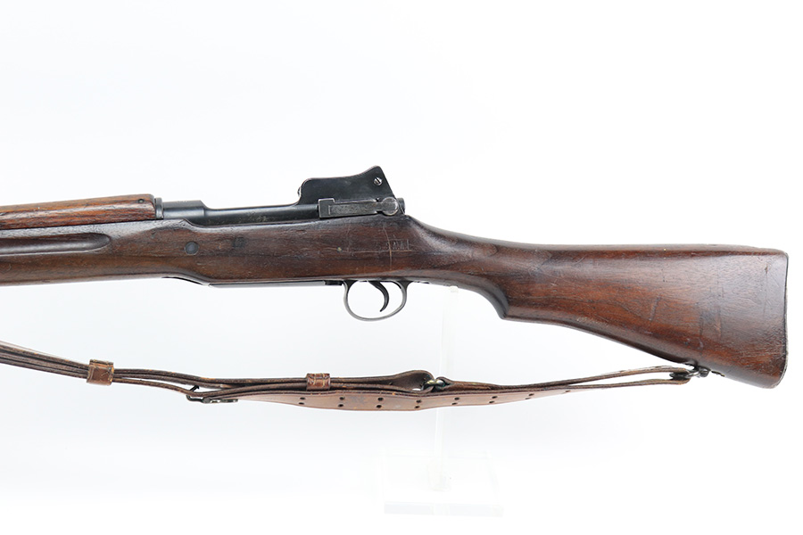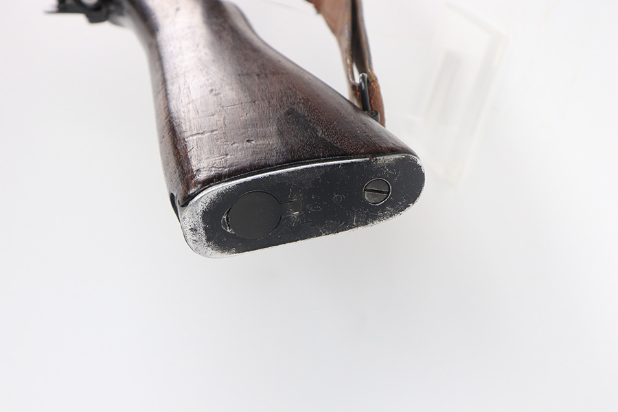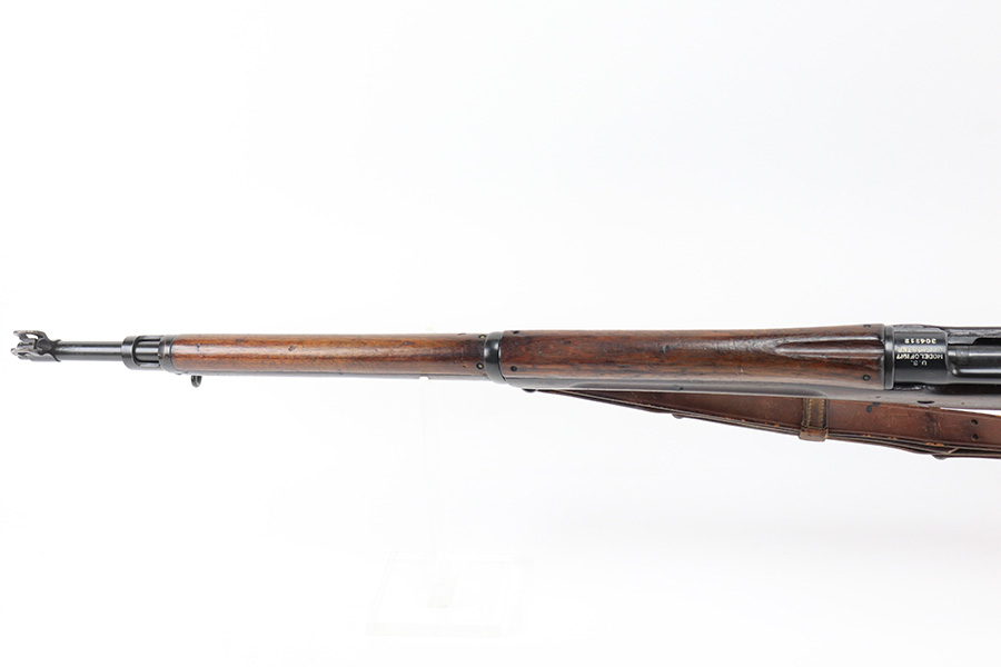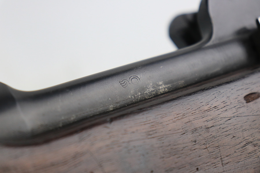 12/9/21 – This is a nice Winchester M1917 rifle from the end of WWI. It was arsenal re-worked to some extent based of the square P and S-S.A.A. markings on the stock, but appears to be Winchester parts throughout. ‘W’ marking on bolt, bayo lug, front sight, receiver and barrel. Barrel is dated to June of 1918. Military flaming bomb on receiver. The finish is in great shape but likely refurbished at the arsenal. Bore has strong rifling but some frost throughout. Comes with original sling that is dated 1918 and maker marked.