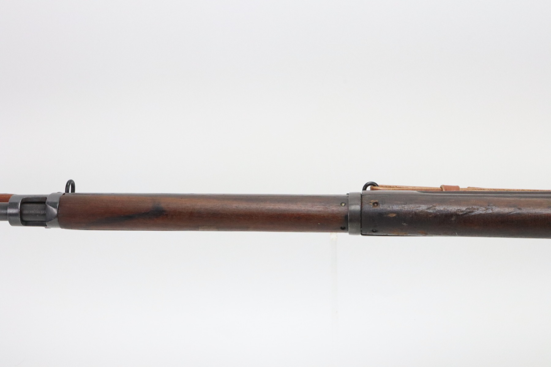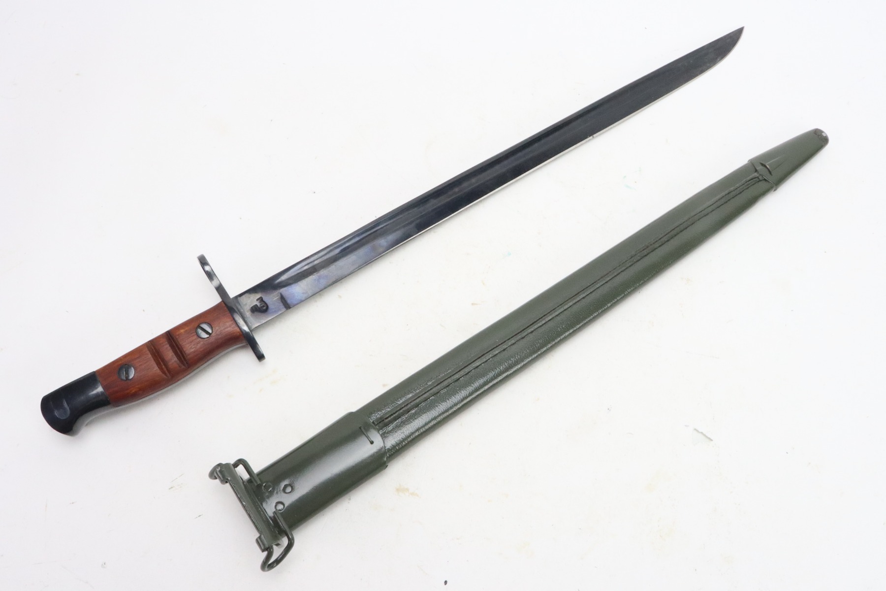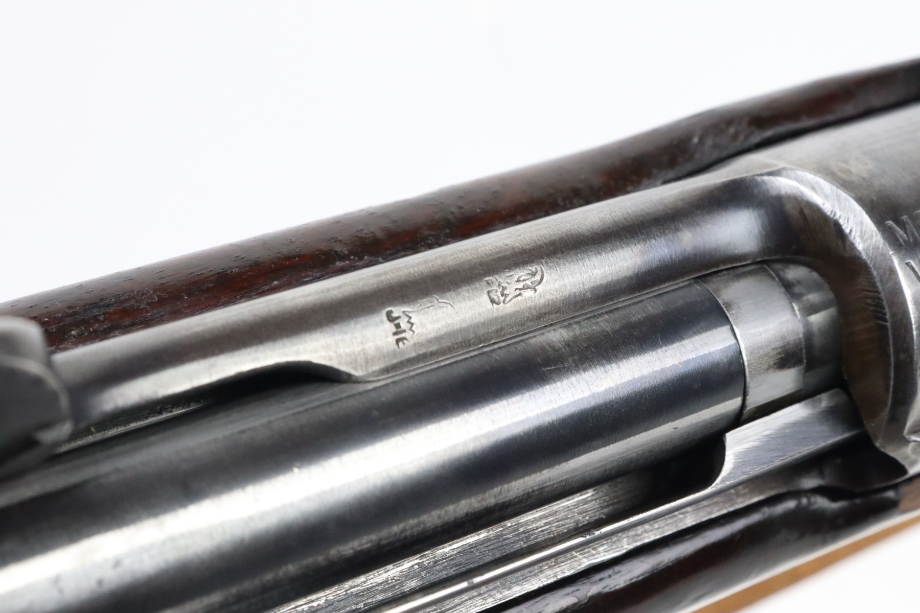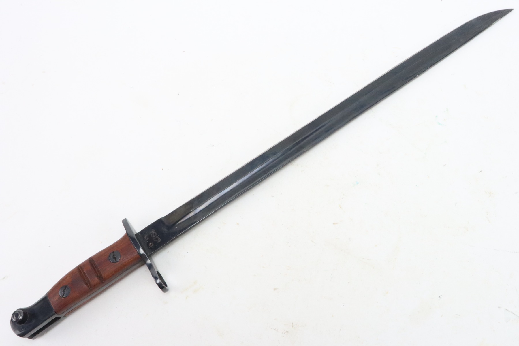 04/09/2024 – For sale is a US Model 1917 made by Winchester in 1918. The rifle is heavily worn but in good condition. Many parts of the receiver and bolt handle are worn down to bare metal. The rest of the rifle retains some of its bluing or instead has patina. The bore is in good shape but is on the darker side with good rifling. The side of the stock is stamped with what looks like a RGM-K in a box. The rifle comes with a repro bayonet and sling.