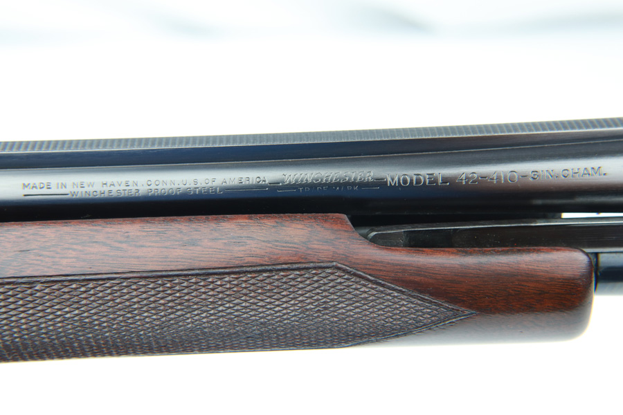 11/8/18 – This is an original, near mint condition Winchester model 42 .410 shotgun. The shotgun has beautiful bluing, with the only bluing loss being from sliding the forearm along the magazine tube. The receiver has a few VERY light surface marks as well. Beautiful cherry wood stock and forearm are minty. The bore is excellent and minty as well. Made in 1950, guaranteed all original and fully functional.