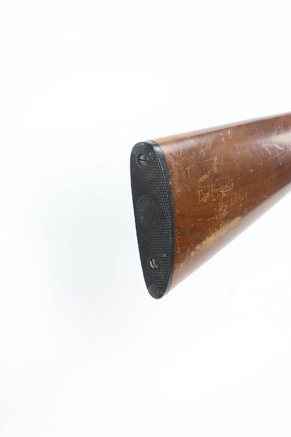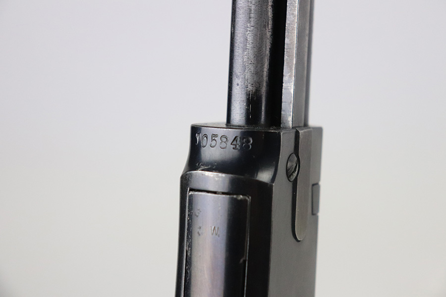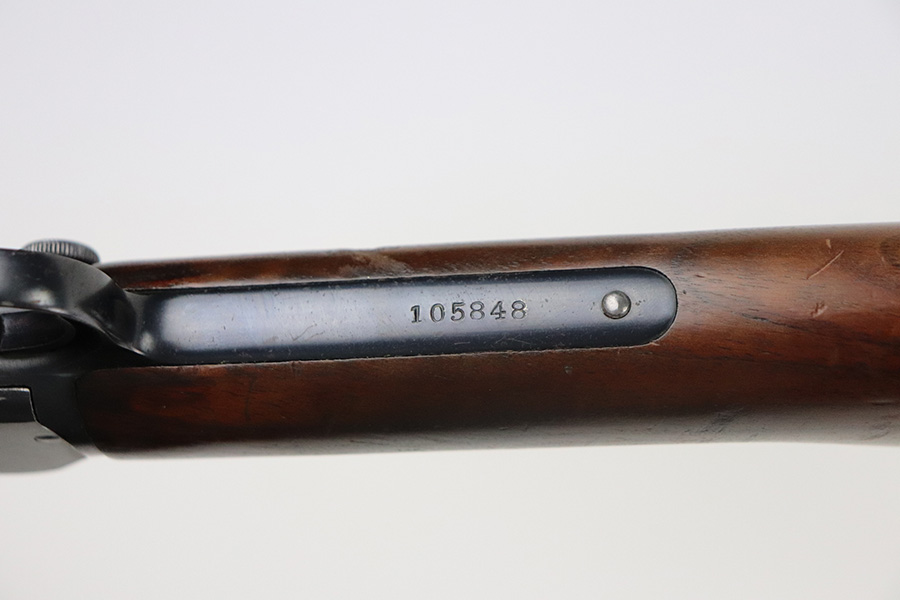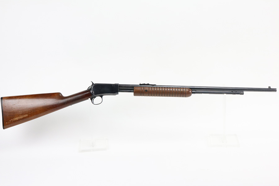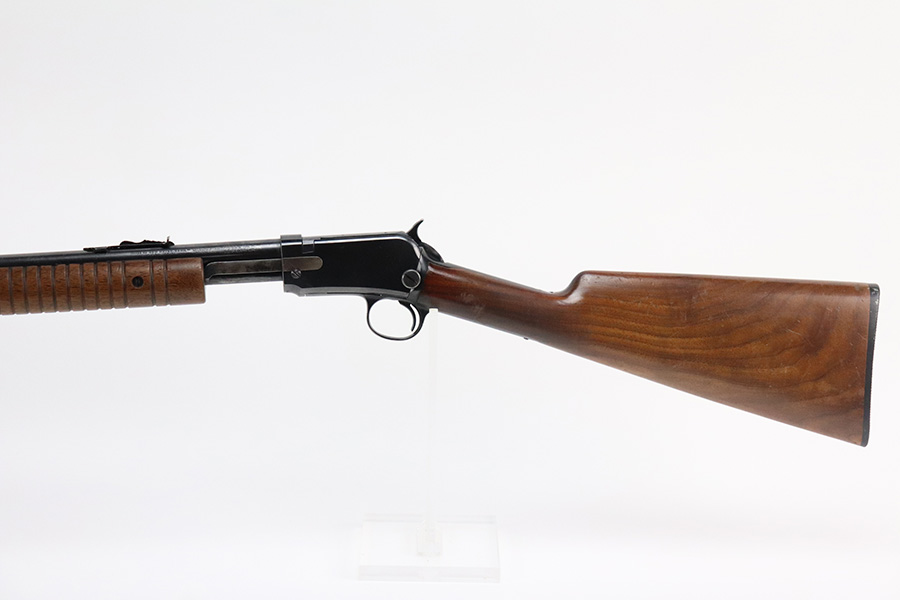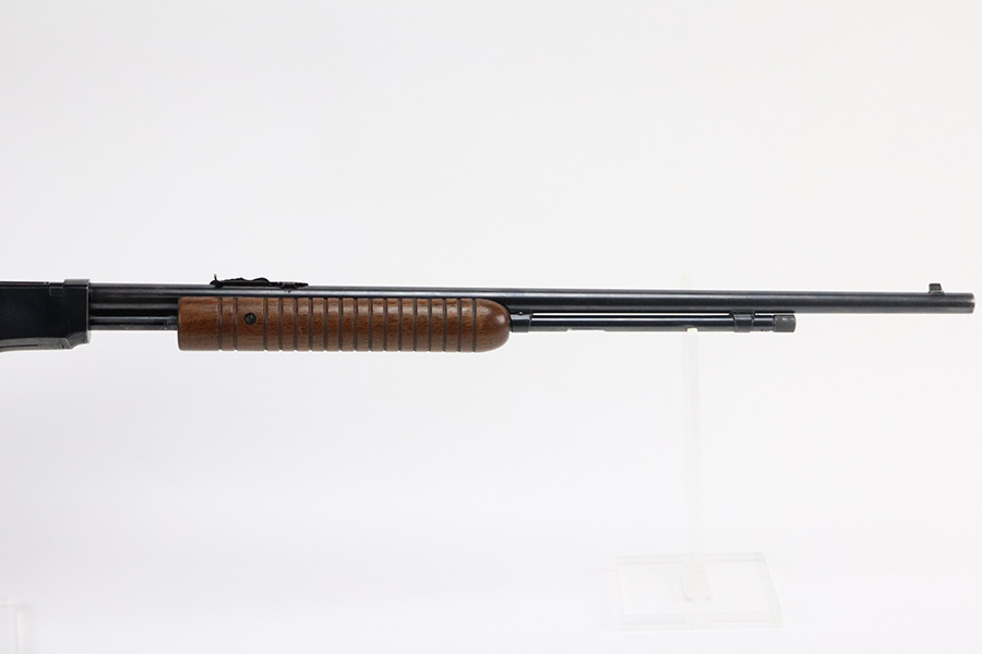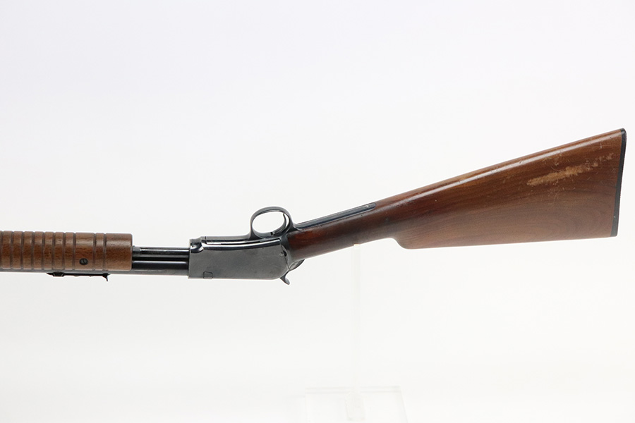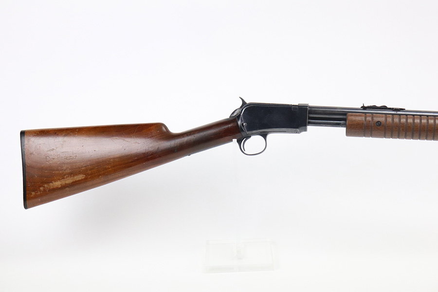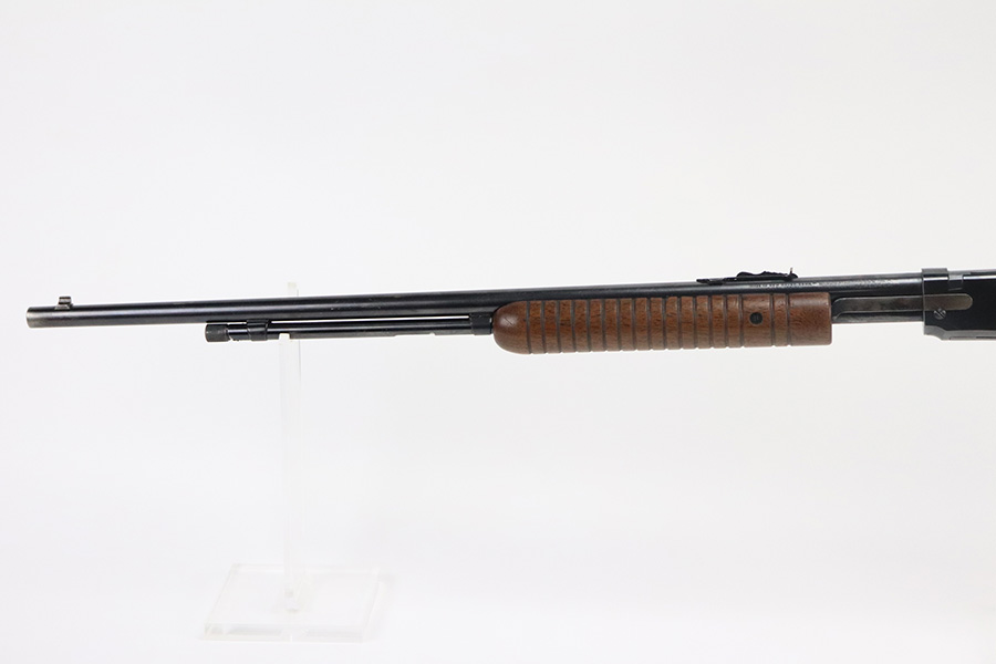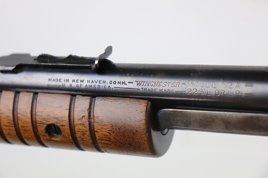 6/30/21 – This is a very nice example of a Winchester Model 62A pump action rifle, manufactured in 1940. The gun is all matching and has the proper Winchester proofs. It has retained most of its high polish finish. Most of the wear is scratchy on the barrel and minor wear around the muzzle. There is very minor wear on the high edges of the receiver and small handling marks here and there. The stock has areas of light scratching throughout and a name scratched into the right side of the butt stock. Mint bore.