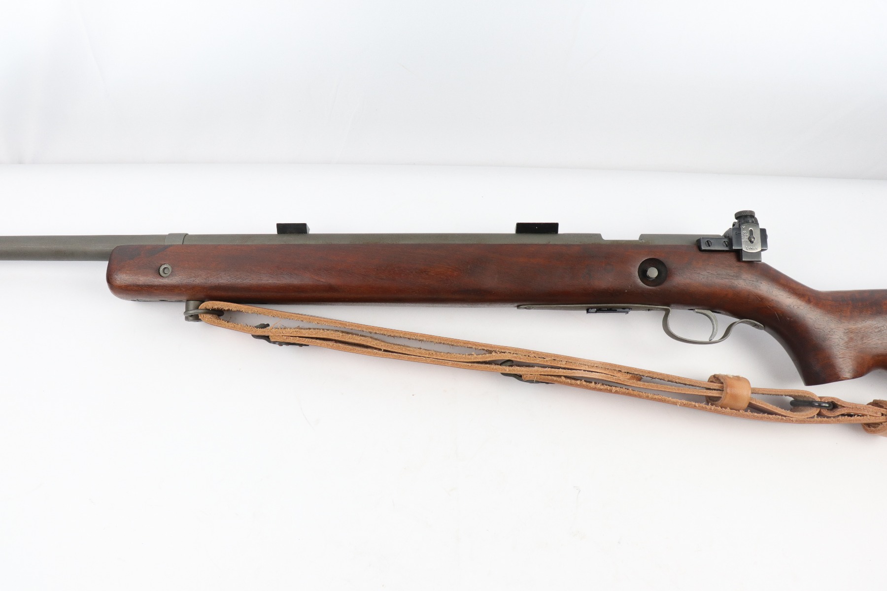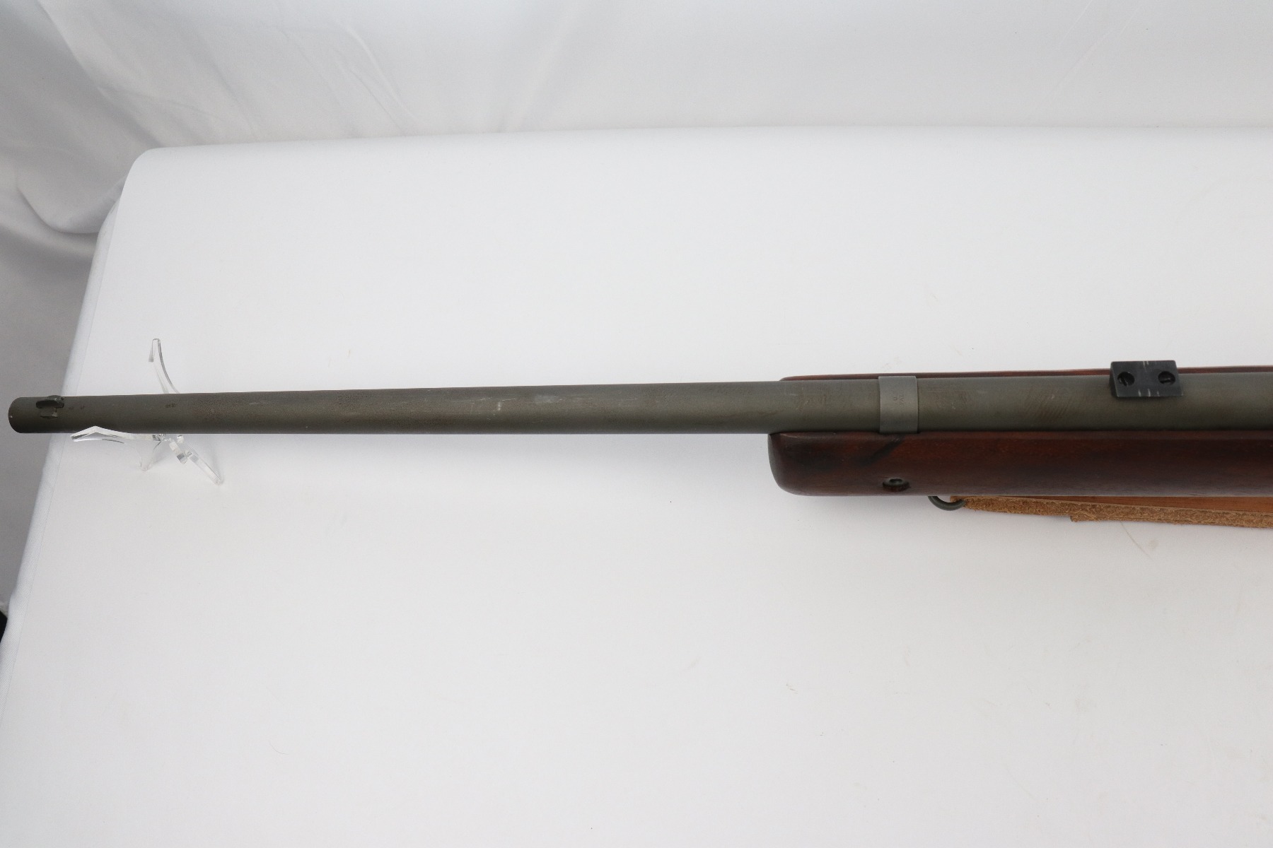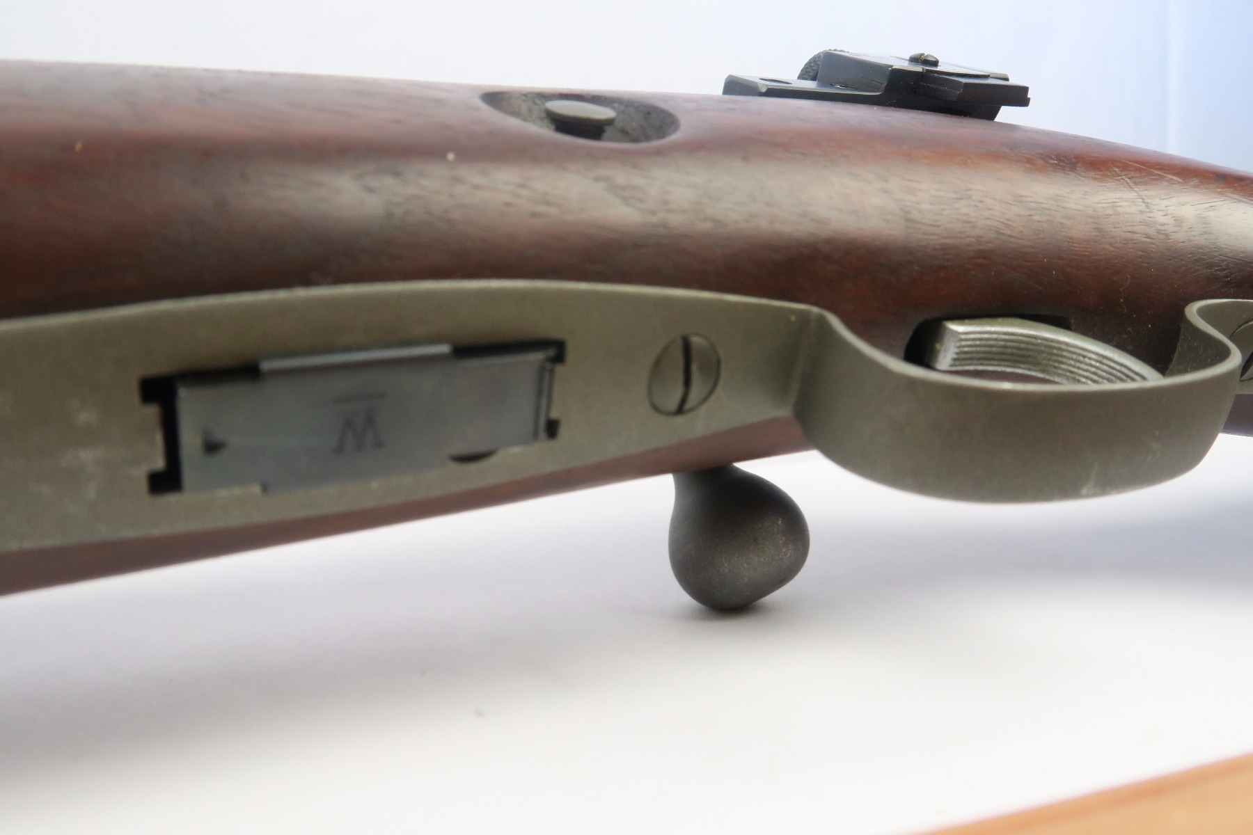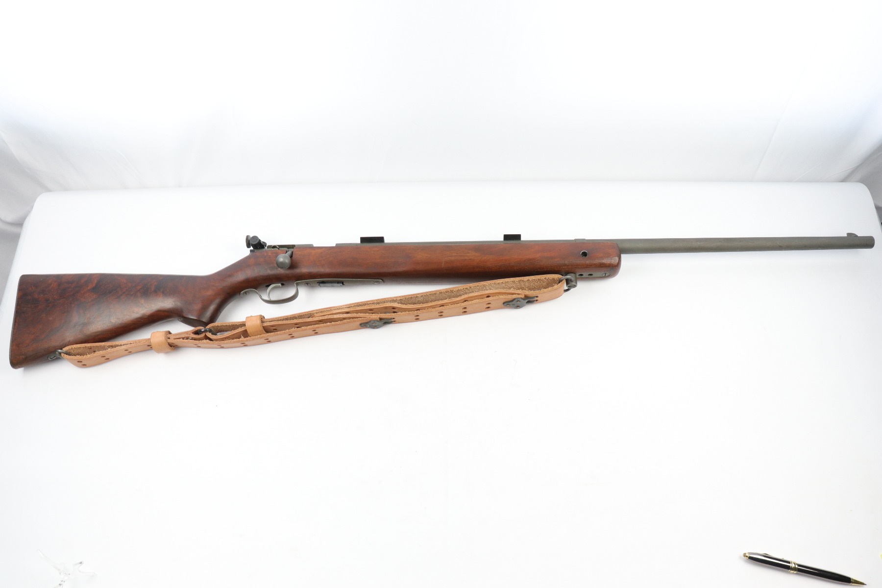 3/13/18 – This is a .22 Caliber Winchester model 75 training rifle, built at the end of or immediately after WW2. The rifle is phosphate finished metal with a beautiful like-new condition stock. The stock is marked “TE” which is an arsenal stamp – and there is no cartouche. The underside of the stock has a “P” stamp. This tells me that the rifle was sent to an arsenal to get fitted with a new stock. The metal on the rifle is lightly worn though – one can see light brown speckling on the barrel – we tried to show this in photos. The action is very smooth and the bore is nice. There is strong rifling and minimal wear/residue in the bore. The rifle comes with a minty arsenal strap ink stamped “MRT” and there’s a “W” marked original Winchester magazine included. The rifle has a Lyman rear sight mounts for a scope if one desired to attach an optic. Guaranteed original.