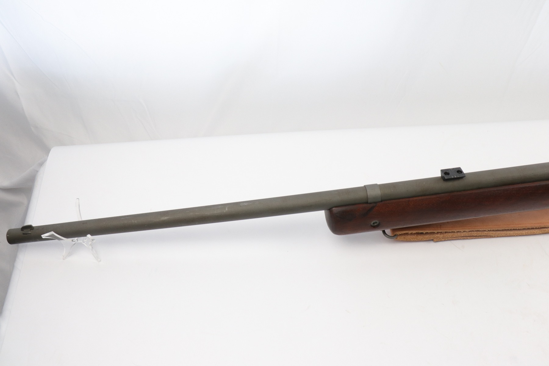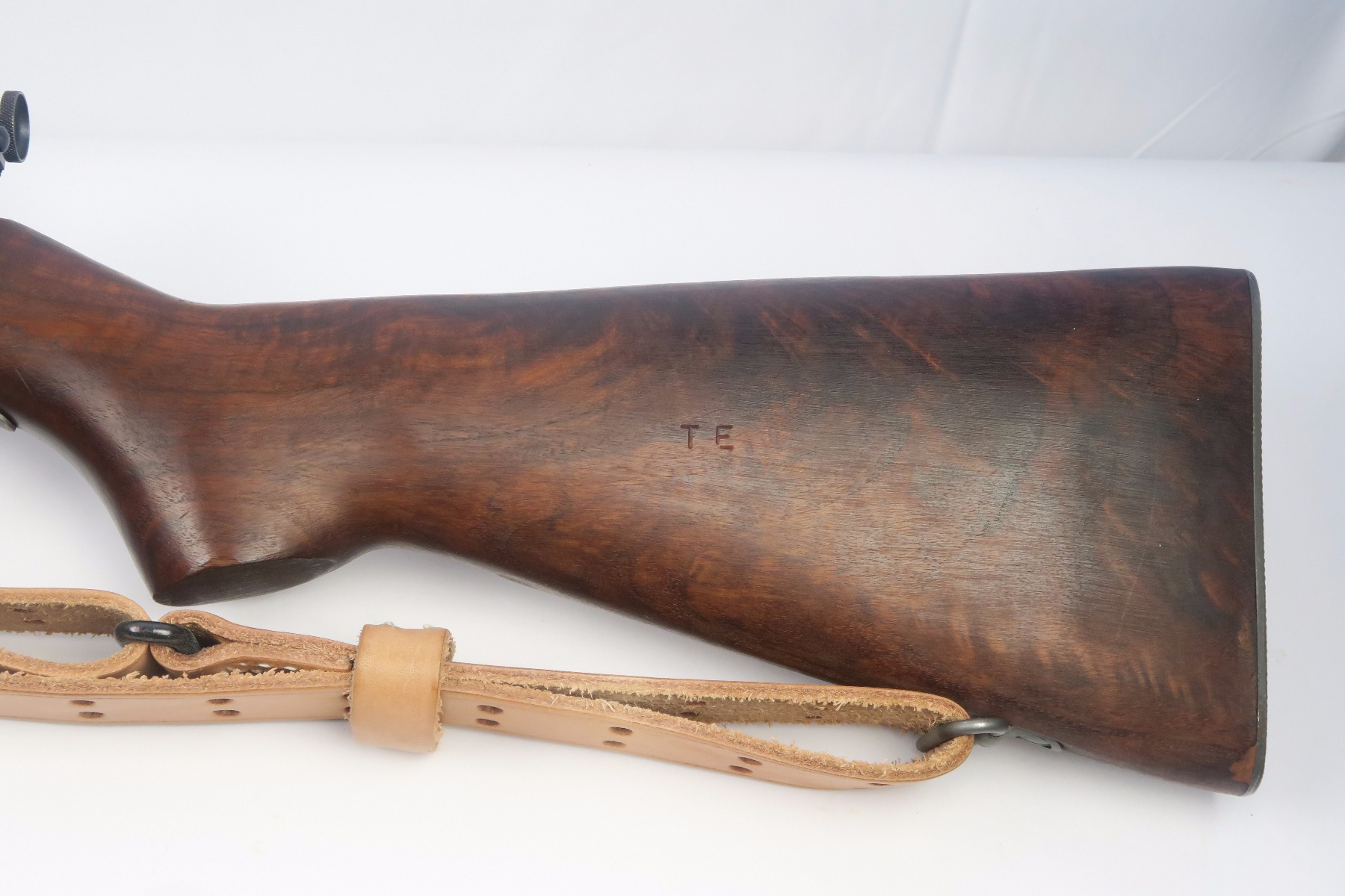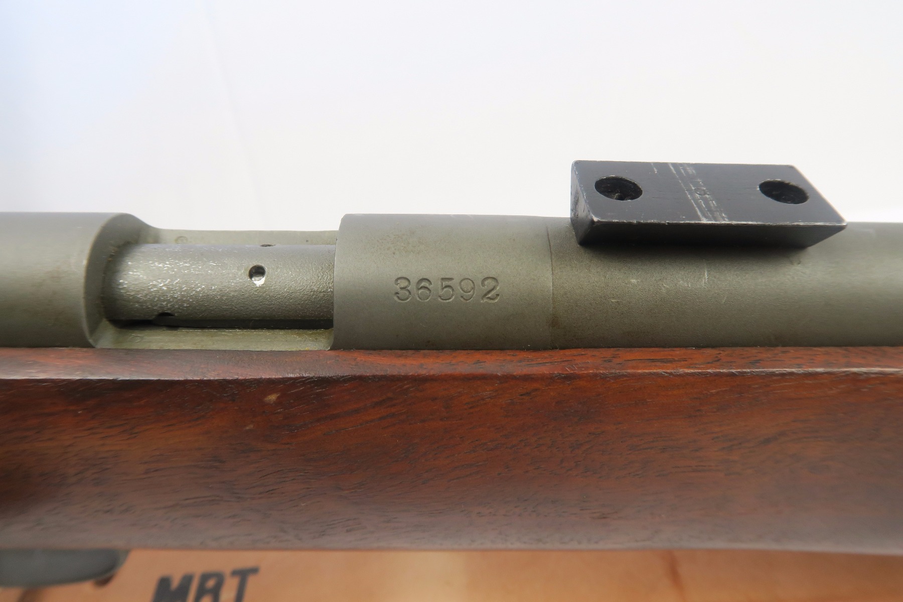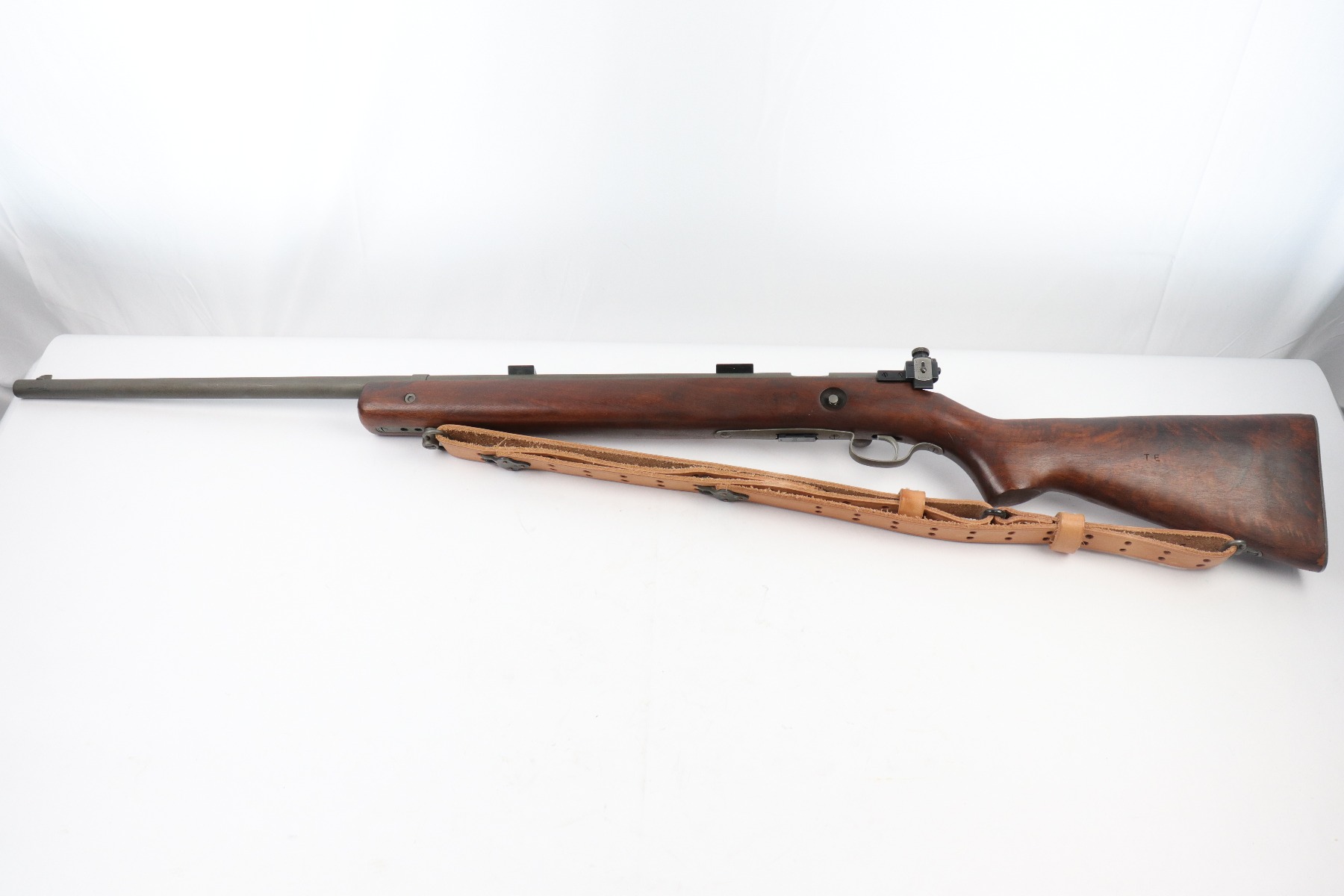 3/13/18 – This is a .22 Caliber Winchester model 75 training rifle, built at the end of or immediately after WW2. The rifle is phosphate finished metal with a beautiful like-new condition stock. The stock is marked “TE” which is an arsenal stamp – and there is no cartouche. The underside of the stock has a “P” stamp. This tells me that the rifle was sent to an arsenal to get fitted with a new stock. The metal on the rifle is lightly worn though – one can see light brown speckling on the barrel – we tried to show this in photos. The action is very smooth and the bore is nice. There is strong rifling and minimal wear/residue in the bore. The rifle comes with a minty arsenal strap ink stamped “MRT” and there’s a “W” marked original Winchester magazine included. The rifle has a Lyman rear sight mounts for a scope if one desired to attach an optic. Guaranteed original.