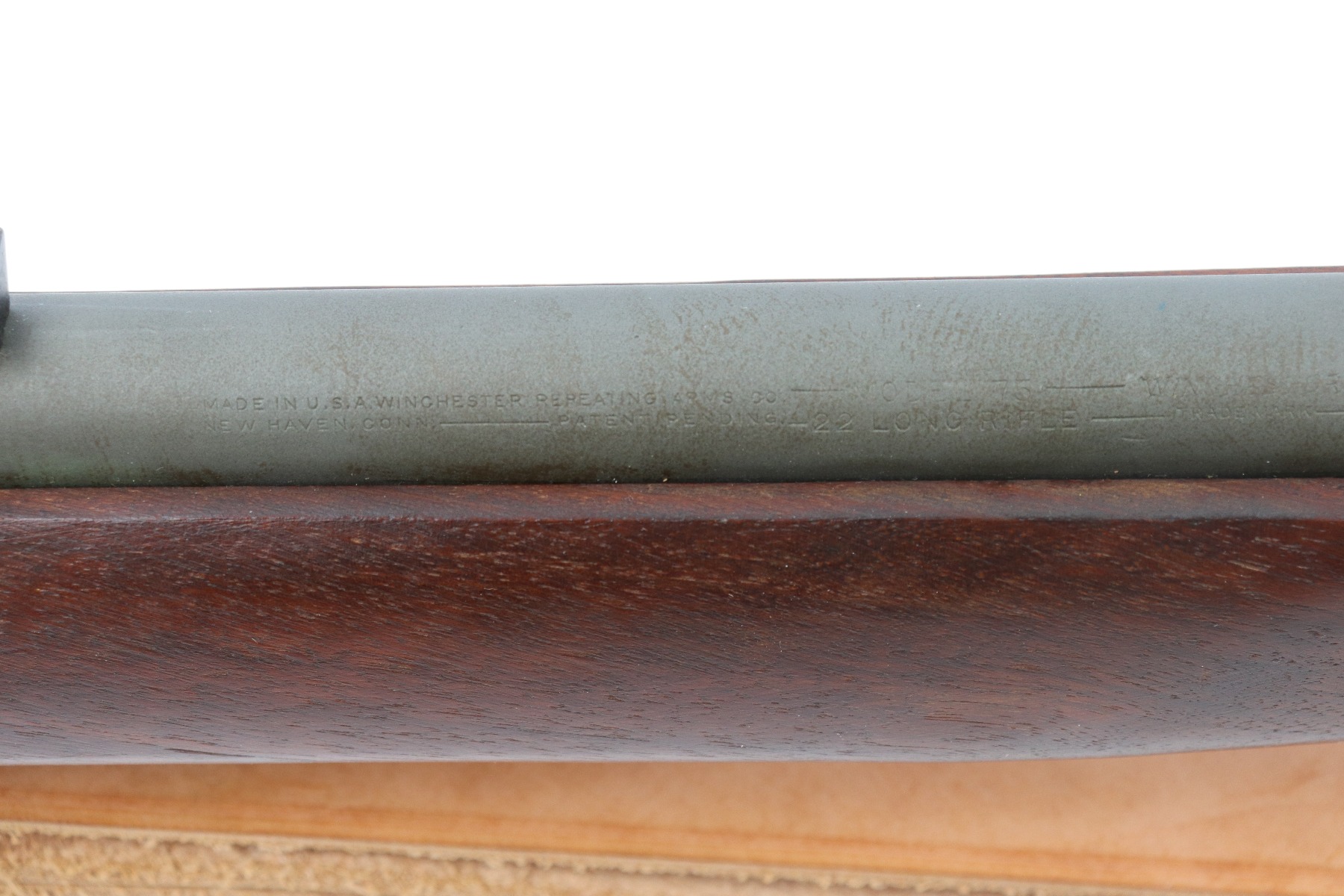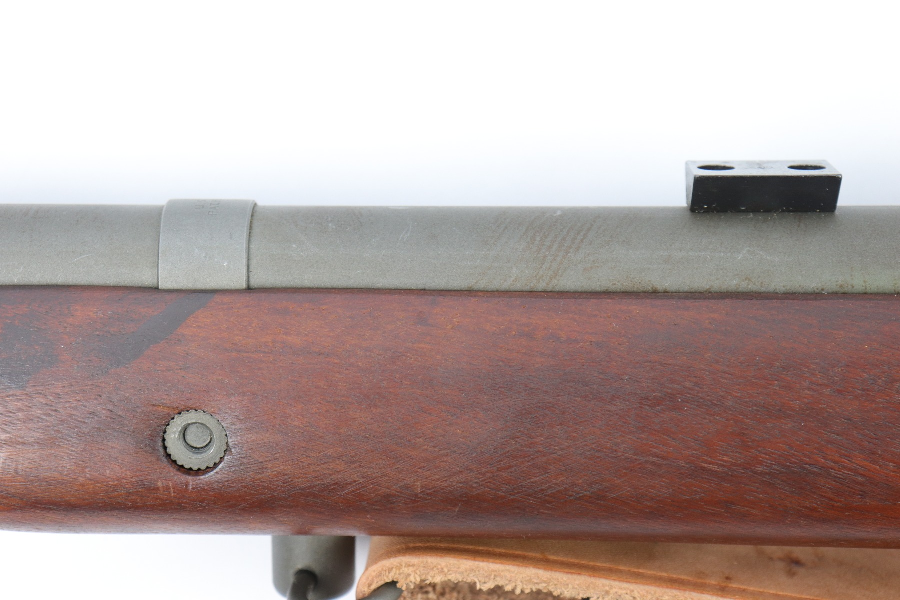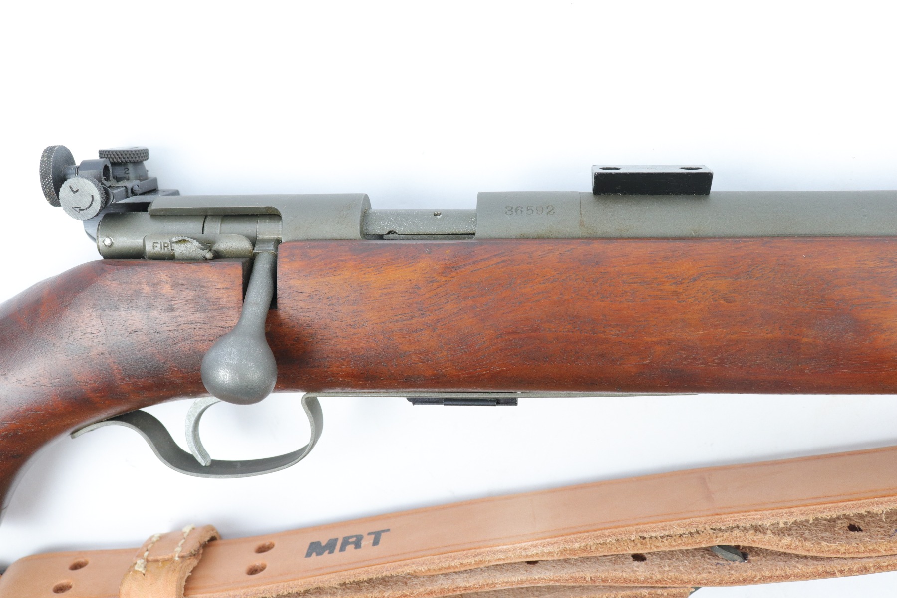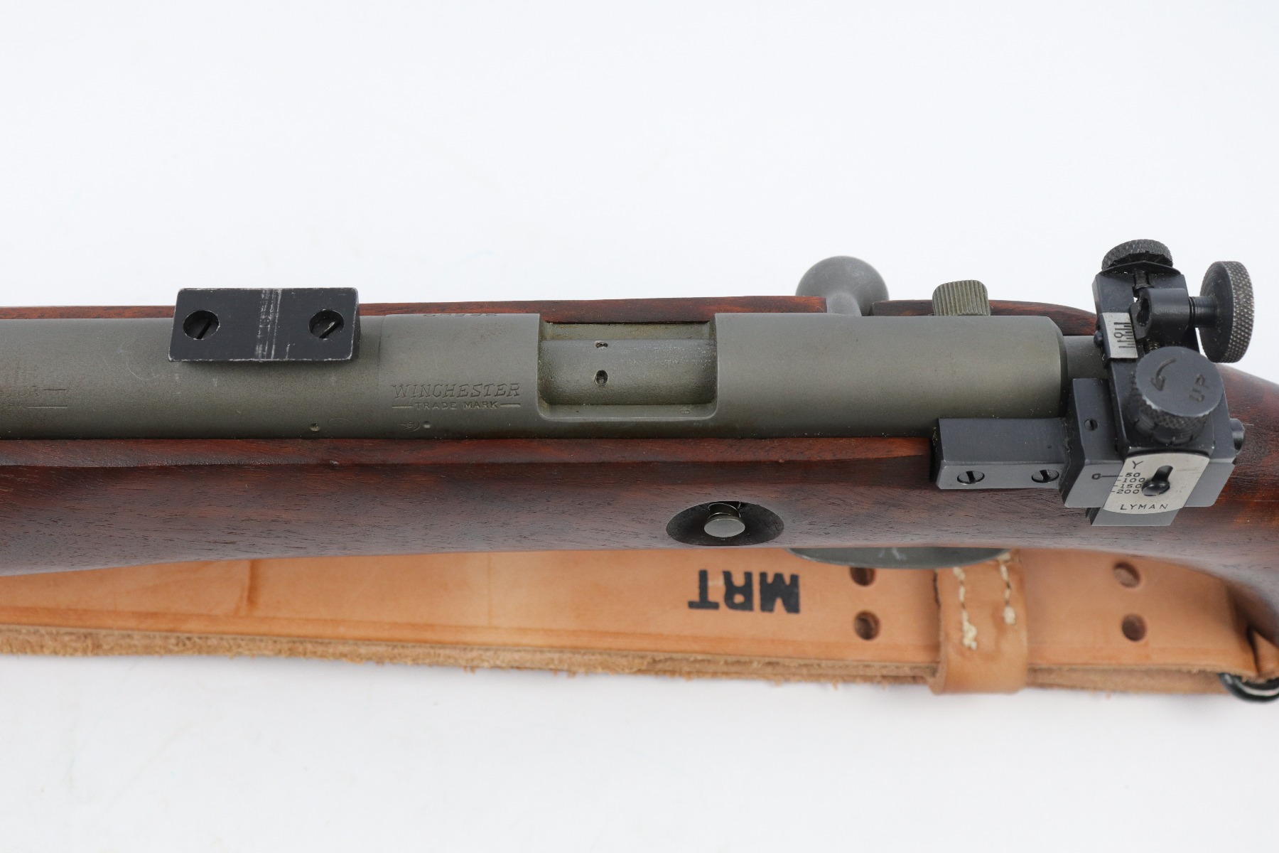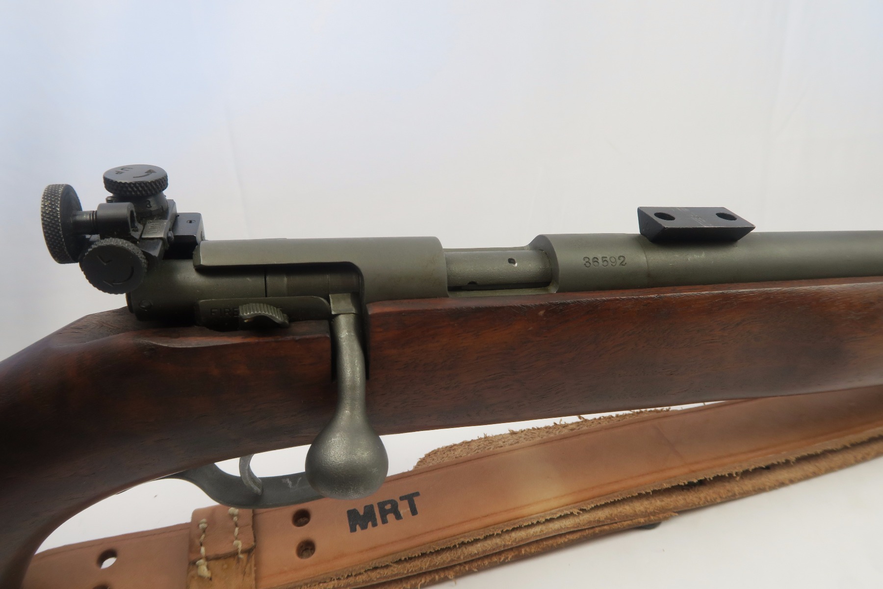 3/13/18 – This is a .22 Caliber Winchester model 75 training rifle, built at the end of or immediately after WW2. The rifle is phosphate finished metal with a beautiful like-new condition stock. The stock is marked “TE” which is an arsenal stamp – and there is no cartouche. The underside of the stock has a “P” stamp. This tells me that the rifle was sent to an arsenal to get fitted with a new stock. The metal on the rifle is lightly worn though – one can see light brown speckling on the barrel – we tried to show this in photos. The action is very smooth and the bore is nice. There is strong rifling and minimal wear/residue in the bore. The rifle comes with a minty arsenal strap ink stamped “MRT” and there’s a “W” marked original Winchester magazine included. The rifle has a Lyman rear sight mounts for a scope if one desired to attach an optic. Guaranteed original.