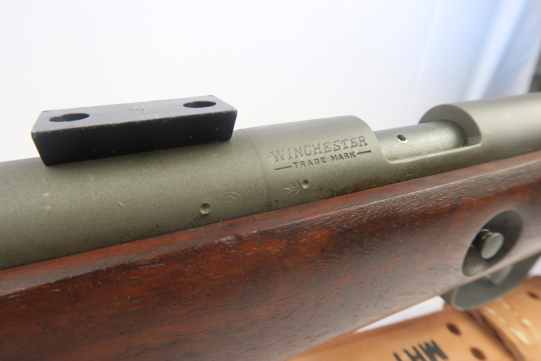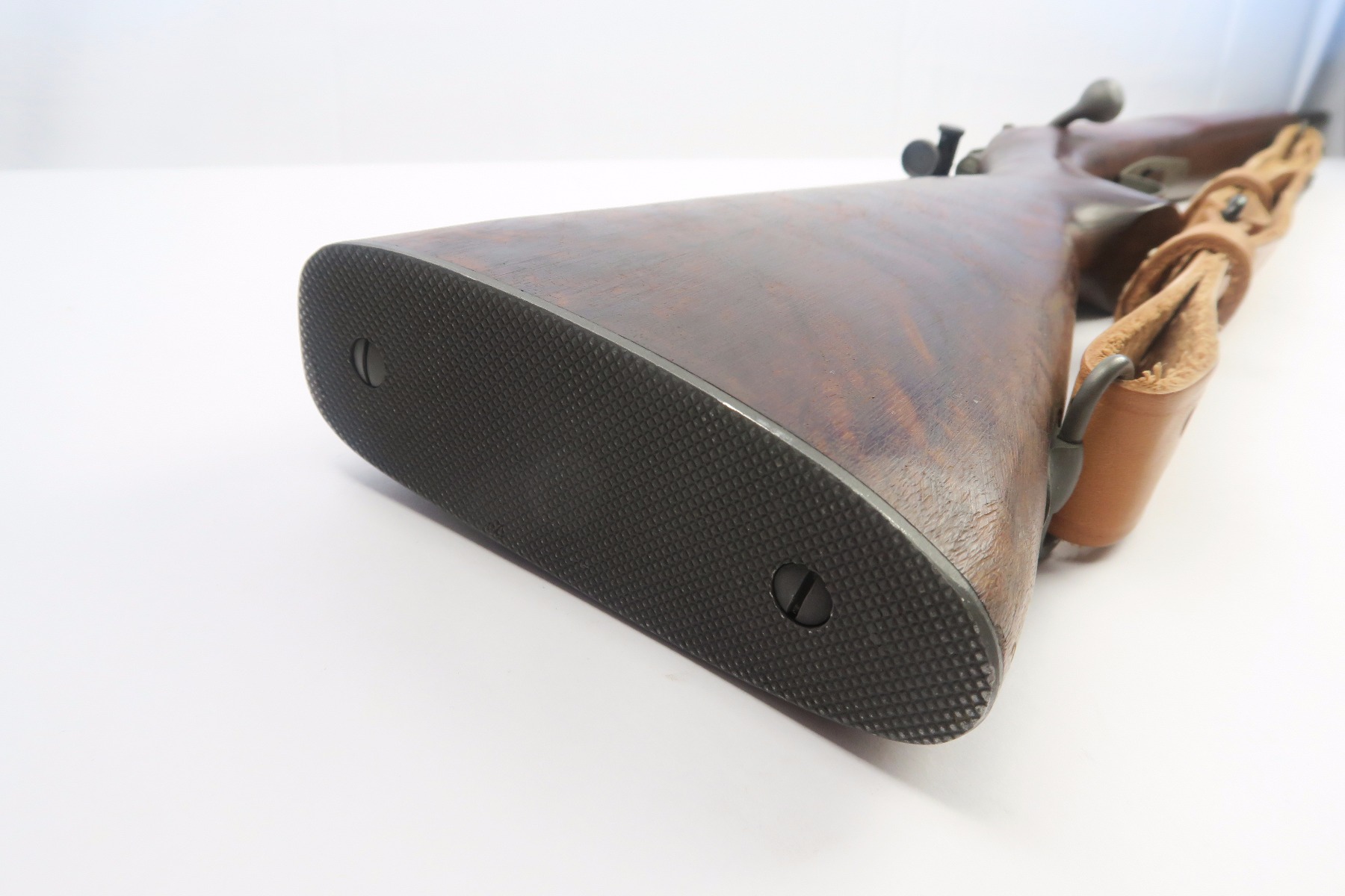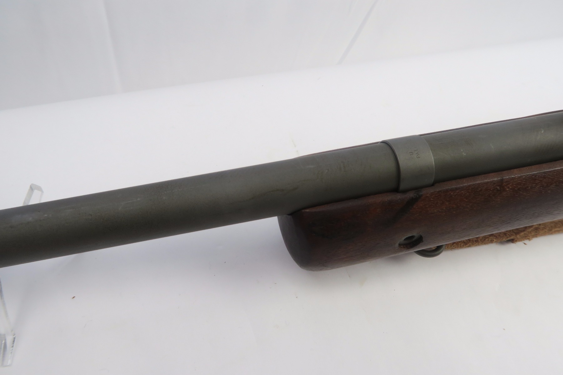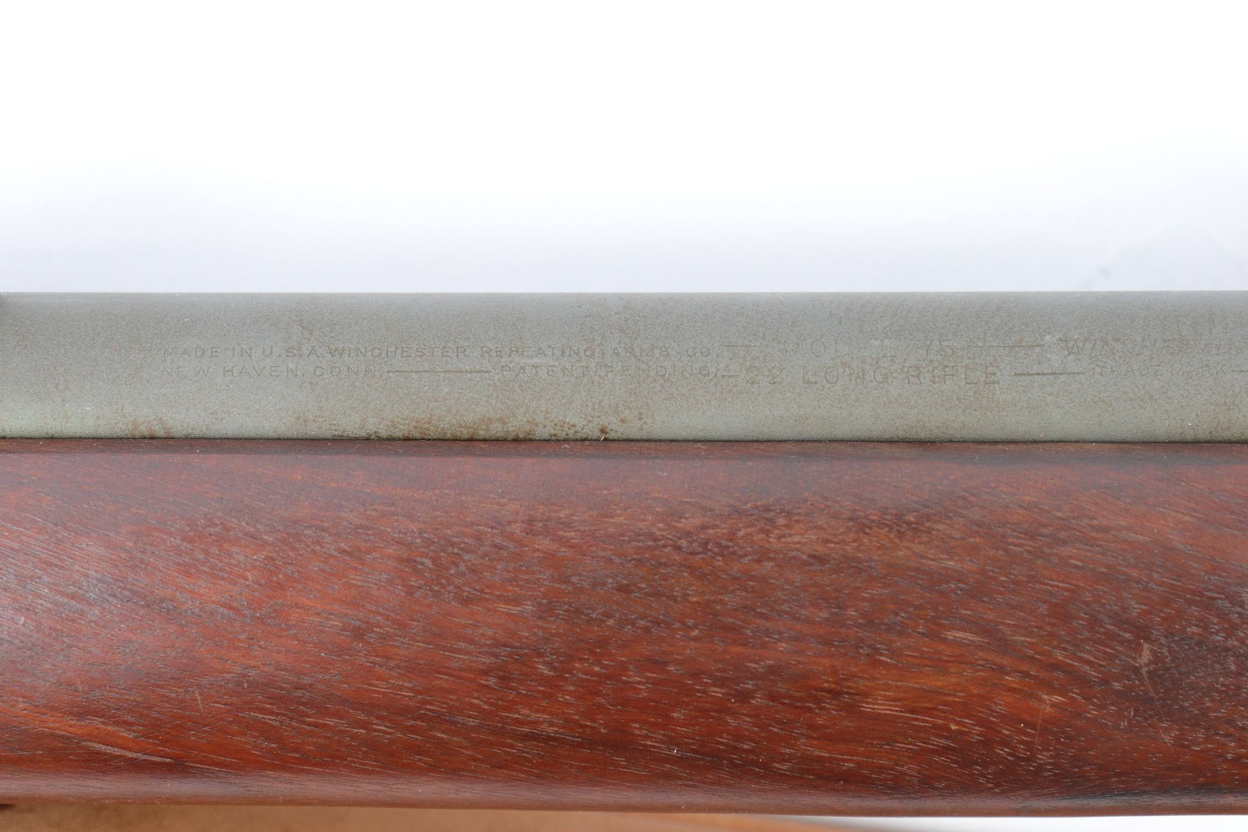 3/13/18 – This is a .22 Caliber Winchester model 75 training rifle, built at the end of or immediately after WW2. The rifle is phosphate finished metal with a beautiful like-new condition stock. The stock is marked “TE” which is an arsenal stamp – and there is no cartouche. The underside of the stock has a “P” stamp. This tells me that the rifle was sent to an arsenal to get fitted with a new stock. The metal on the rifle is lightly worn though – one can see light brown speckling on the barrel – we tried to show this in photos. The action is very smooth and the bore is nice. There is strong rifling and minimal wear/residue in the bore. The rifle comes with a minty arsenal strap ink stamped “MRT” and there’s a “W” marked original Winchester magazine included. The rifle has a Lyman rear sight mounts for a scope if one desired to attach an optic. Guaranteed original.