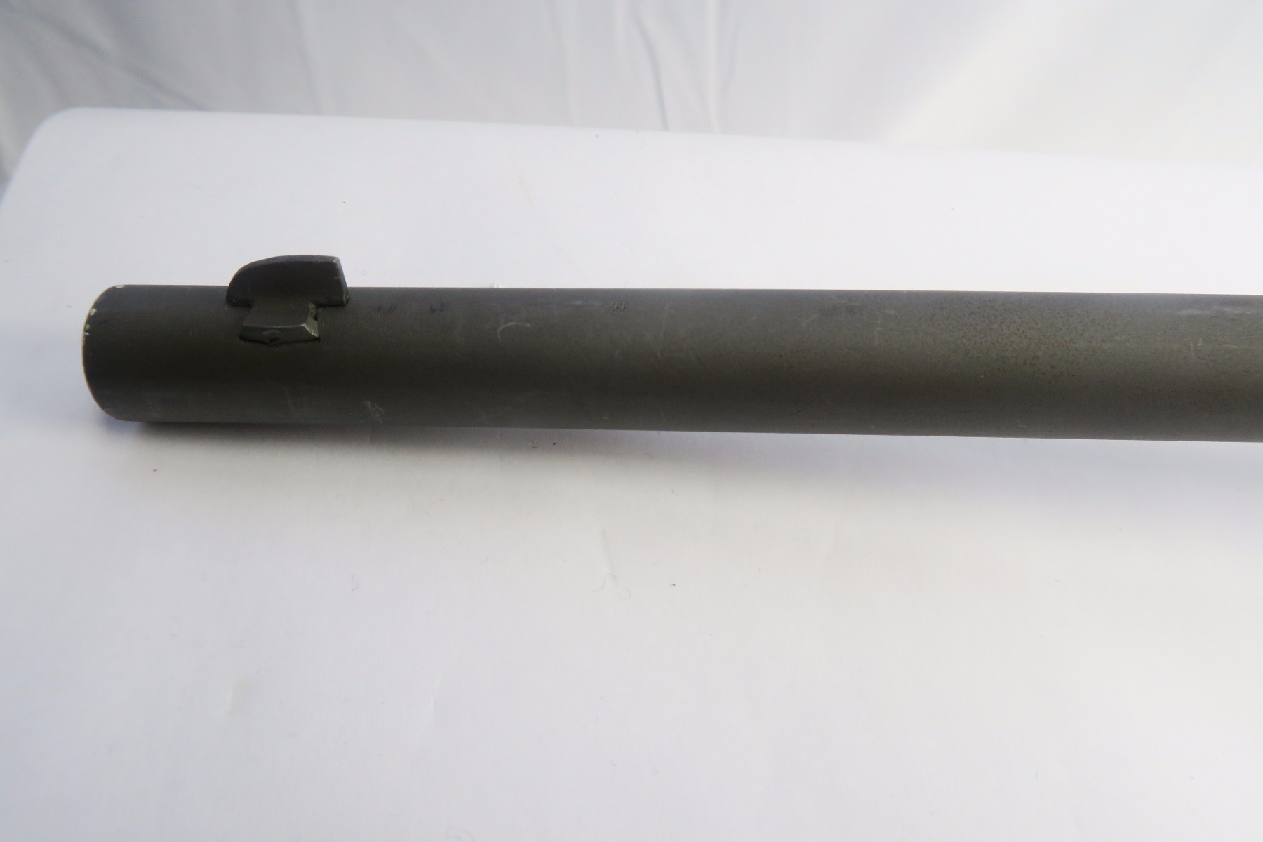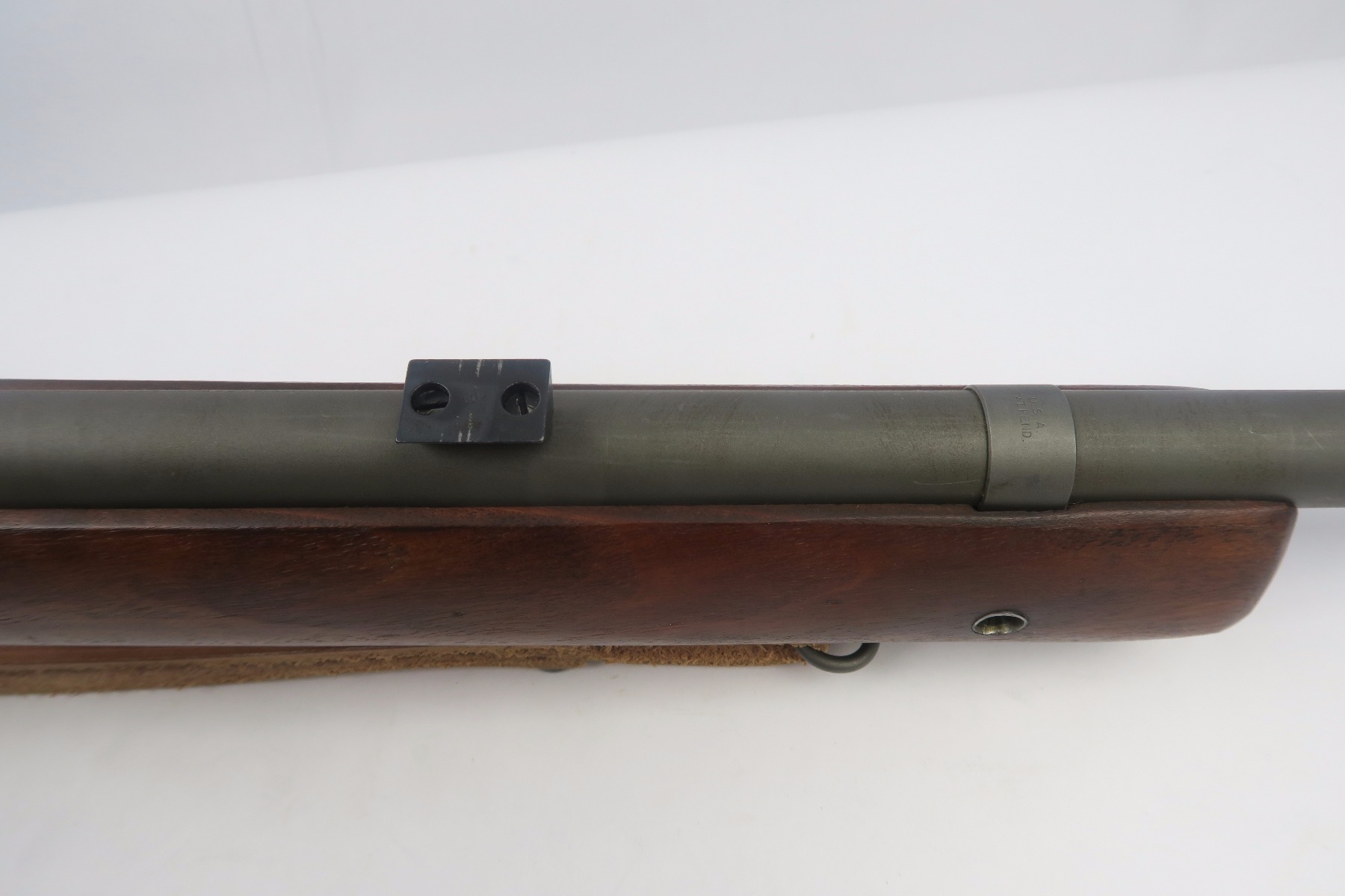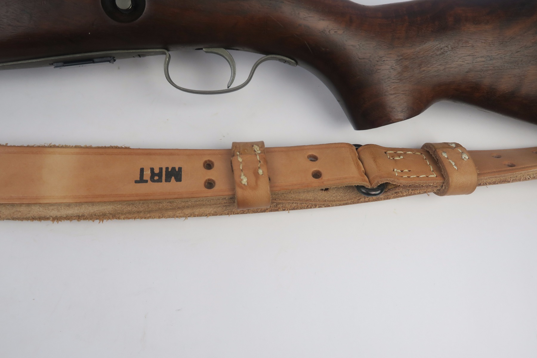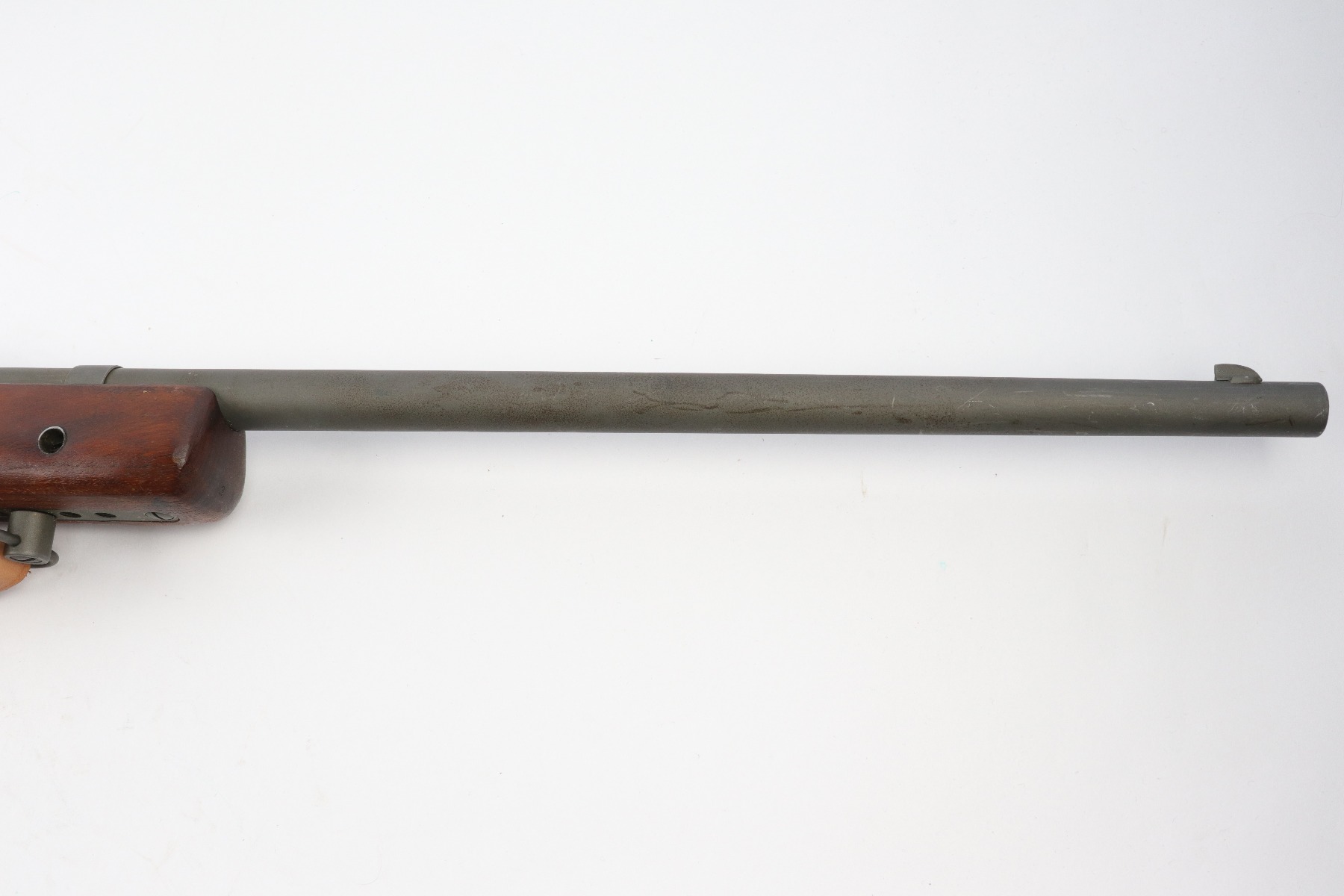 3/13/18 – This is a .22 Caliber Winchester model 75 training rifle, built at the end of or immediately after WW2. The rifle is phosphate finished metal with a beautiful like-new condition stock. The stock is marked “TE” which is an arsenal stamp – and there is no cartouche. The underside of the stock has a “P” stamp. This tells me that the rifle was sent to an arsenal to get fitted with a new stock. The metal on the rifle is lightly worn though – one can see light brown speckling on the barrel – we tried to show this in photos. The action is very smooth and the bore is nice. There is strong rifling and minimal wear/residue in the bore. The rifle comes with a minty arsenal strap ink stamped “MRT” and there’s a “W” marked original Winchester magazine included. The rifle has a Lyman rear sight mounts for a scope if one desired to attach an optic. Guaranteed original.