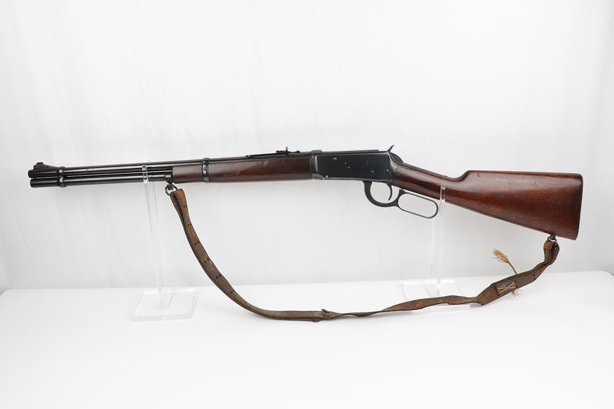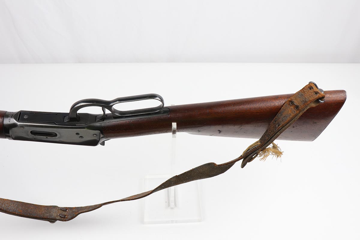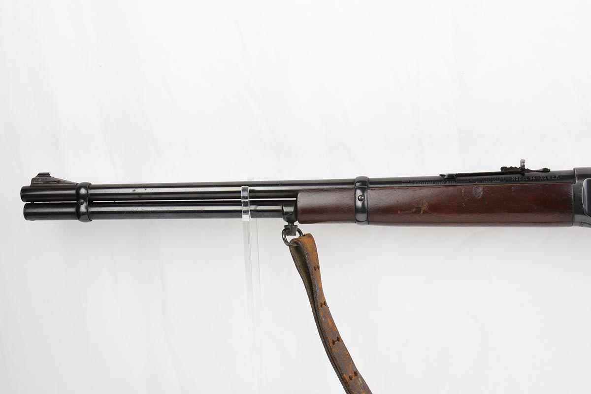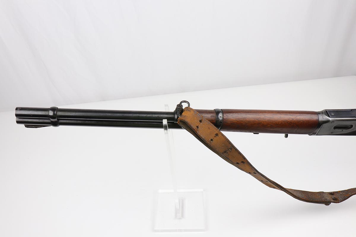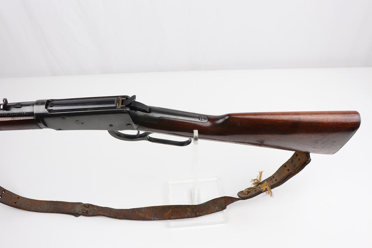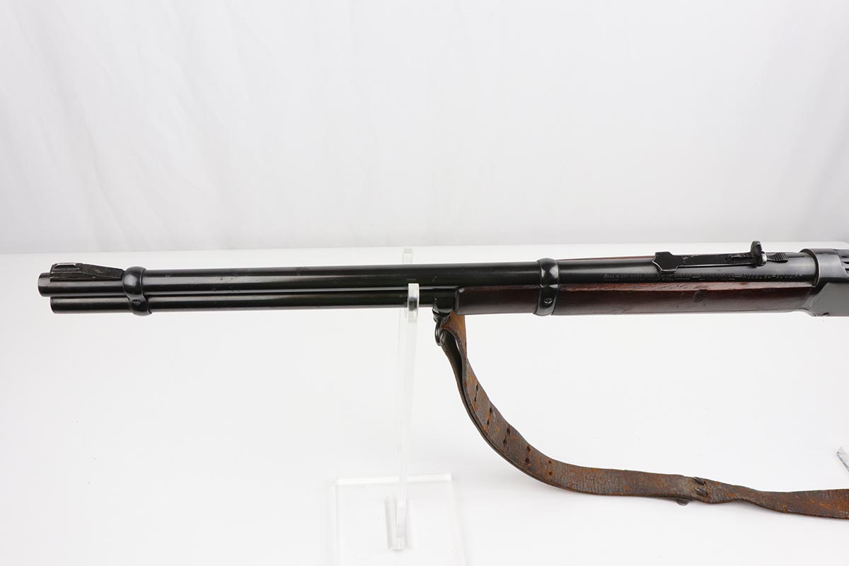 7/24/19 – This is a very nice Winchester Model 94 lever-action rifle that was manufactured in 1949. It is all original with about 95% blue remaining, showing excellent bluing on the barrel and only minor high point thinning. There is some oxidation and pinpricking on the barrel and underside of receiver though. Bore is shiny with strong rifling. Chambered for .30 WCF. 20 inch barrel. Stock is in excellent condition with just a couple dings and nicks. A sling from the rifle’s era is present but shows obvious wear and is pretty beat up.