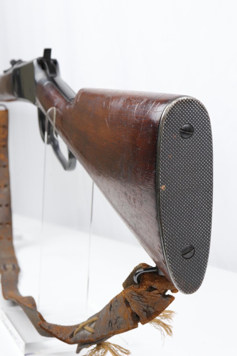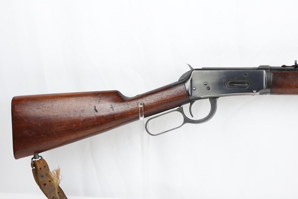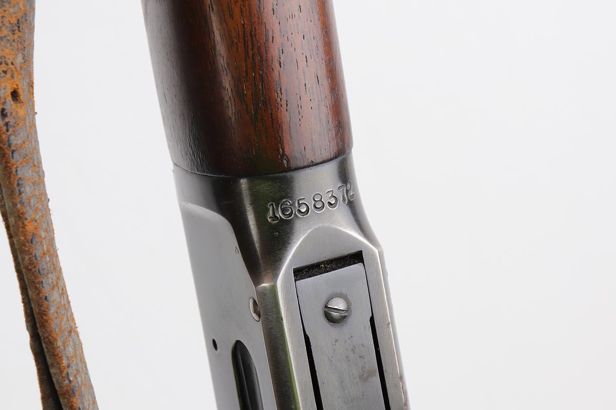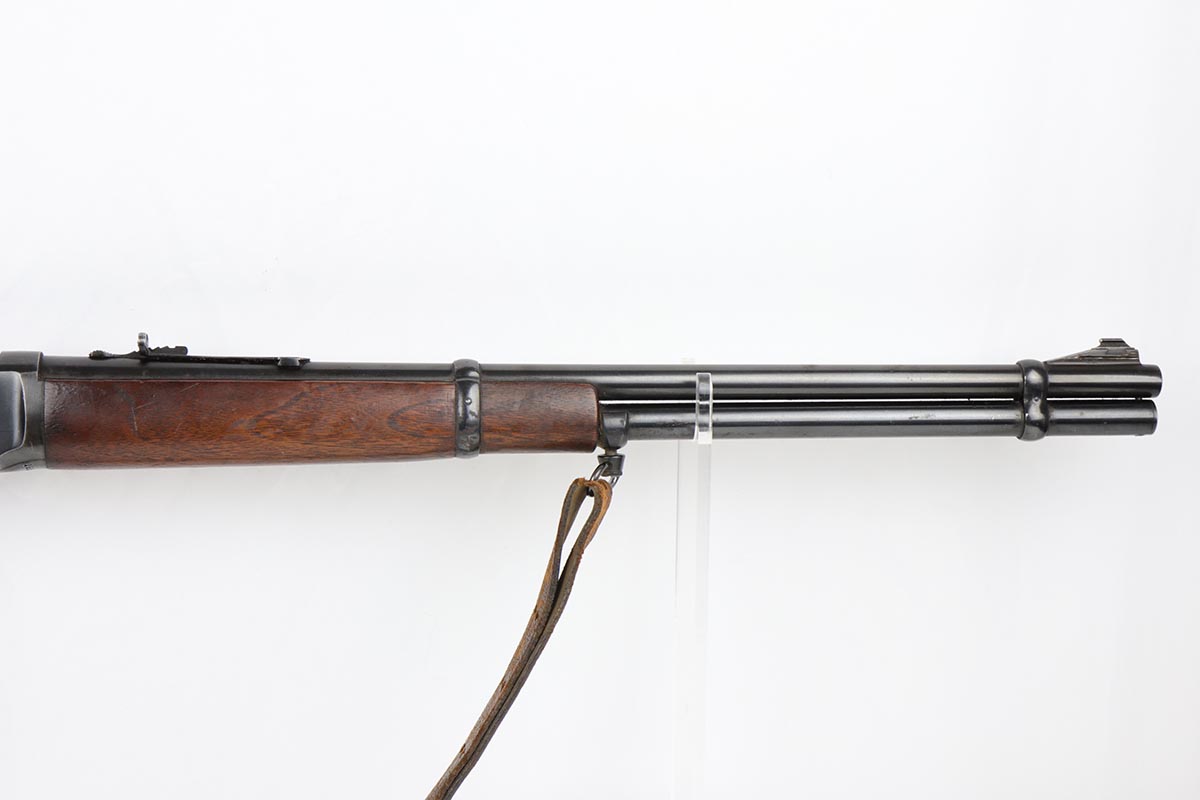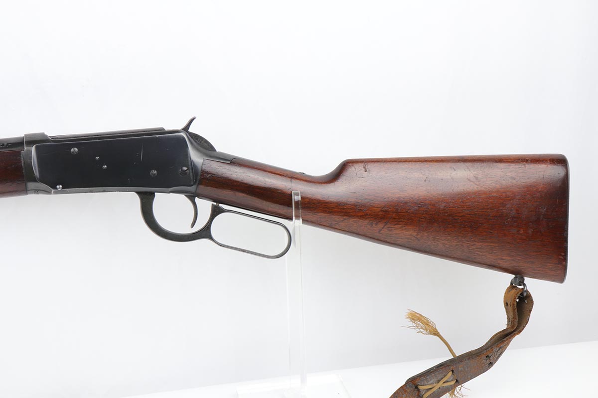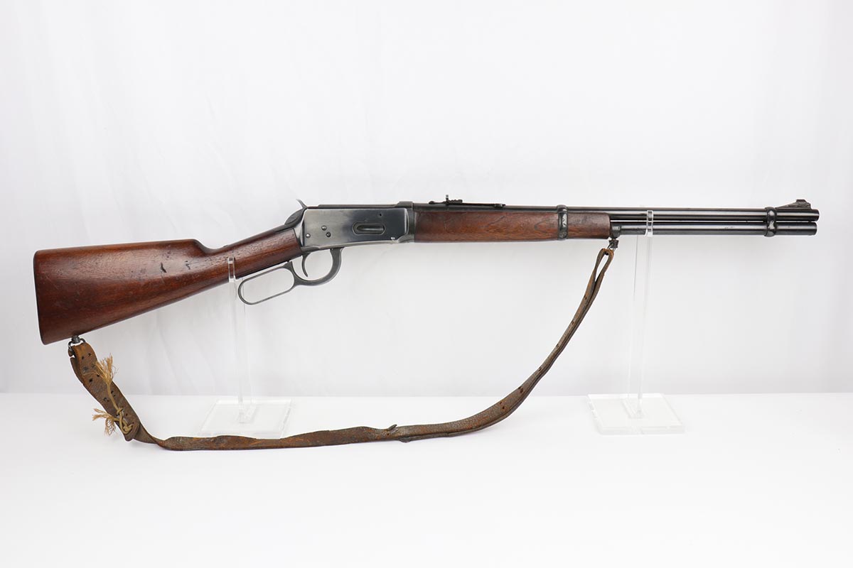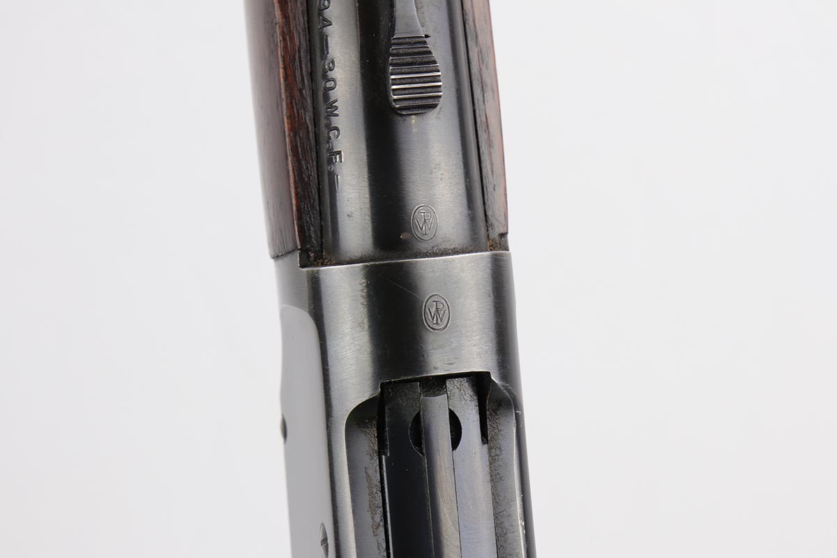7/24/19 – This is a very nice Winchester Model 94 lever-action rifle that was manufactured in 1949. It is all original with about 95% blue remaining, showing excellent bluing on the barrel and only minor high point thinning. There is some oxidation and pinpricking on the barrel and underside of receiver though. Bore is shiny with strong rifling. Chambered for .30 WCF. 20 inch barrel. Stock is in excellent condition with just a couple dings and nicks. A sling from the rifle’s era is present but shows obvious wear and is pretty beat up.