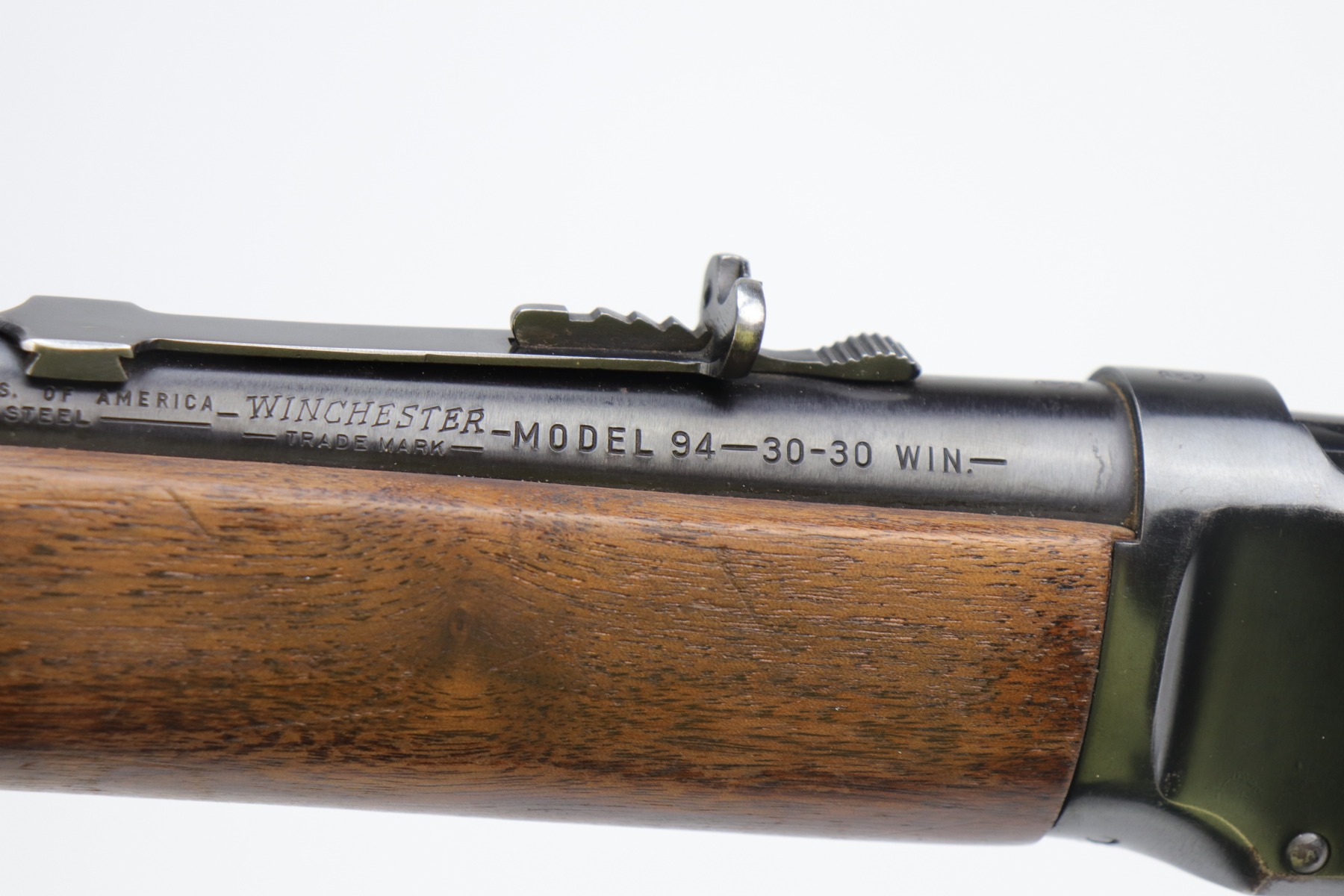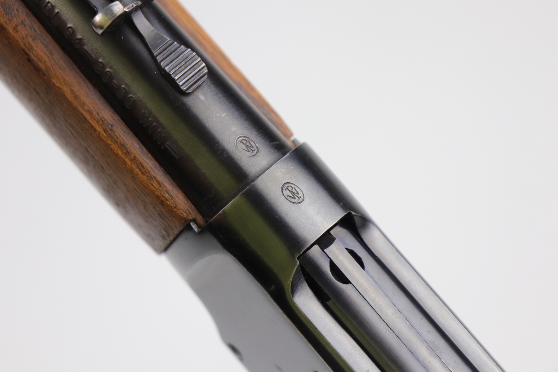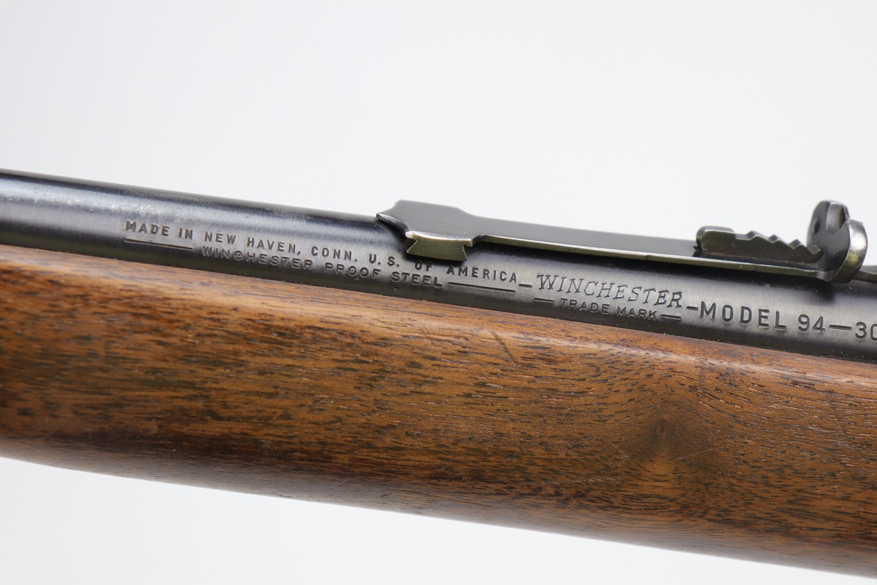 9/17/20 – This is a very nice example of a Winchester Model 94 Lever Action Rifle, chambered in .30-.30 Win. From the serial number, this gun was manufactured around 1952. It has retained about 92-94% of its original bluing with minor wear on the high edges of the receiver, on the bottom of the lever, and a few small spots on the barrel. There are some surface scratches on both sides of the receiver. There’s a small area of light freckling on the underside and both sides of the receiver. The gun is fully functional. The stock is excellent – just a few minor handling marks and surface scratches. The bore is minty.
