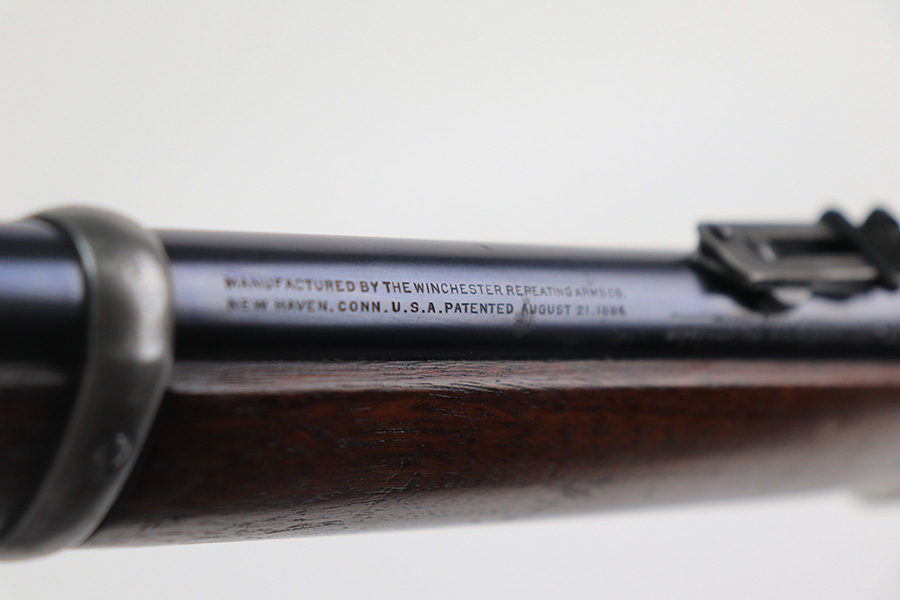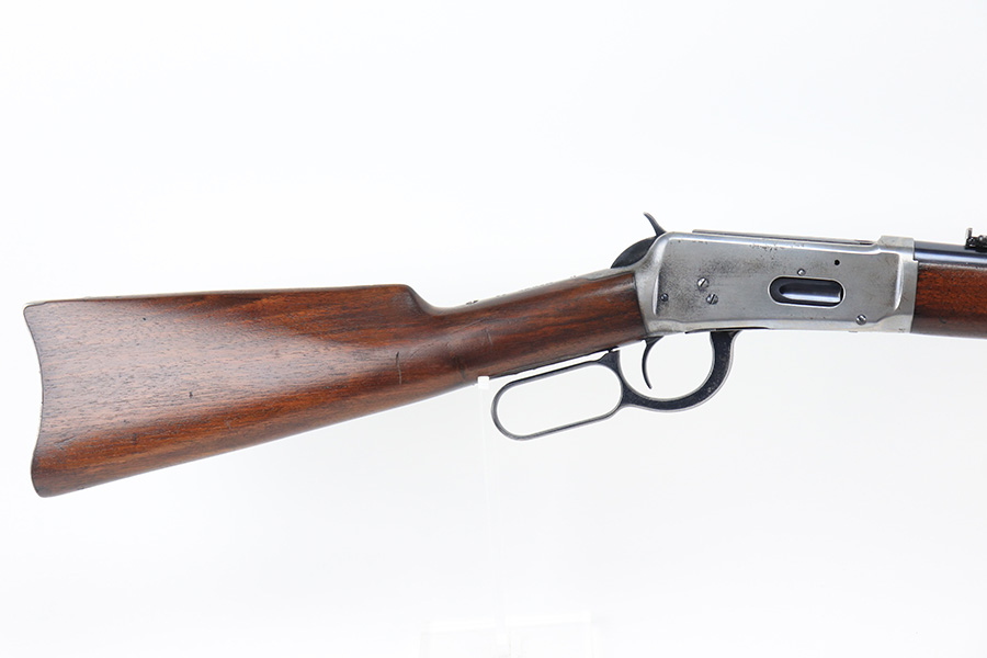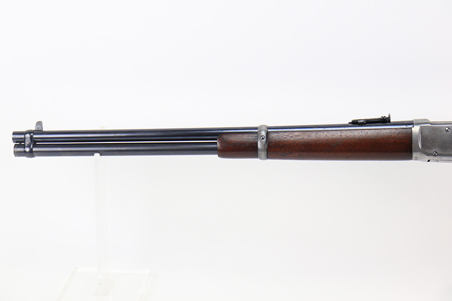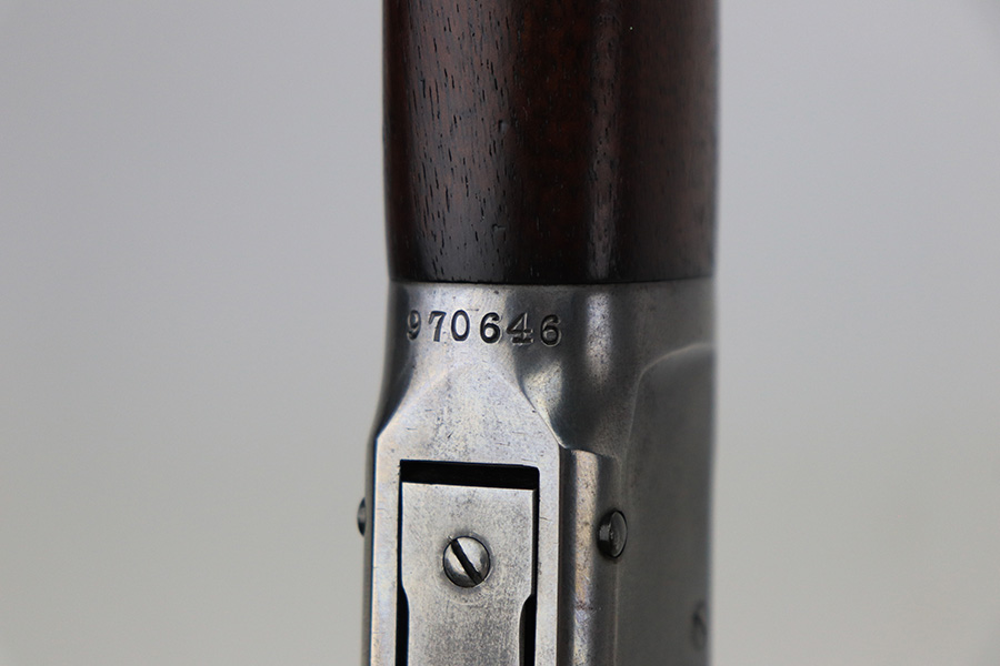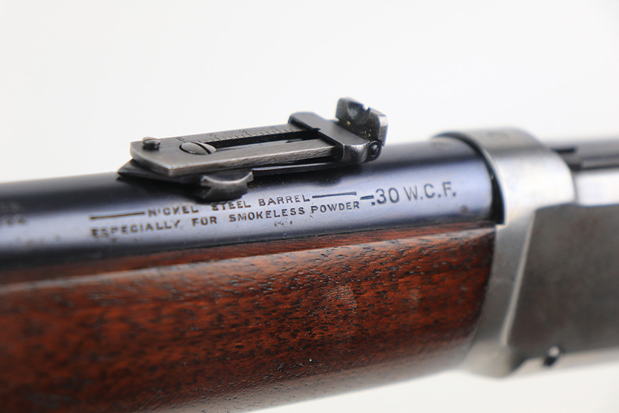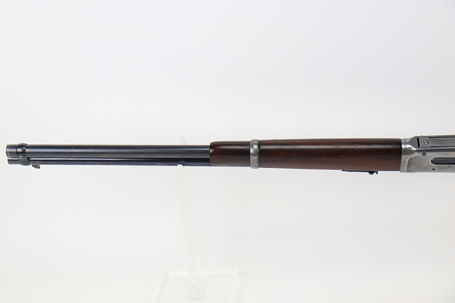 10/25/22 – This is a nice example of a Winchester Model 94 Saddle Ring Carbine. It is all matching, chambered in .30 WCF, and was manufactured in 1925. Overall, the gun is in very nice condition, but the receiver, rear barrel band, and butt plate have lost most of their original bluing. There is spotty wear on the lever and some light scratches and handling marks along the barrel. The original saddle ring is intact. The wood stock is excellent with only minor dings and scratches here and there. Excellent bore – shiny with strong rifling. The action is smooth.