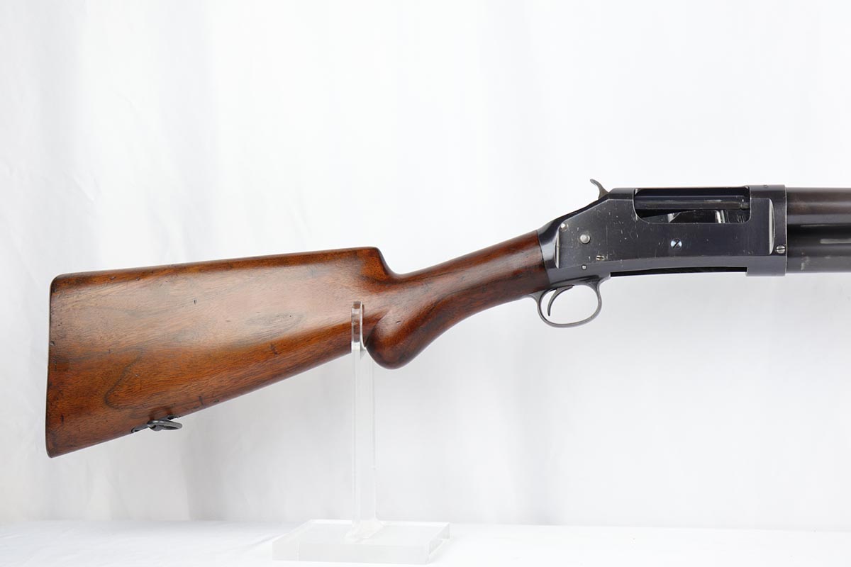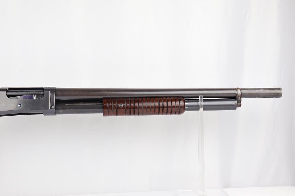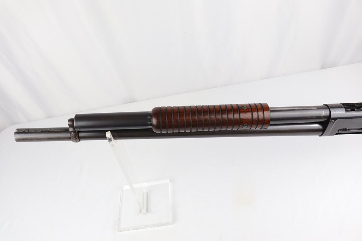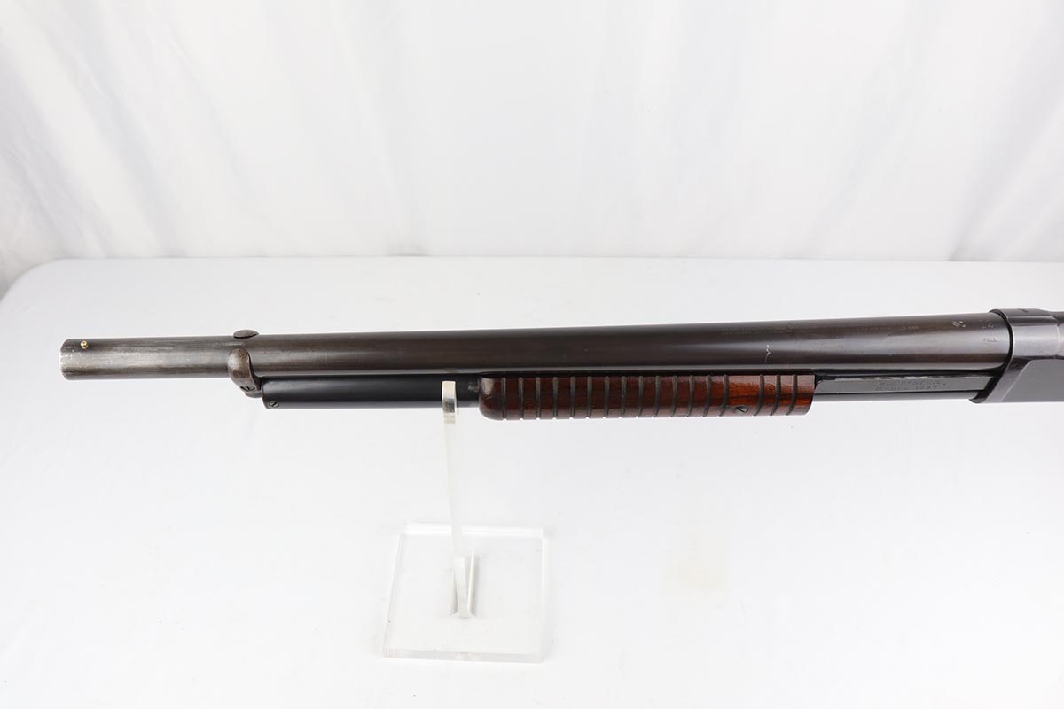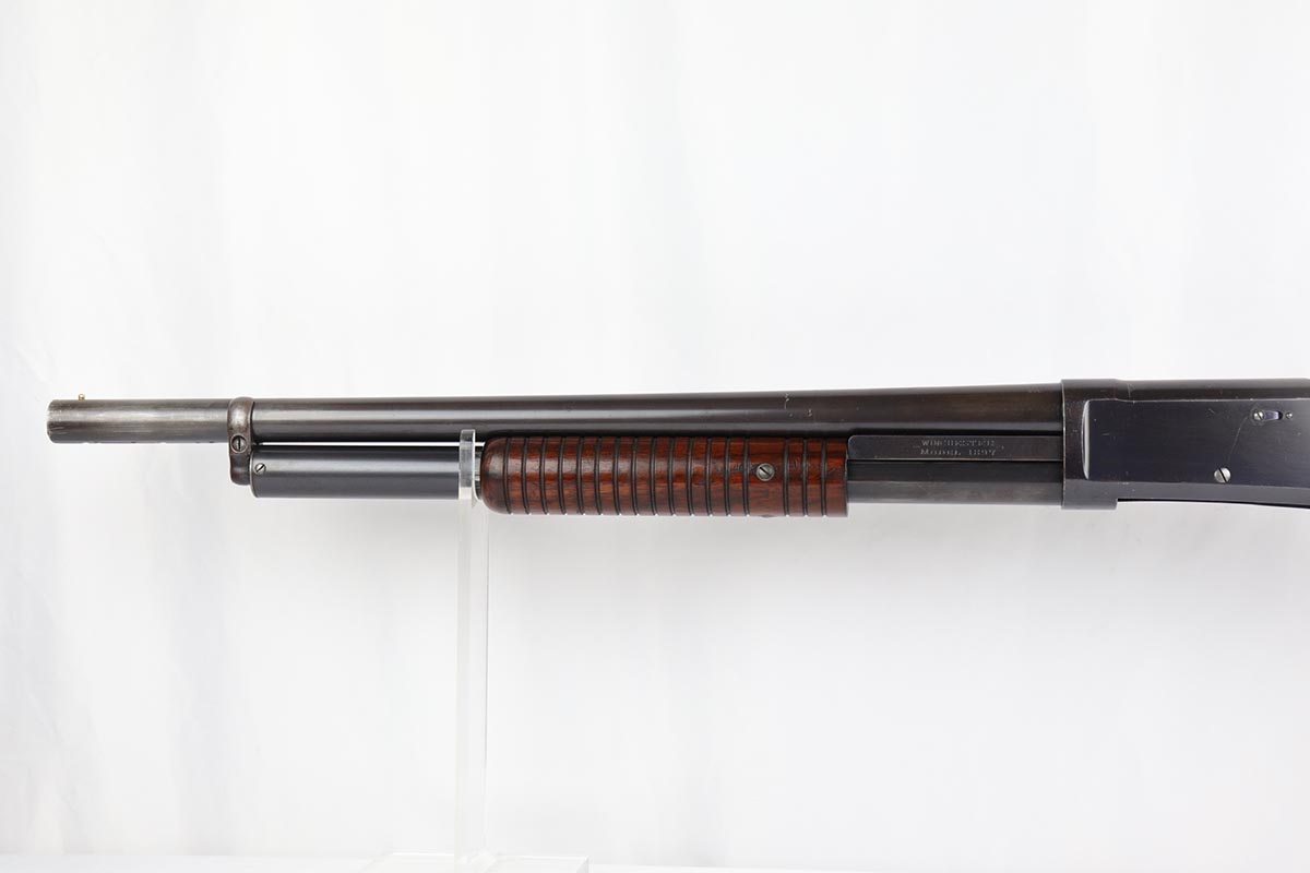 2/28/19 – This is an all original Winchester Model 97 shotgun that started its life as a commercial 12 gauge gun, and was then pressed into US army service by converting it to a 20 inch cylinder bore trench shotgun, and then turning it into a “riot” military shotgun by removing the heat shield. As the war demands during WWII outstripped the capacity of Winchester to produce enough dedicated trench and riot shotguns for the US army, a purchase of civilian M1897 and M12 shotguns was initiated for a conversion to a trench/riot configuration. The barrel was cut to 20.5 inches and marked “cyl”. Flaming bomb military proof mark was stamped on top of the barrel and on the receiver. This is one of these converted guns – an absolutely original condition M97 with the above modifications. Everything is original including the cartouches and the bluing. At one point it had a heat shield on – as evidenced by the cut outs and drag marks on the bottom of the barrel. It was eventually converted to a “riot” configuration.