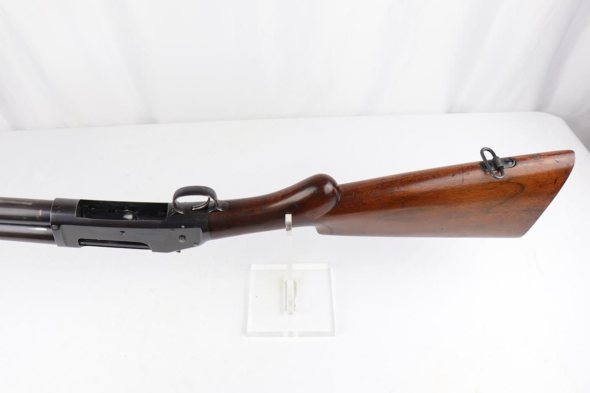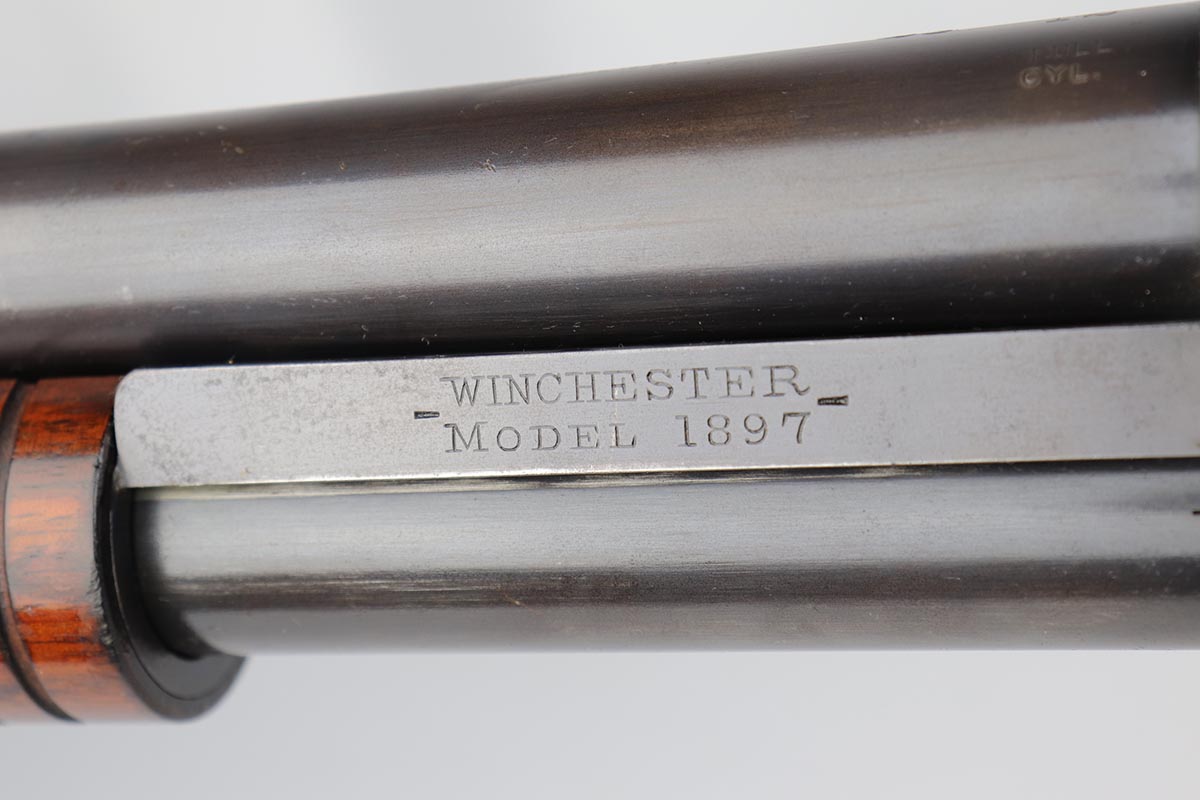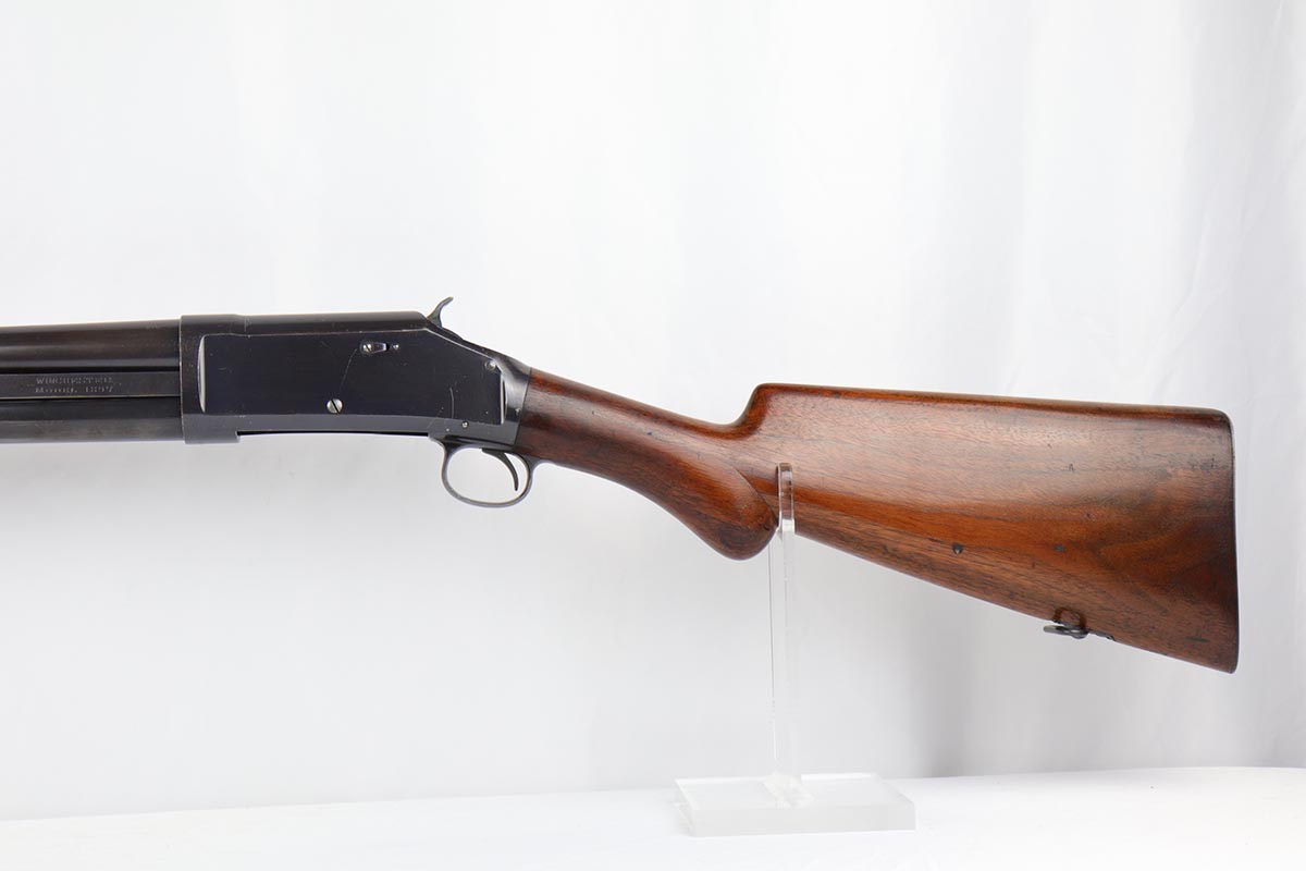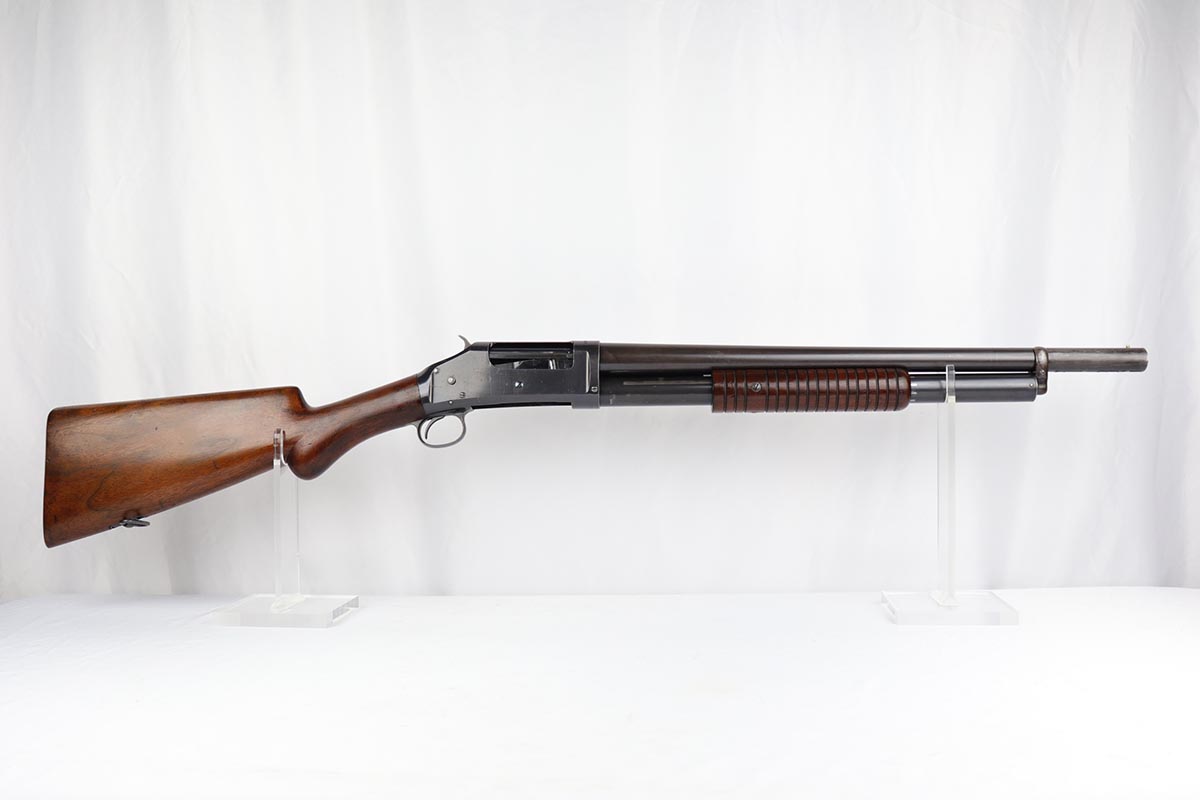 2/28/19 – This is an all original Winchester Model 97 shotgun that started its life as a commercial 12 gauge gun, and was then pressed into US army service by converting it to a 20 inch cylinder bore trench shotgun, and then turning it into a “riot” military shotgun by removing the heat shield. As the war demands during WWII outstripped the capacity of Winchester to produce enough dedicated trench and riot shotguns for the US army, a purchase of civilian M1897 and M12 shotguns was initiated for a conversion to a trench/riot configuration. The barrel was cut to 20.5 inches and marked “cyl”. Flaming bomb military proof mark was stamped on top of the barrel and on the receiver. This is one of these converted guns – an absolutely original condition M97 with the above modifications. Everything is original including the cartouches and the bluing. At one point it had a heat shield on – as evidenced by the cut outs and drag marks on the bottom of the barrel. It was eventually converted to a “riot” configuration.