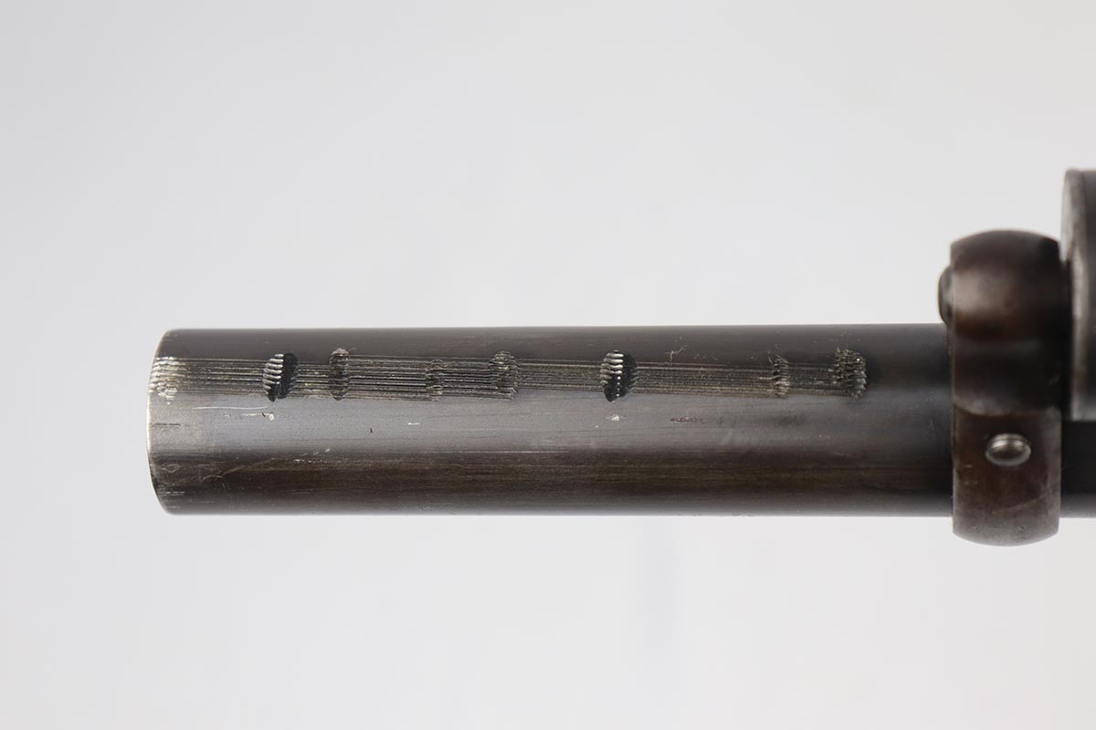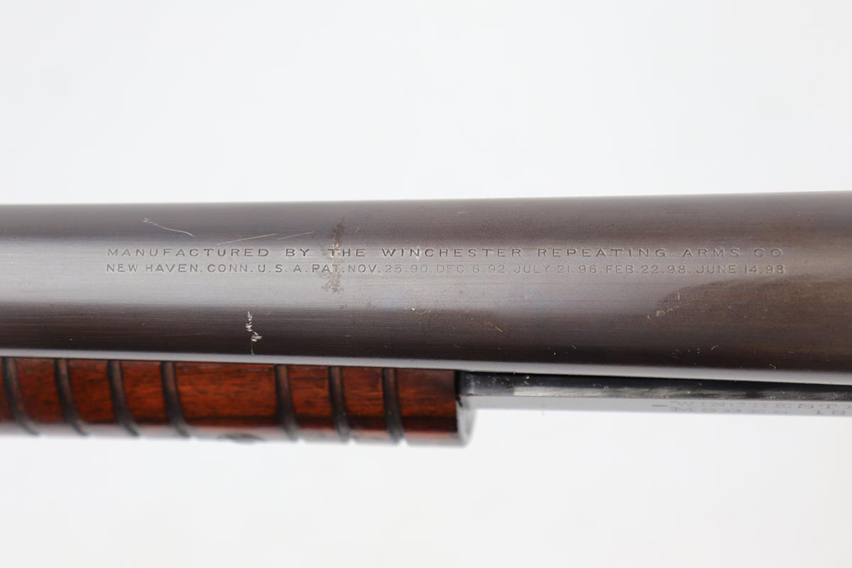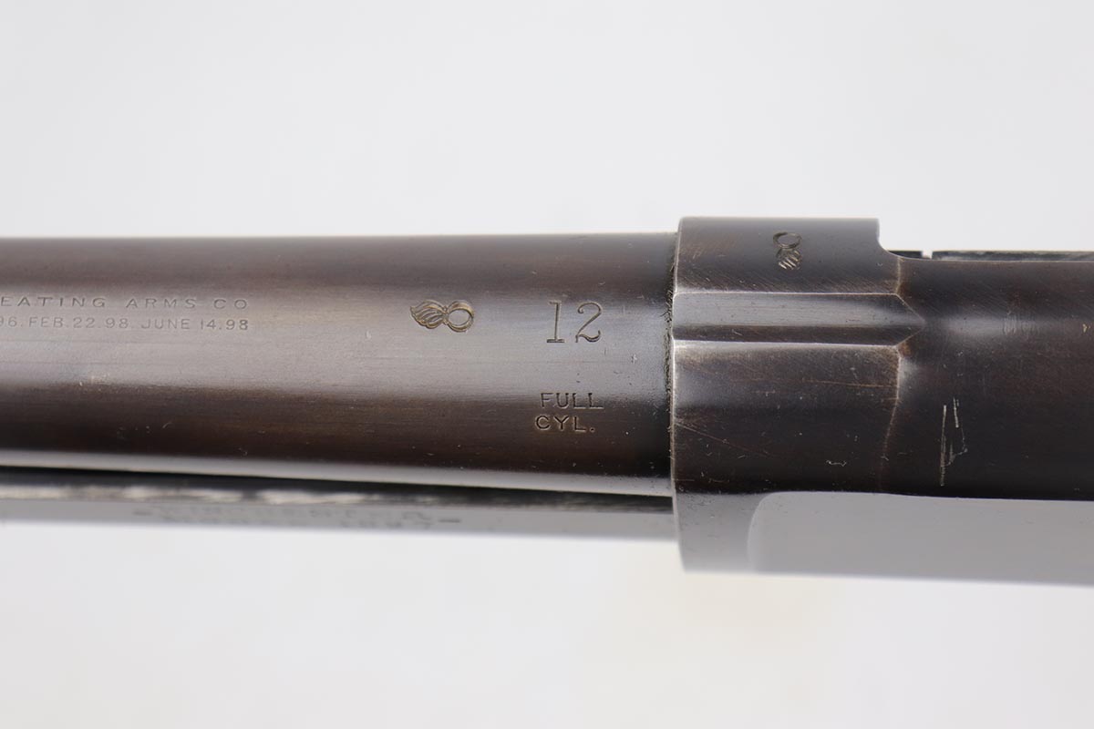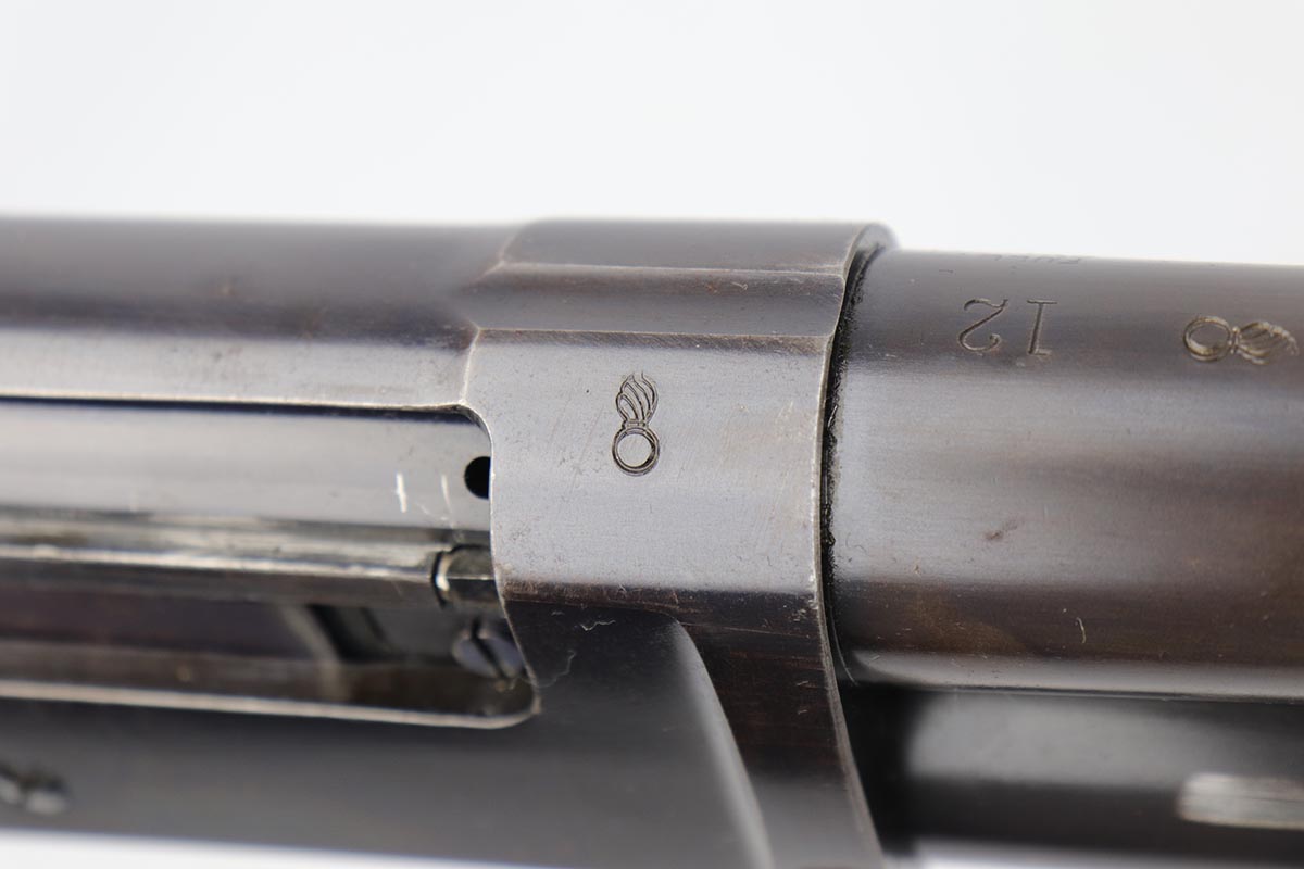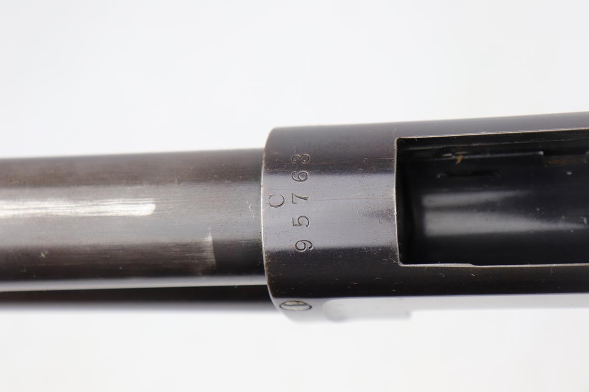 2/28/19 – This is an all original Winchester Model 97 shotgun that started its life as a commercial 12 gauge gun, and was then pressed into US army service by converting it to a 20 inch cylinder bore trench shotgun, and then turning it into a “riot” military shotgun by removing the heat shield. As the war demands during WWII outstripped the capacity of Winchester to produce enough dedicated trench and riot shotguns for the US army, a purchase of civilian M1897 and M12 shotguns was initiated for a conversion to a trench/riot configuration. The barrel was cut to 20.5 inches and marked “cyl”. Flaming bomb military proof mark was stamped on top of the barrel and on the receiver. This is one of these converted guns – an absolutely original condition M97 with the above modifications. Everything is original including the cartouches and the bluing. At one point it had a heat shield on – as evidenced by the cut outs and drag marks on the bottom of the barrel. It was eventually converted to a “riot” configuration.