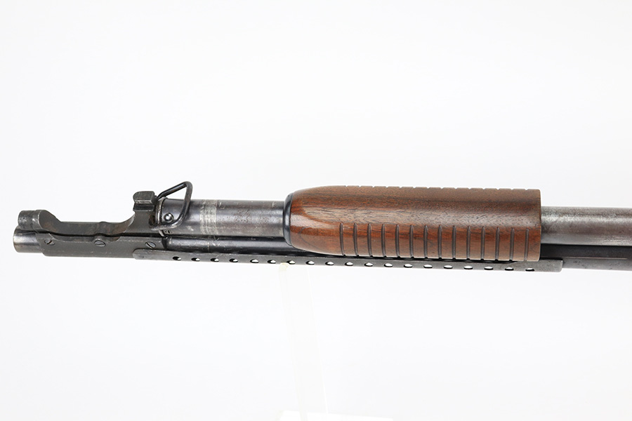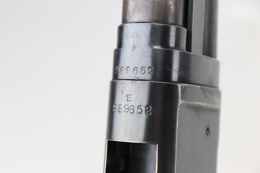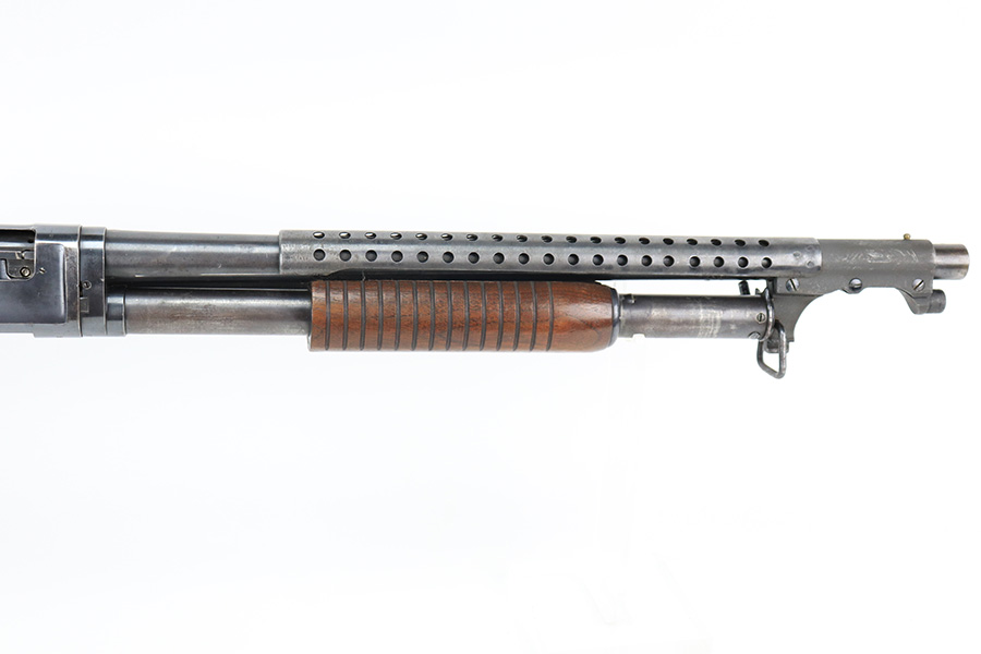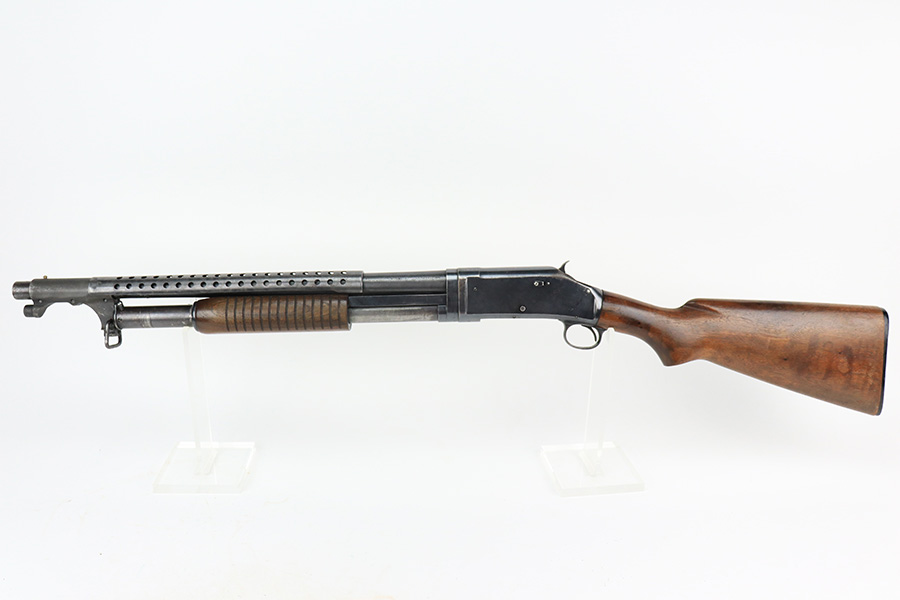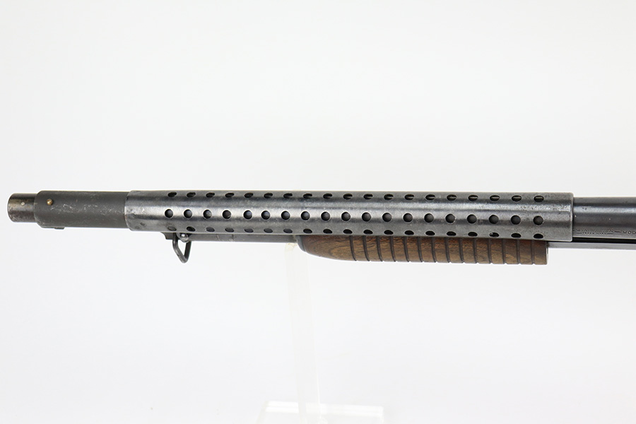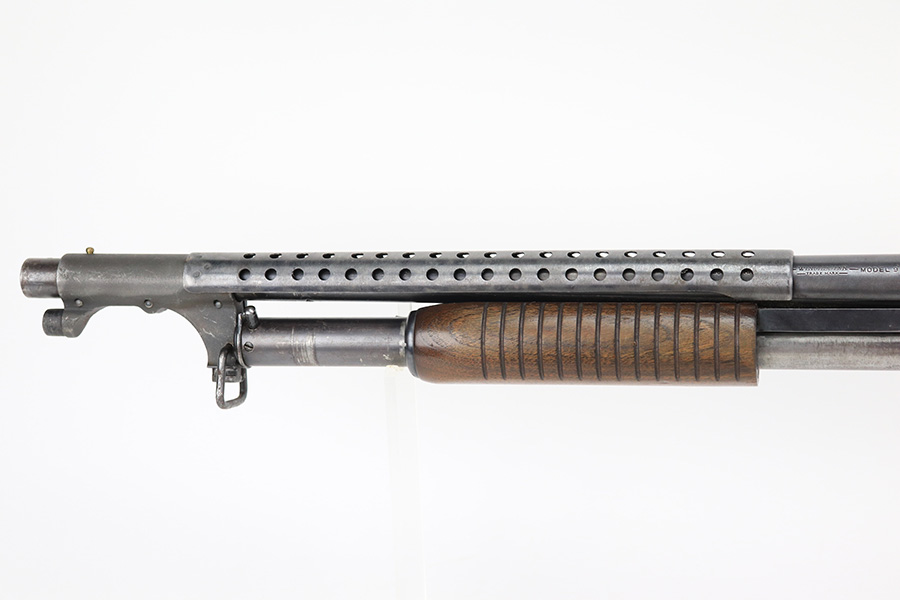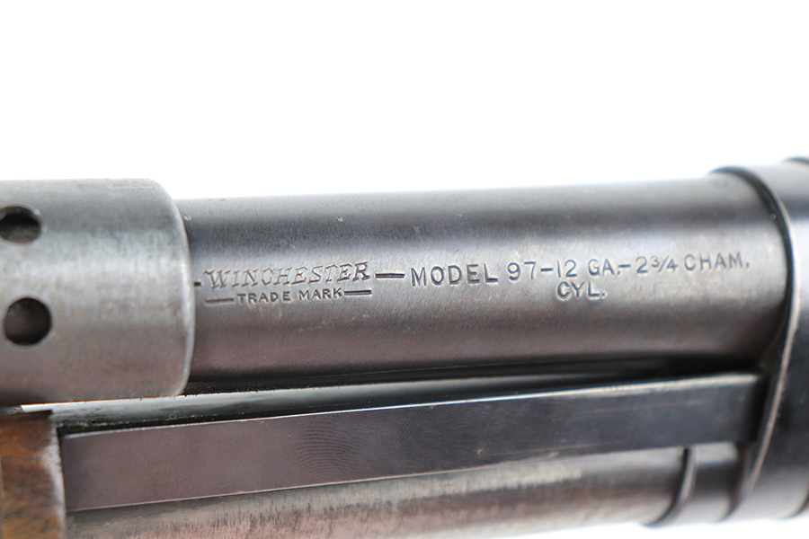 6/15/22 – This is a Winchester Model 97 shotgun from 1953 that has been modified to trench shotgun configuration. The bluing on the shotgun is original but shows edge wear on all the high points, and use wear on the magazine tube and barrel. The bayonet lug and heat shield attachment are a postwar addition and there’s some oxidation on the heat shield. The stock and forend show minor handling wear aside from a small area indented area on the wrist with a checkered pattern, not sure what caused this. The action is smooth and the bore is minty.