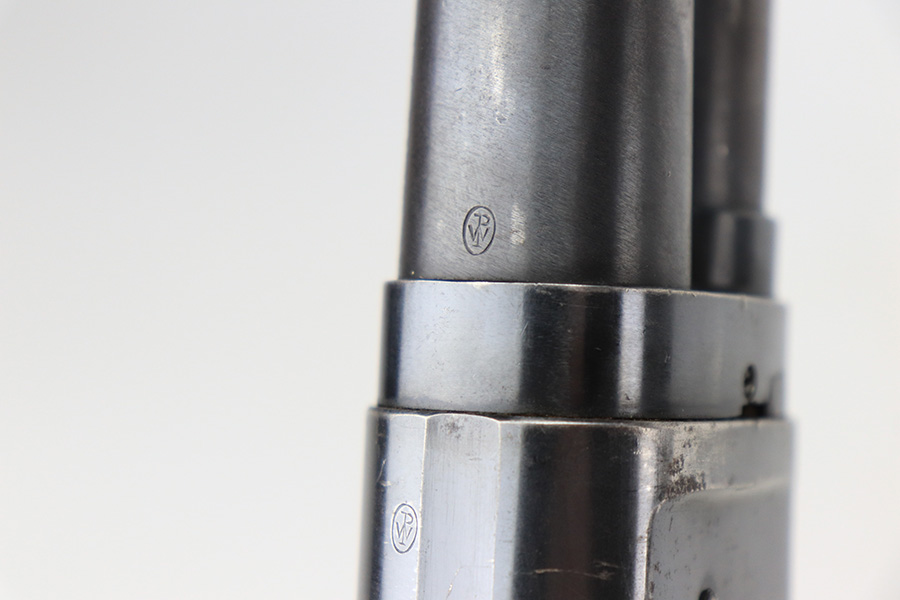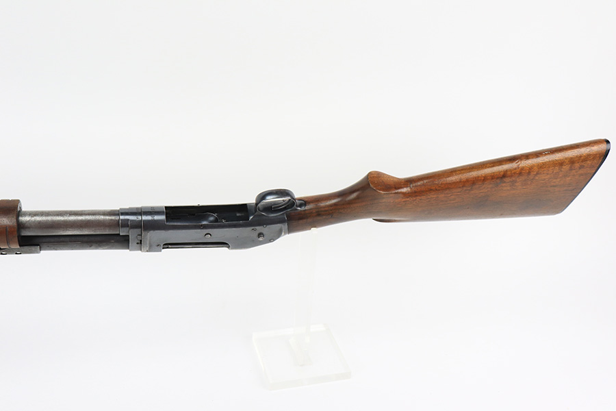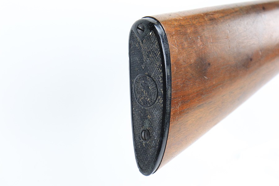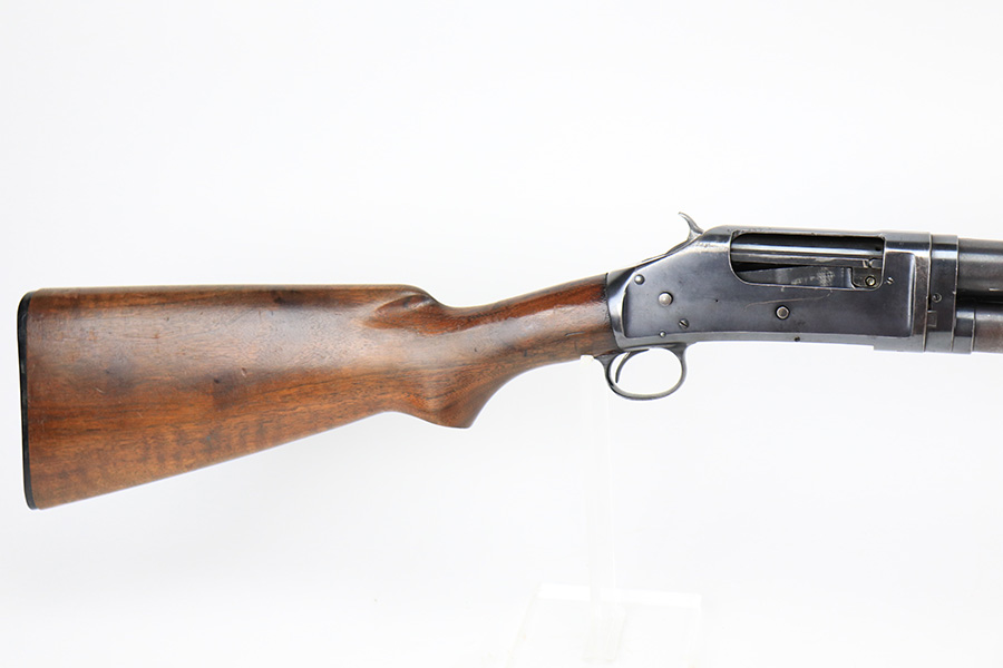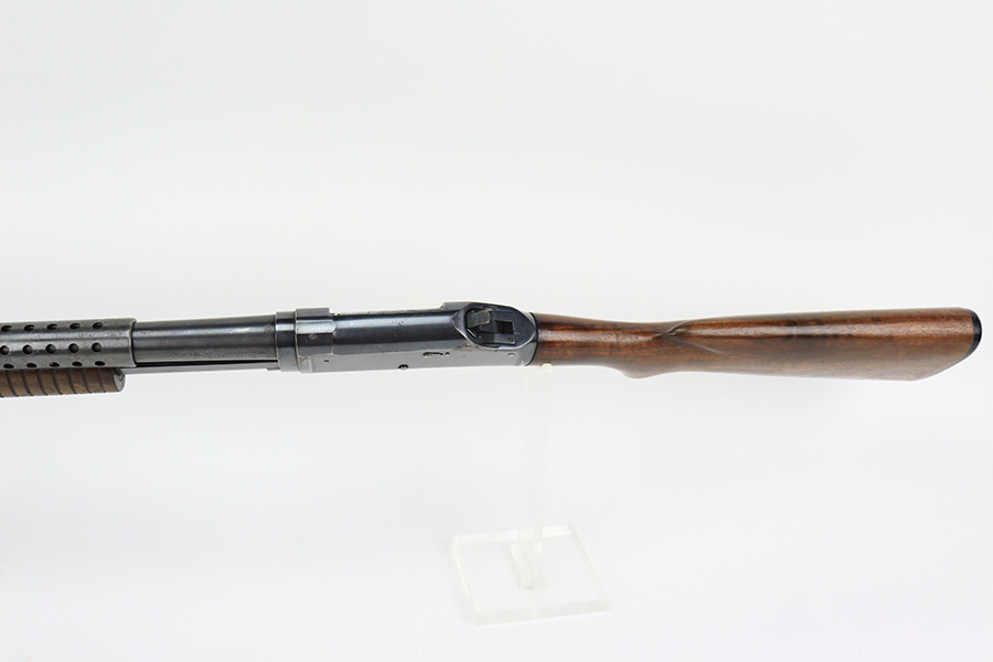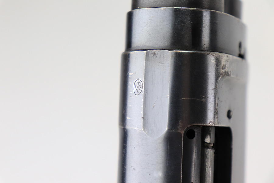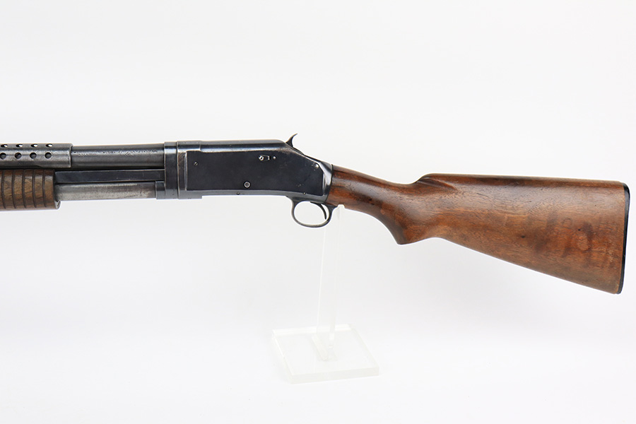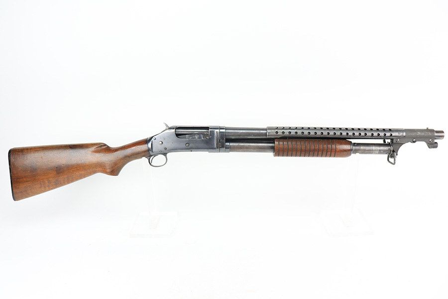 6/15/22 – This is a Winchester Model 97 shotgun from 1953 that has been modified to trench shotgun configuration. The bluing on the shotgun is original but shows edge wear on all the high points, and use wear on the magazine tube and barrel. The bayonet lug and heat shield attachment are a postwar addition and there’s some oxidation on the heat shield. The stock and forend show minor handling wear aside from a small area indented area on the wrist with a checkered pattern, not sure what caused this. The action is smooth and the bore is minty.